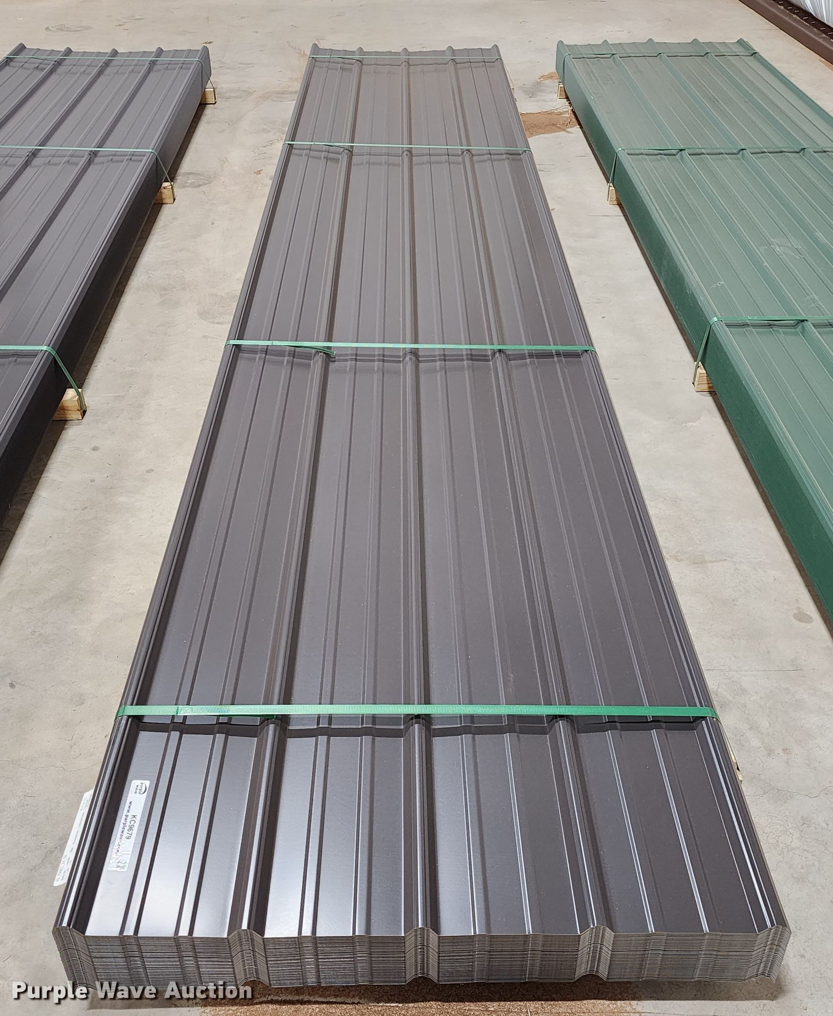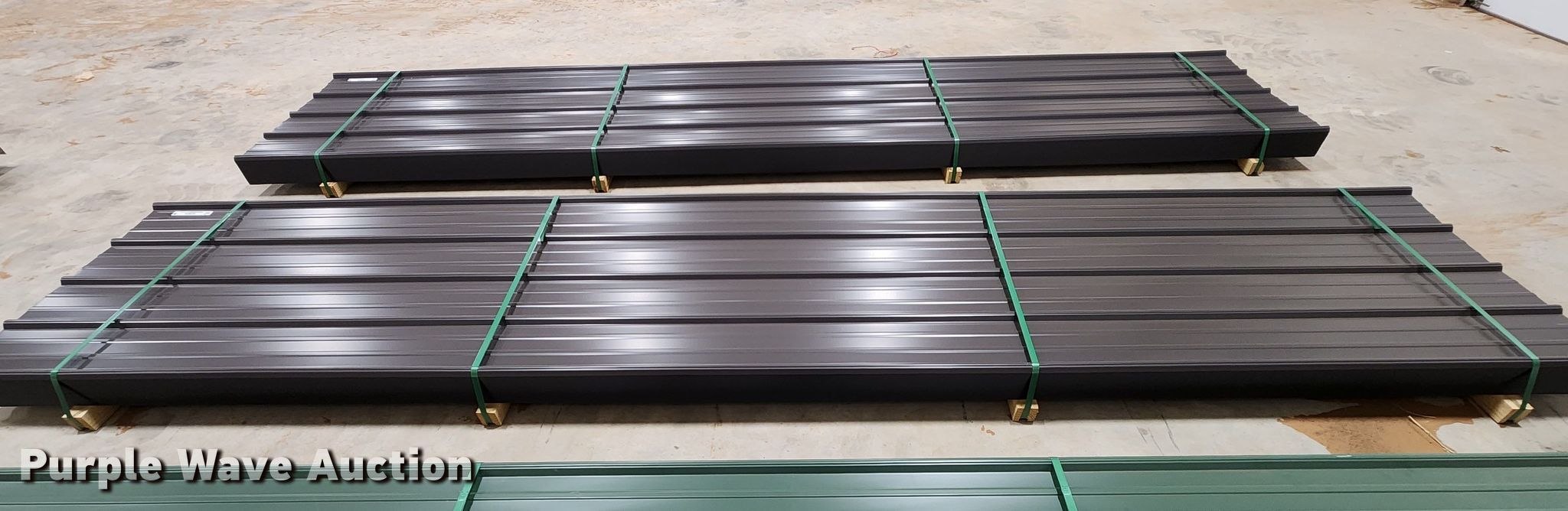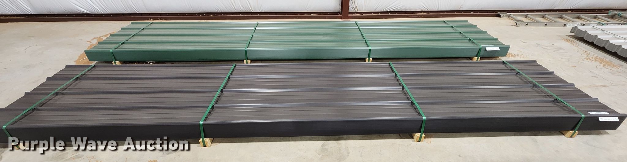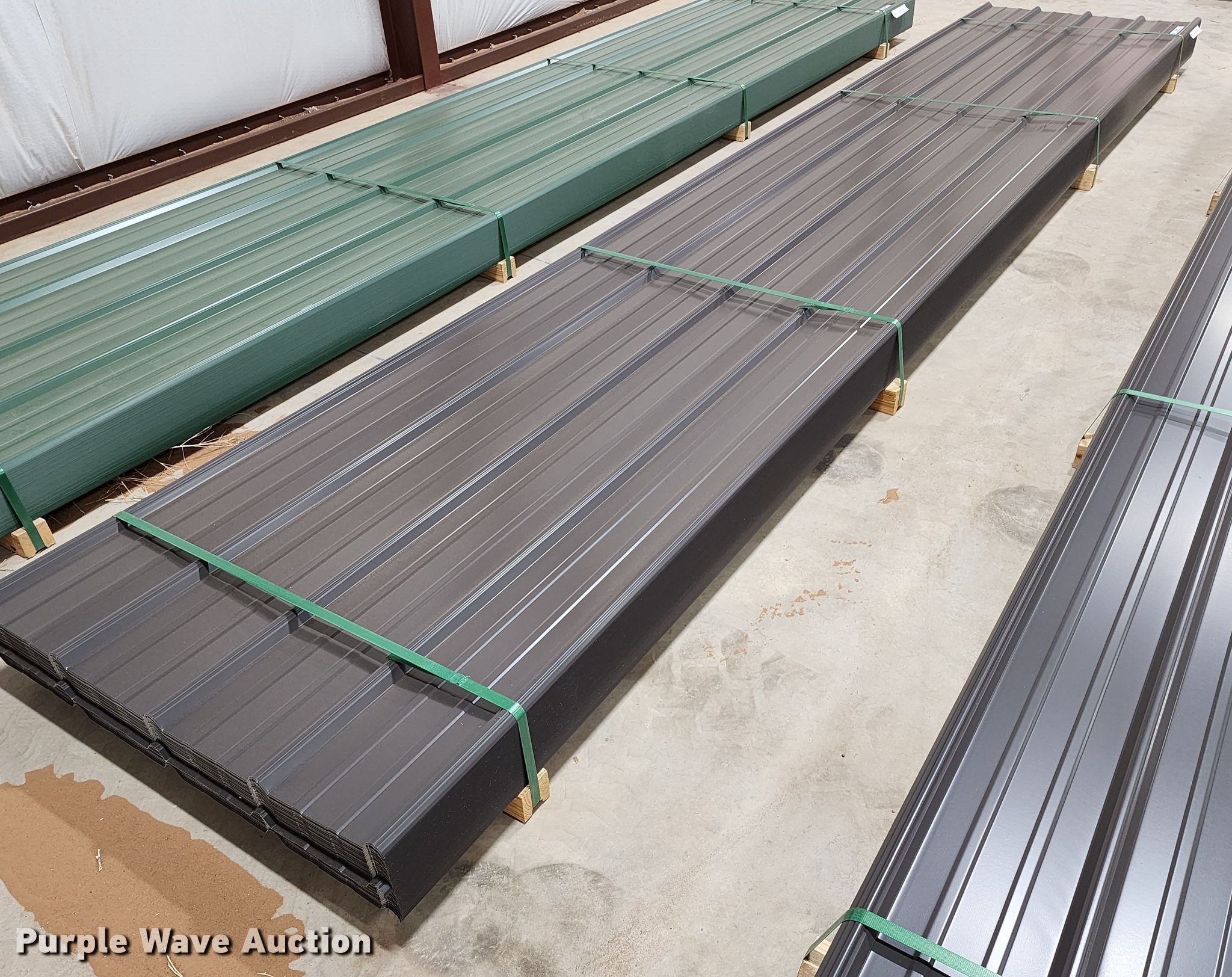 Purple Wave is selling a used Building Materials in Texas. This item is a (100) sheets of Doerksen Metal Components metal siding/roofing with the following: 16' L x 36" W overlap coverage, AG panel profile, 24 gauge, Color: Dark Bronze, Possible blemishes