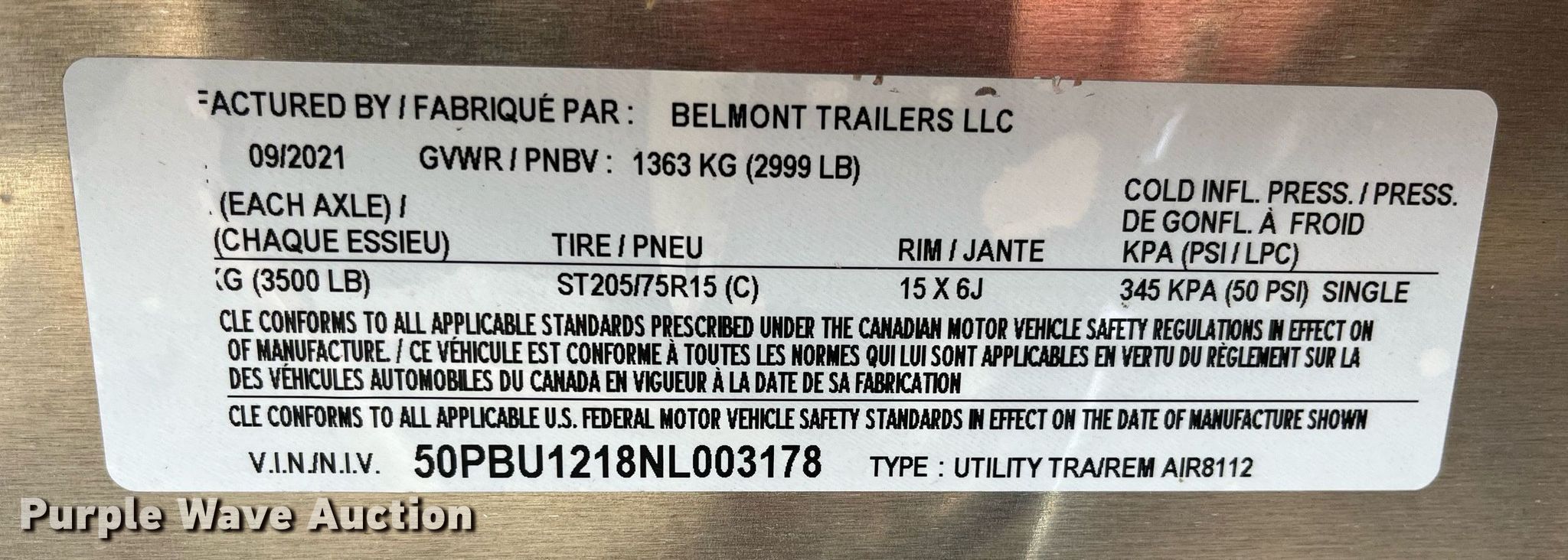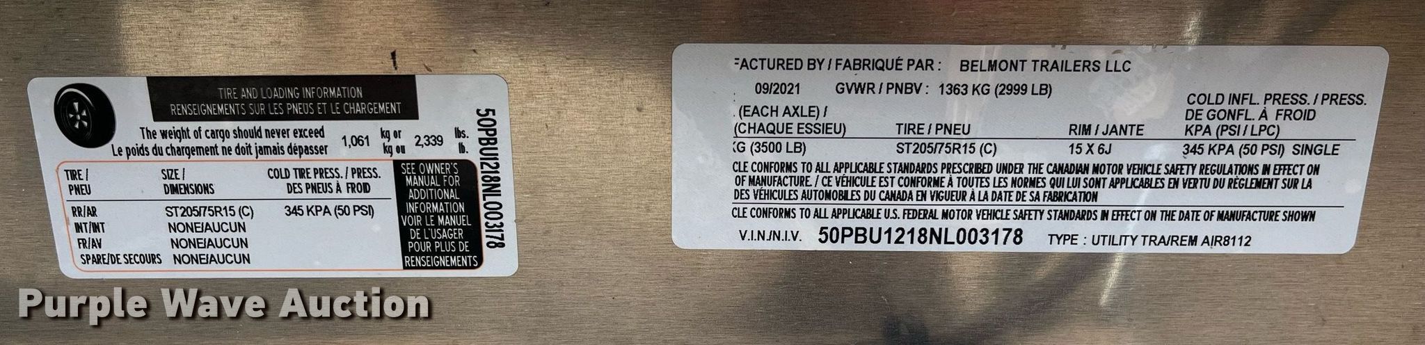 Purple Wave is selling a used Car or Utility Trailer in Missouri. This item is a 2022 Belmont AIR8112 utility trailer with the following: VIN: 50PBU1218NL003178