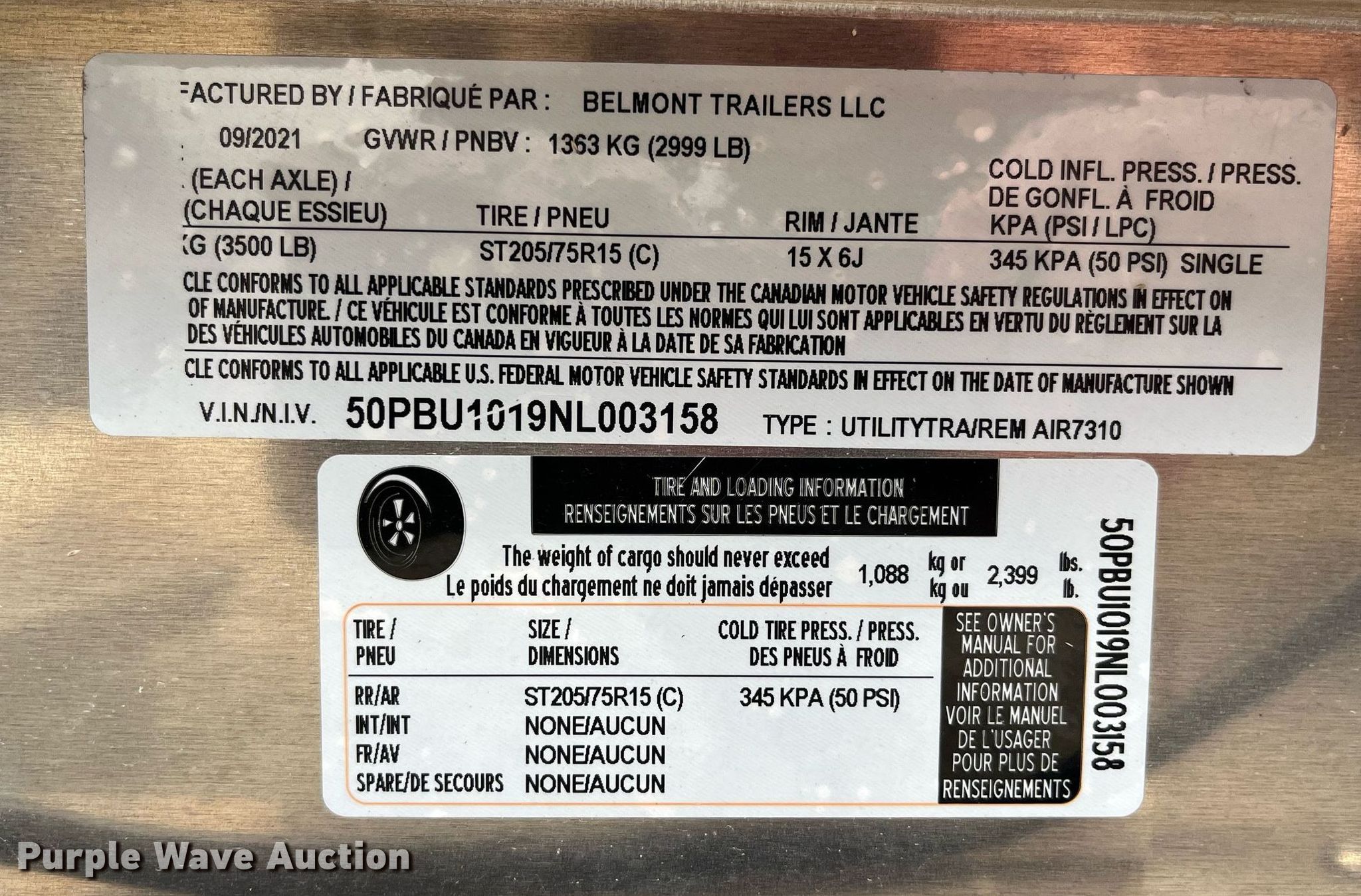 Purple Wave is selling a used Car or Utility Trailer in Missouri. This item is a 2022 Belmont AIR7310 utility trailer with the following: VIN: 50PBU1019NL003158