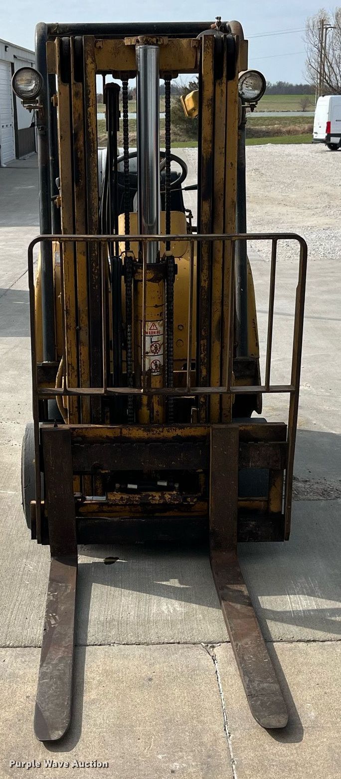 Caterpillar TC30 forklift. Hours: 1,567 on meter, Serial: 22Y02118. Engine Cylinders: 4, Fuel type: LPG LP bottle: Not included. Transmission Powershift. Operators station Canopy. Features Maximum lift capacity: 3,000 lbs, Maximum lift height: 156", Mast stages: 3, Side shift, Mast tilt, Fork length: 42". Tires Front: 18x7x12 1/8, Rear: 16 1/4x5x11 1/4, Solid. Notes Engine issues, one cylinder misses. Sugar Creek Enterprises. 1379 County Road 1305. Moberly, MO 65270