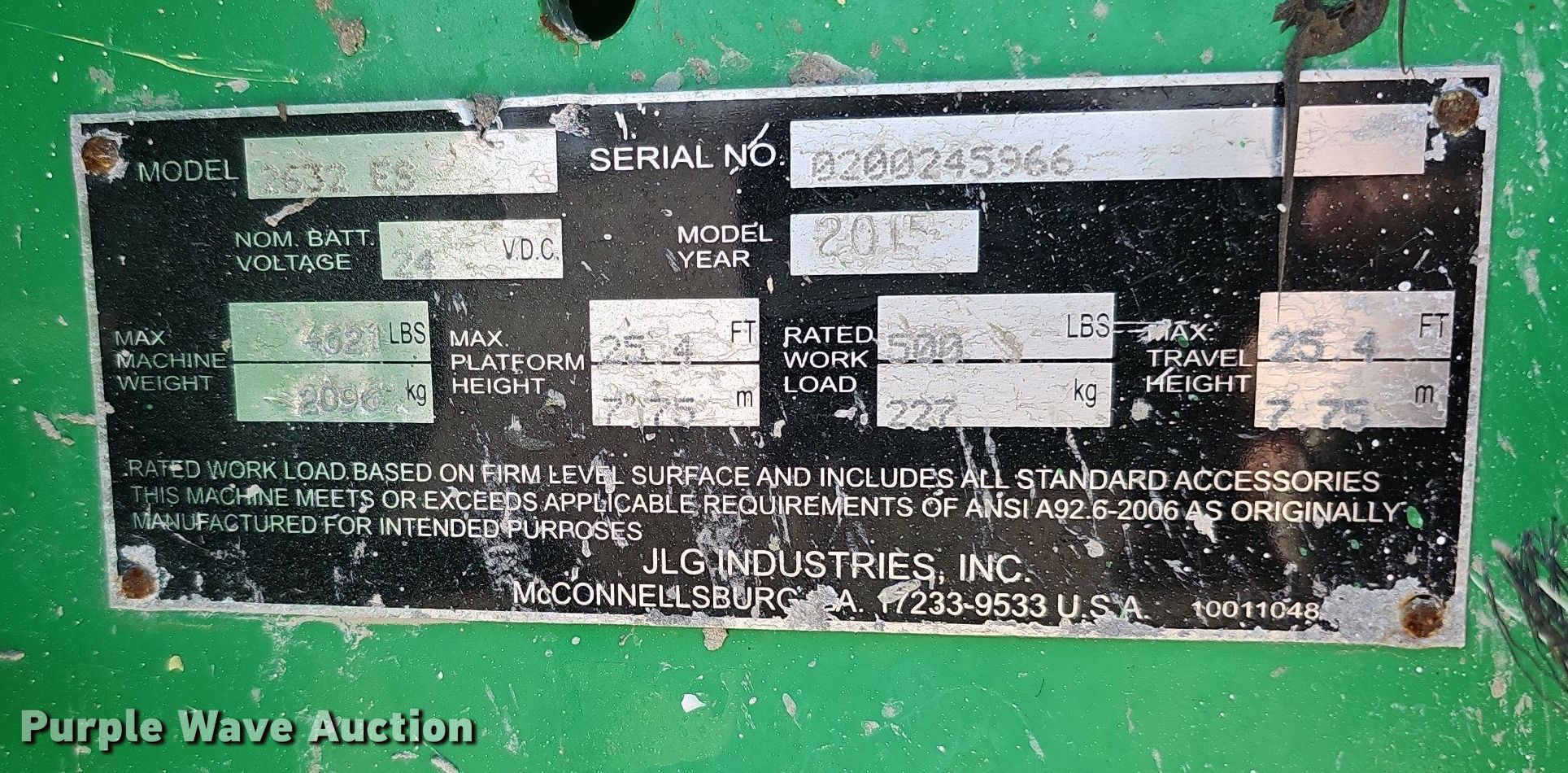 Purple Wave is selling a used Scissor or Vertical Lift in Nebraska. This item is a 2015 JLG 2632 ES vertical lift with the following: Hours: 397 on meter, Serial: 0200245966