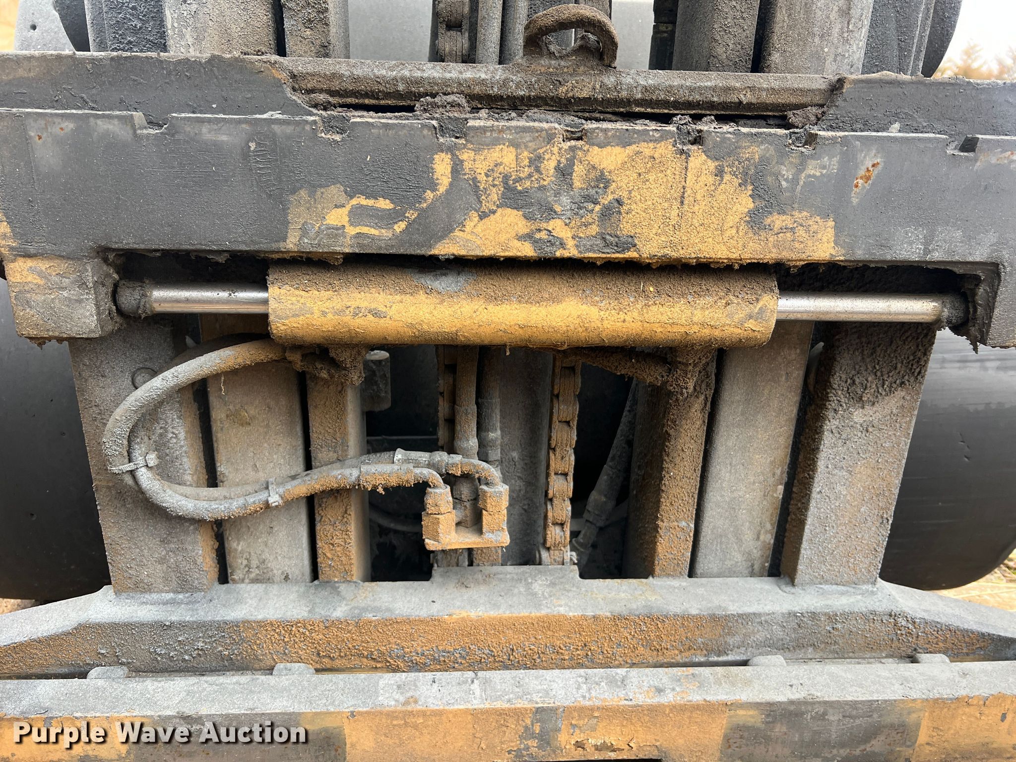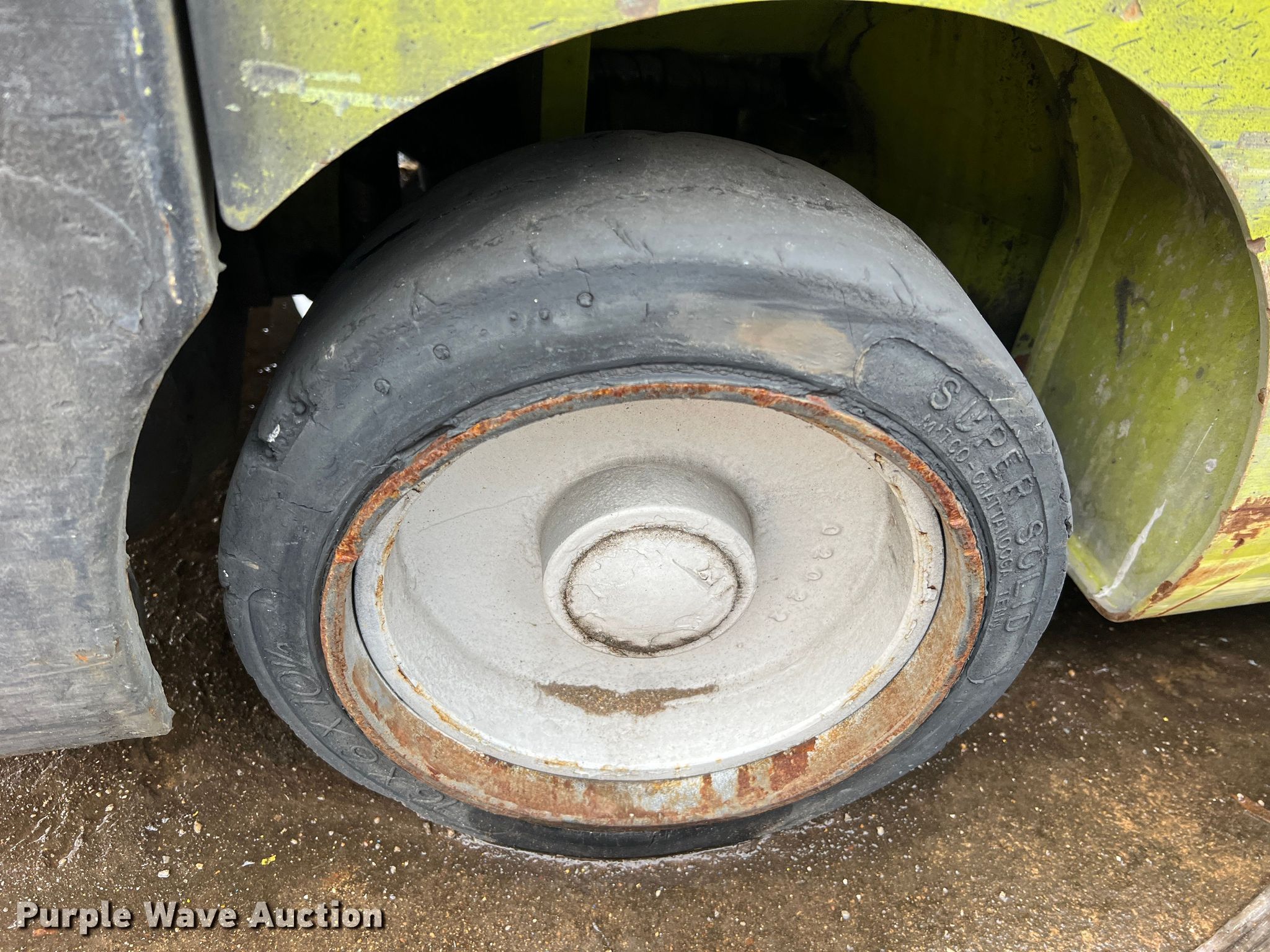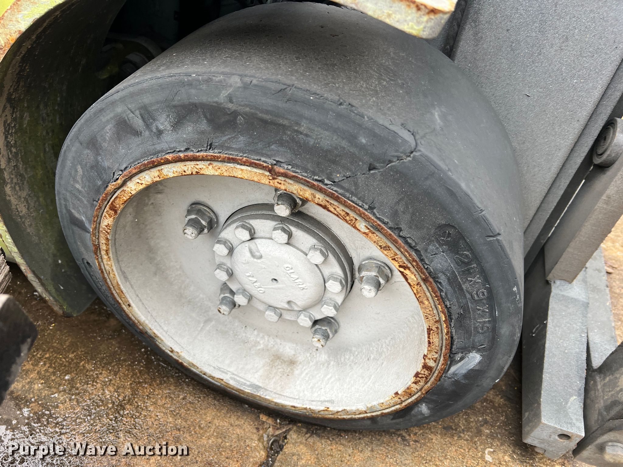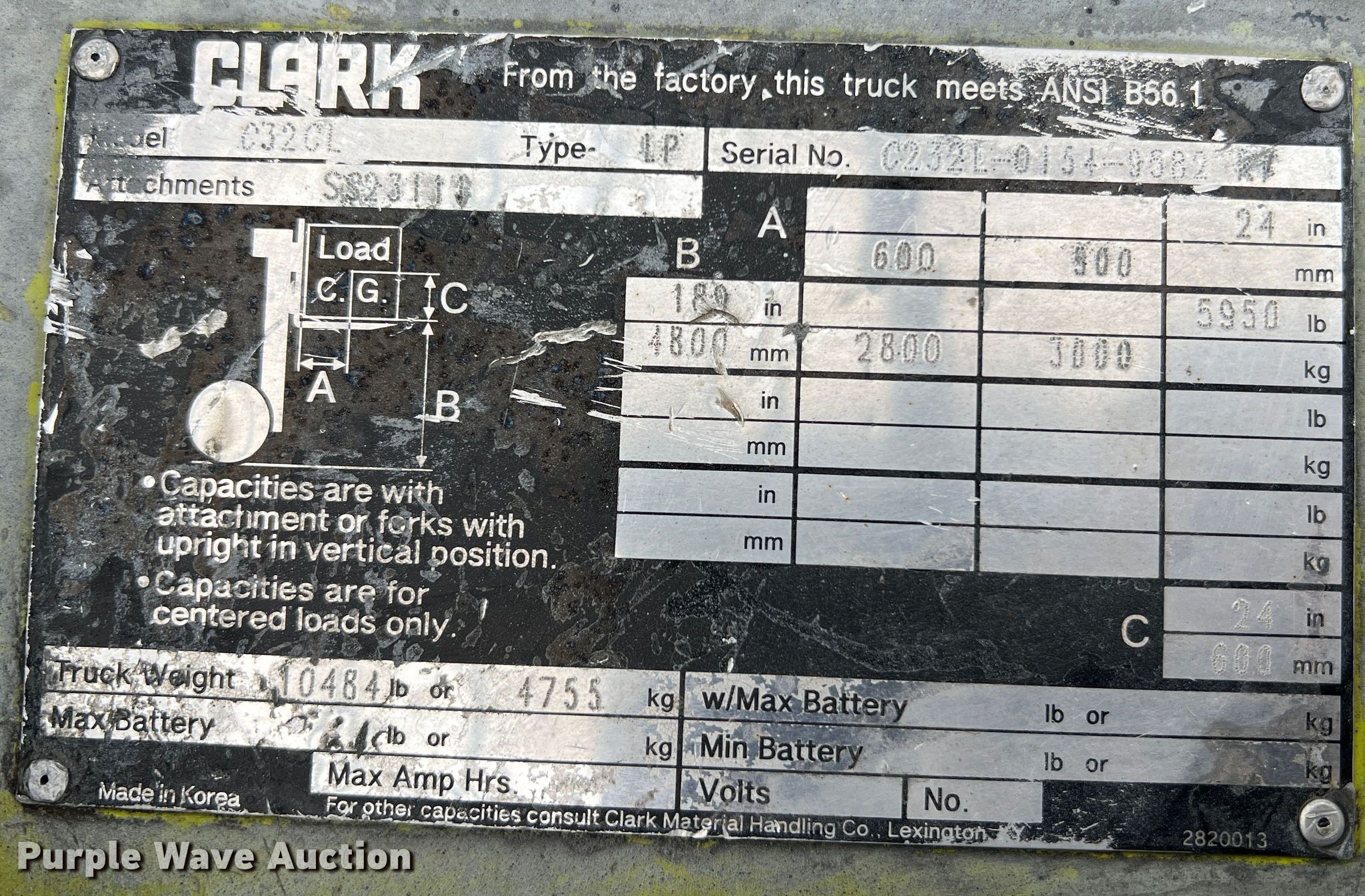 Clark C32CL forklift. Hours: Unknown, Serial: C232L-0154-9582RT. Engine Cylinders: 4, Fuel type: LPG LP bottle: Not included. Transmission Powershift. Operators station OROPS. Features Maximum lift capacity: 5,950 lbs, Maximum lift height: 189", Mast stages: 3, Side shift, Mast tilt. Tires Front: 21x9-15, Rear: 16x6x10.5, Solid, Non-marking. Notes Dead battery, Forks missing, Non-operational unit. Gardner Denver. 305 North State Fair Boulevard. Sedalia, MO 65301