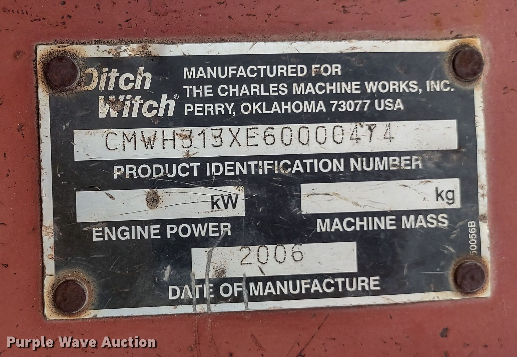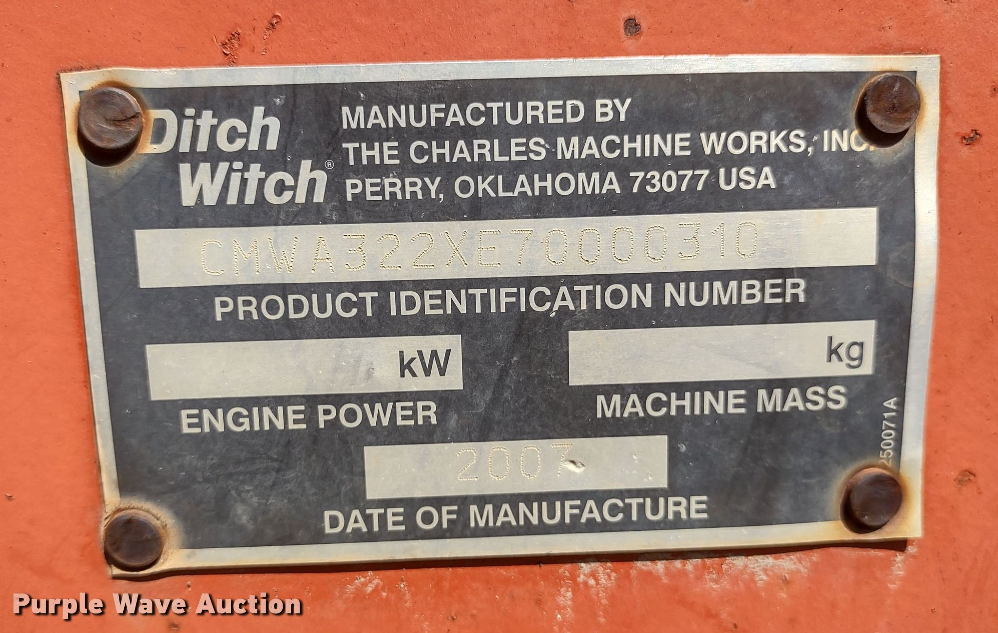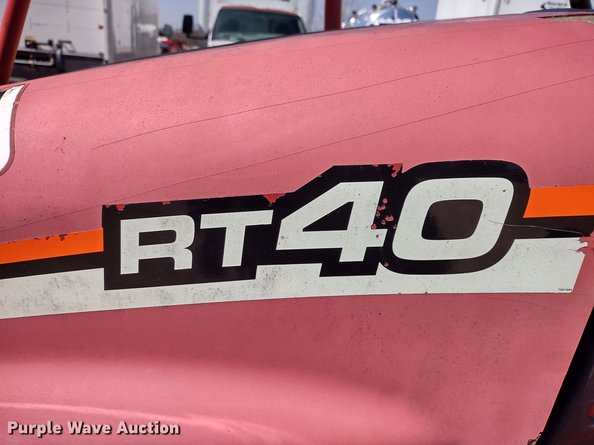 2007 Ditch Witch RT40 trencher. Hours: 1,723 on meter, Serial: CMWRT40XK70001562. Engine Deutz F 3M 2011, Cylinders: 3, Fuel type: Diesel. Transmission Hydrostatic, Four wheel drive. Operators station OROPS. Features Trencher Model: H313, Serial: CMWH313XE60000474, Estimated dig depth: 76", Backhoe Model: A322, Serial: CMWA322XE70000310, Bucket width: 18", Backfill blade Width: 64". Tires Size: 26x12.00-12NHS, Wheel weights. Gerken Rent-All. 31600 Old KC Rd. Paola, KS 66071