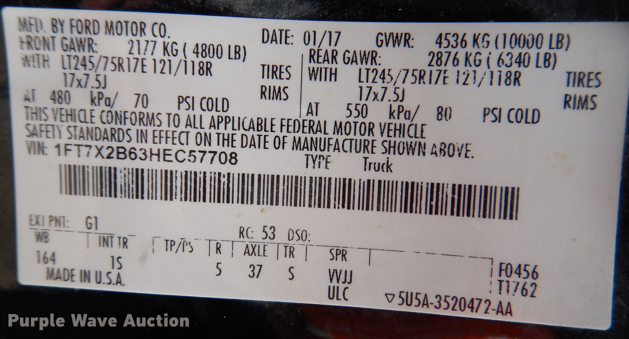 2017 Ford F250 Super Duty XL SuperCab pickup truck. Miles: 136,163 on odometer, VIN: 1FT7X2B63HEC57708, Unit #: T157. Engine Displacement: 6.2L V8 OHV, Cylinders: 8, Fuel type: Gas. Transmission Automatic, Four wheel drive. Interior AC, Heat, Heated mirrors, Power windows, Power locks, Cruise control. Features Hitch: Gooseneck, Auxiliary fuel tank. Tires Size: LT245/75R17. Iowa title. Title distribution may be delayed up to 14 days from verification of funds. Absolute Group Company. 1201 W. 6th Ave. Slater, IA 50244