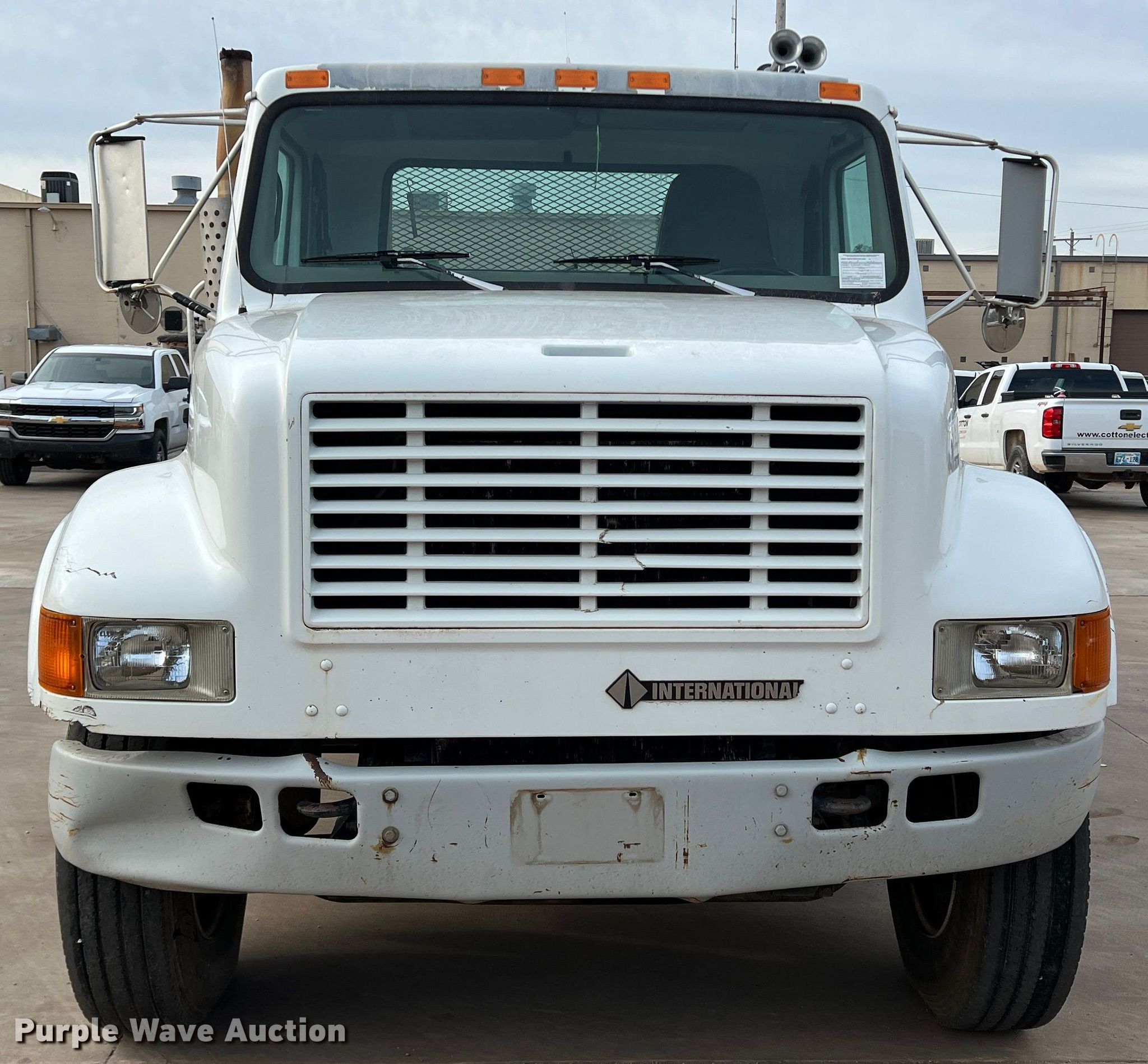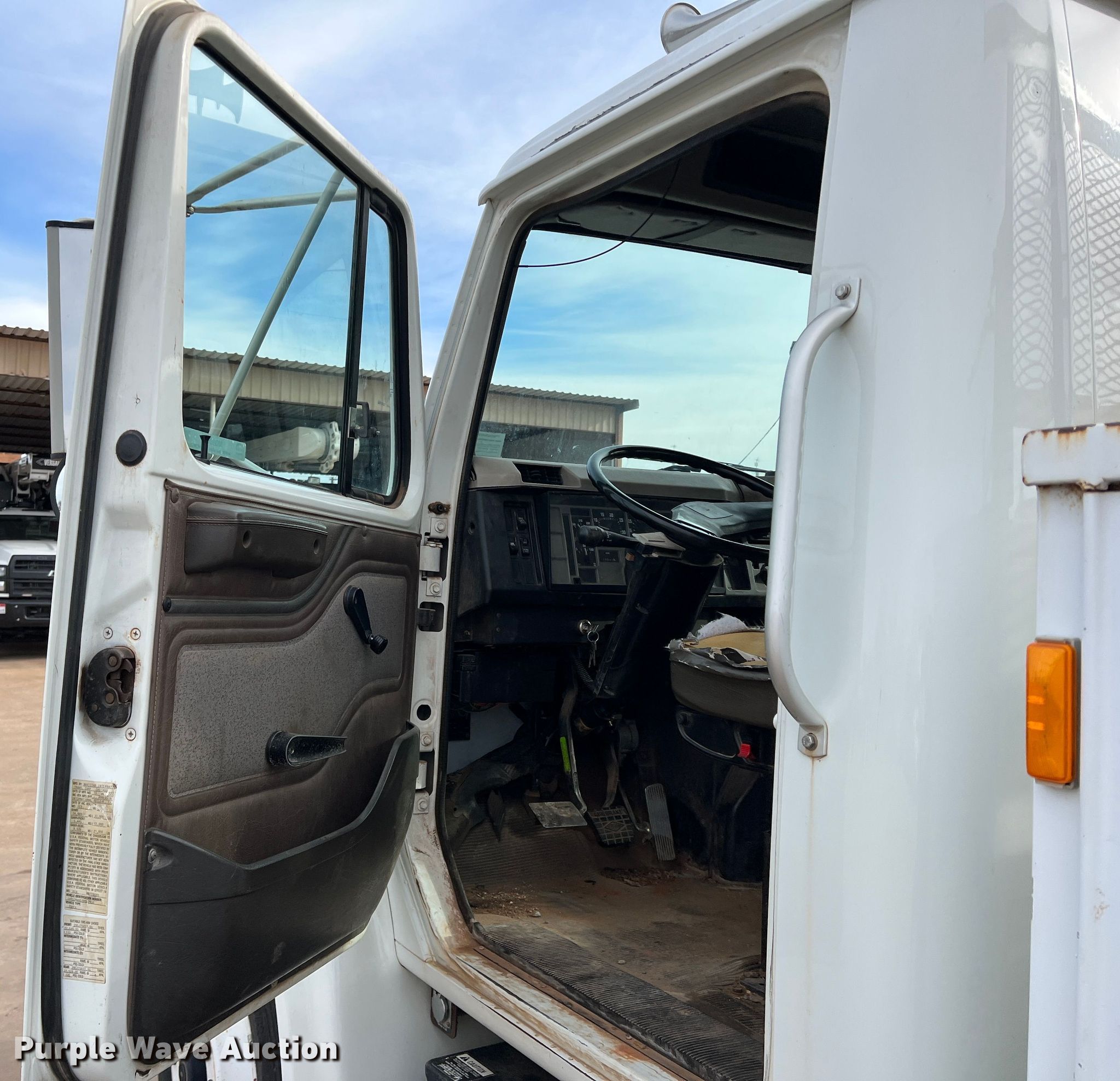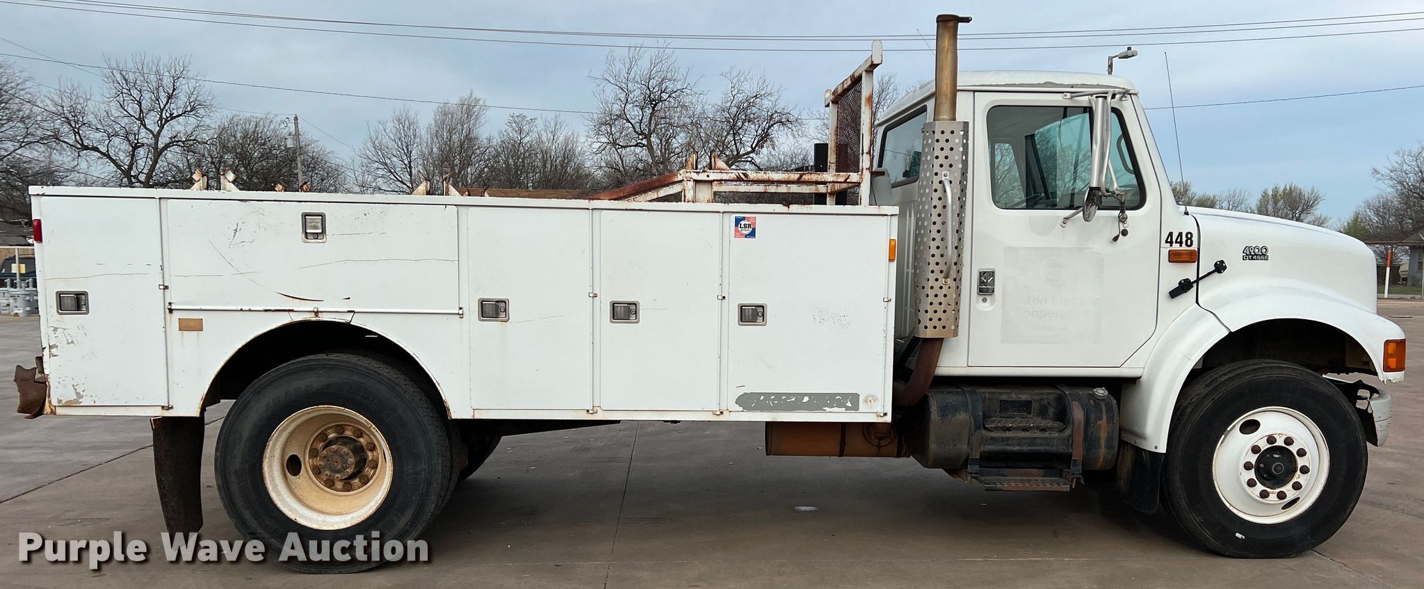 2001 International 4900 utility / service truck. Miles: 197,229 on odometer, Hours: 9,541 on meter, VIN: 1HTSDAAN51H387938, Unit #: 448. Engine Cylinders: 6, Fuel type: Diesel. Transmission Eaton Fuller, Manual, Speed: 8. Chassis Axles: Single, Suspension: Spring, Brakes: Air. Interior AC, Heat, Heated mirrors, Cruise control. Features Bed 13' L x 8' W. Tires Size: 11R22.5. Notes Intermittent dash illumination issues Possible wiring issues. Oklahoma title. Title distribution may be delayed up to 14 days from verification of funds. Cotton Electric COOP. 226 Broadway. Walters, OK 73572