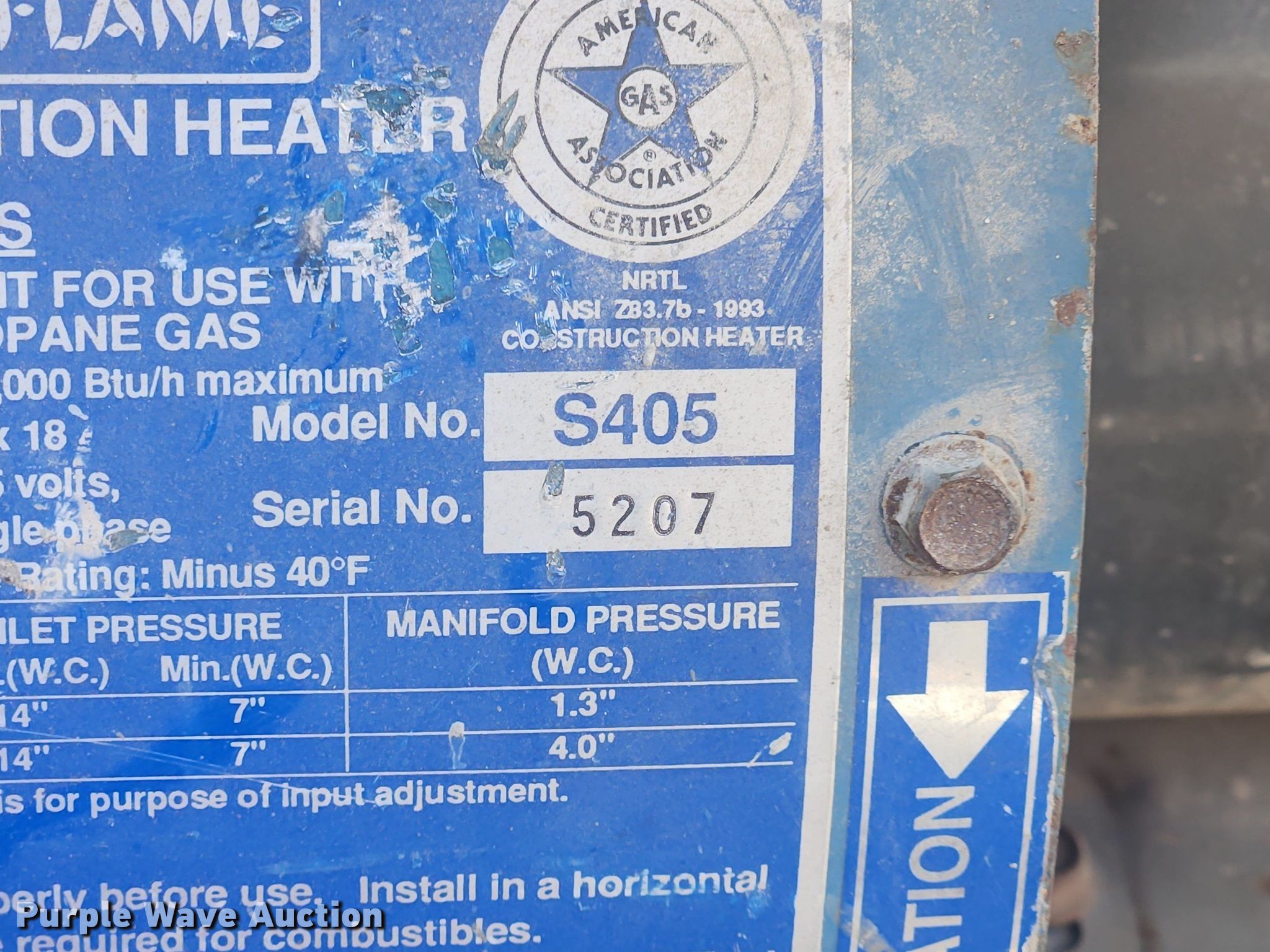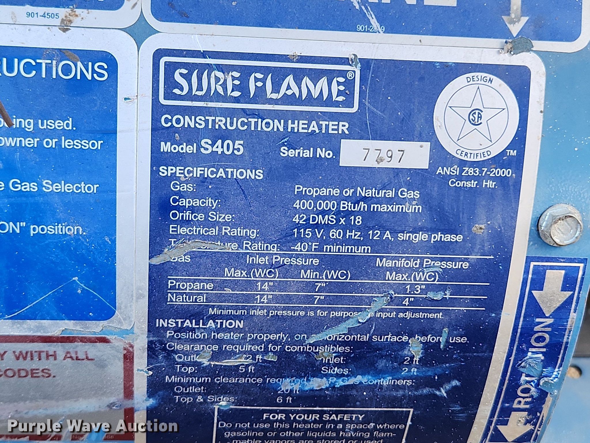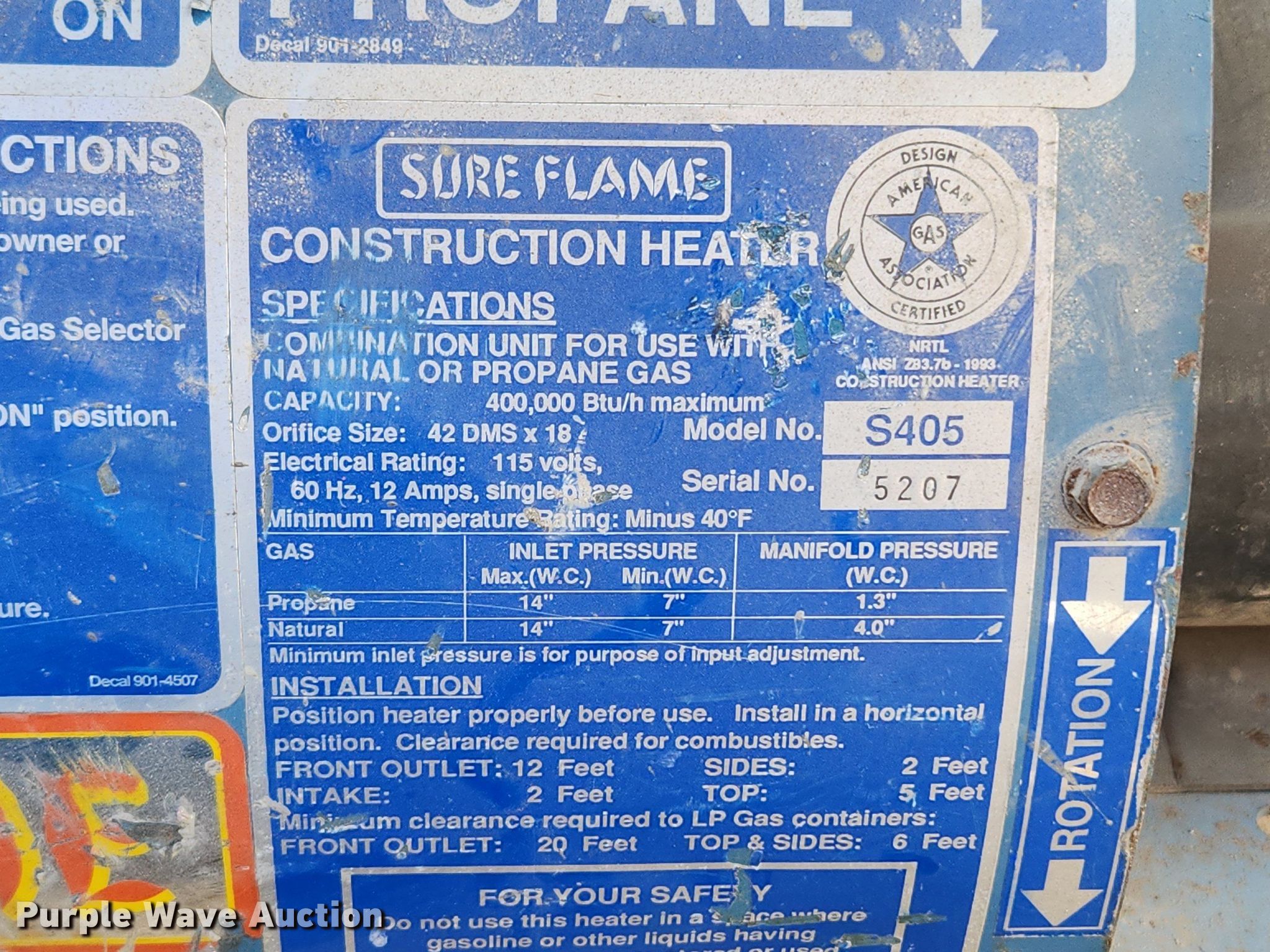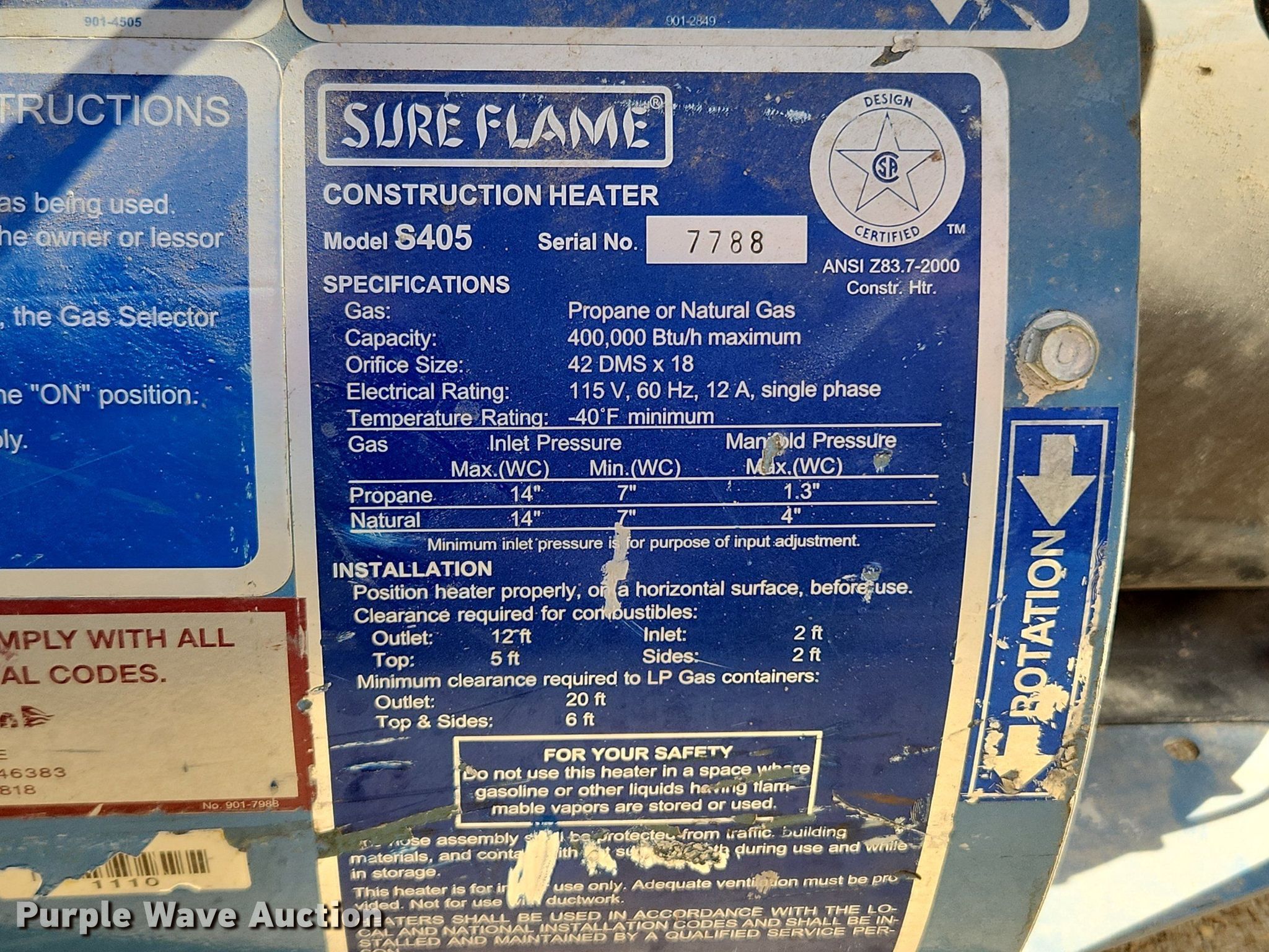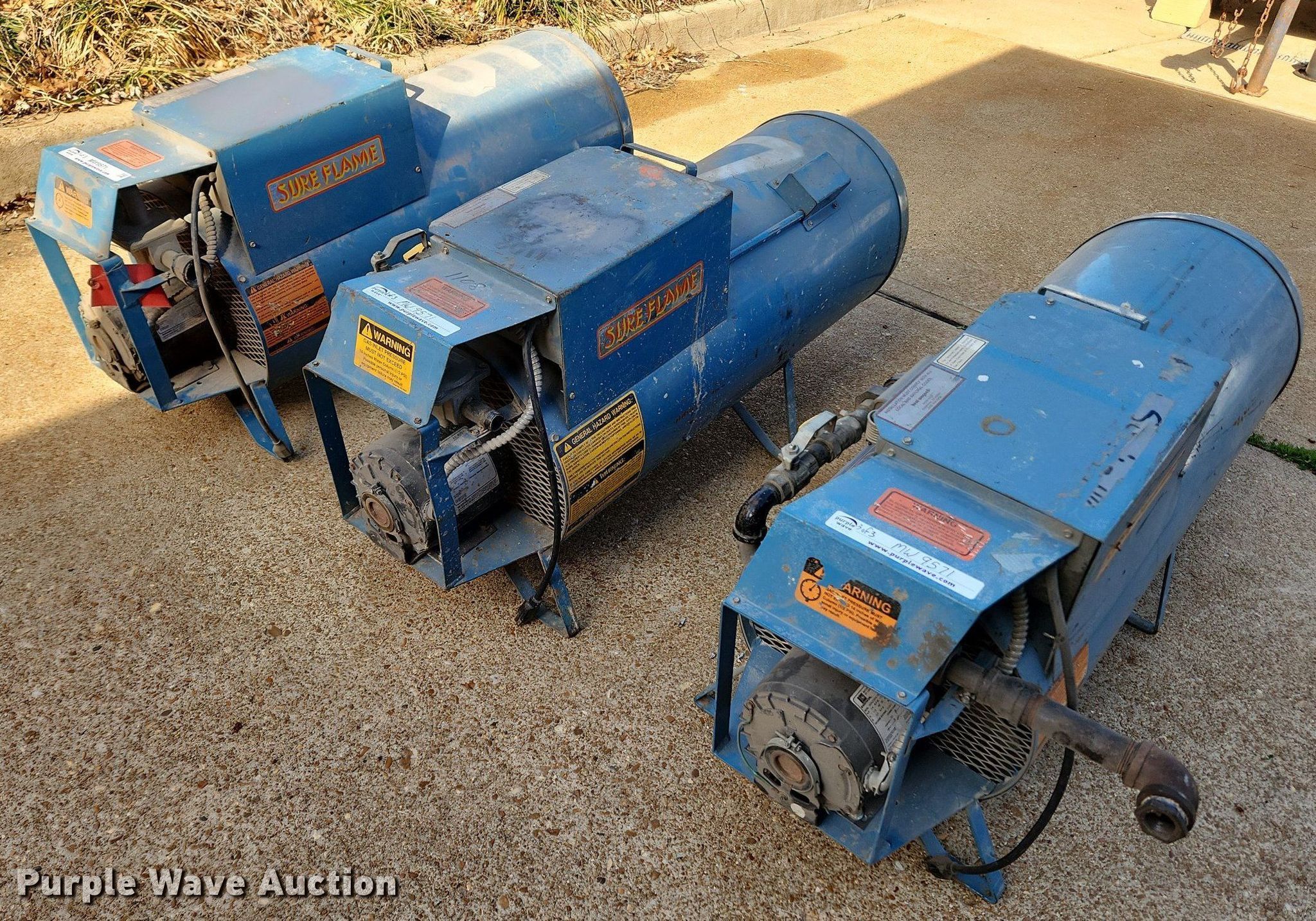 (3) Sure Flame S405 heaters. Features. Volts: 115, Phase: Single, BTU: 400,000, Fuel type: LPG. Notes One unit unknown operating condition , One non-operational unit. Mike's Equipment Repair. St. Louis, MO 63146