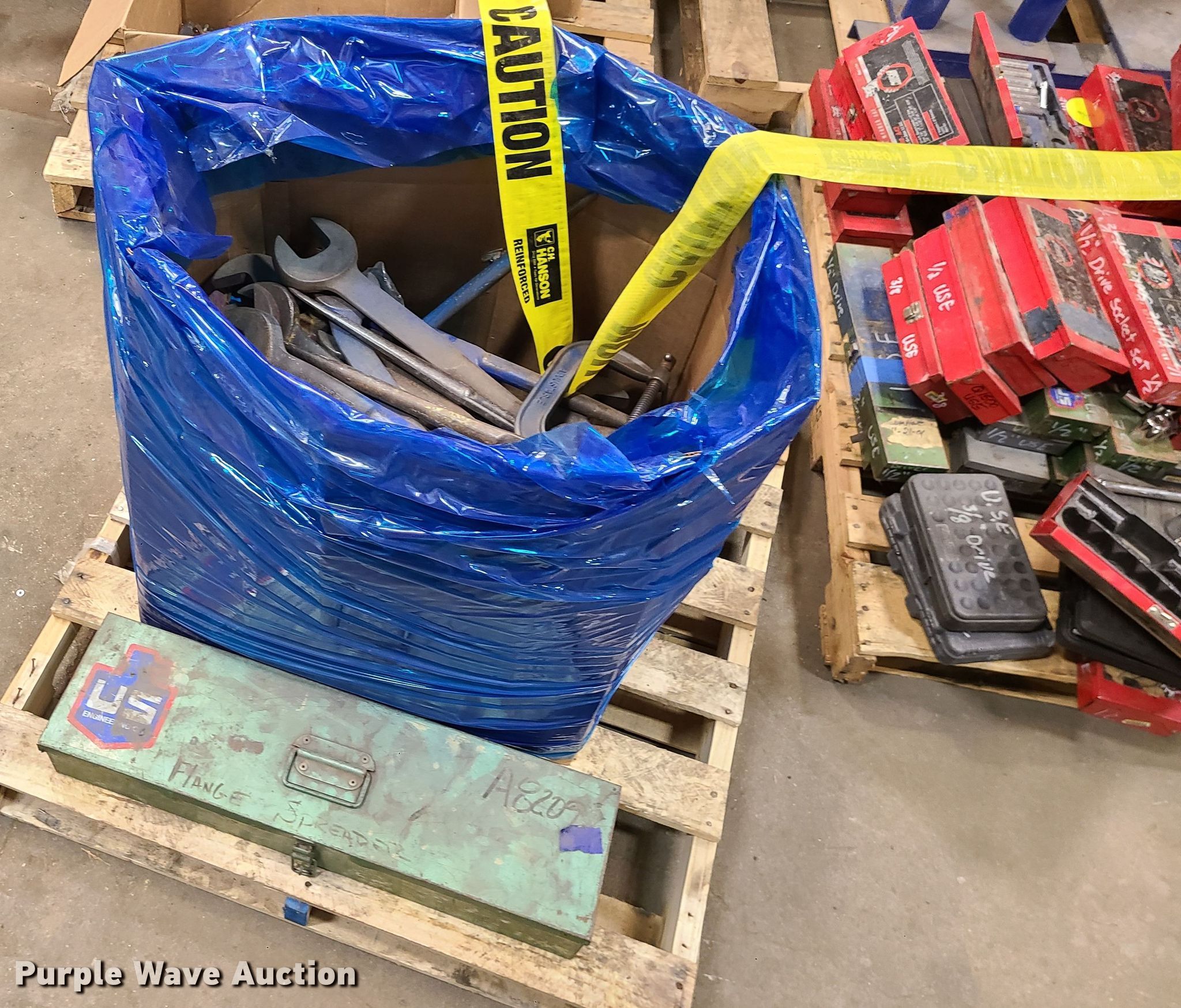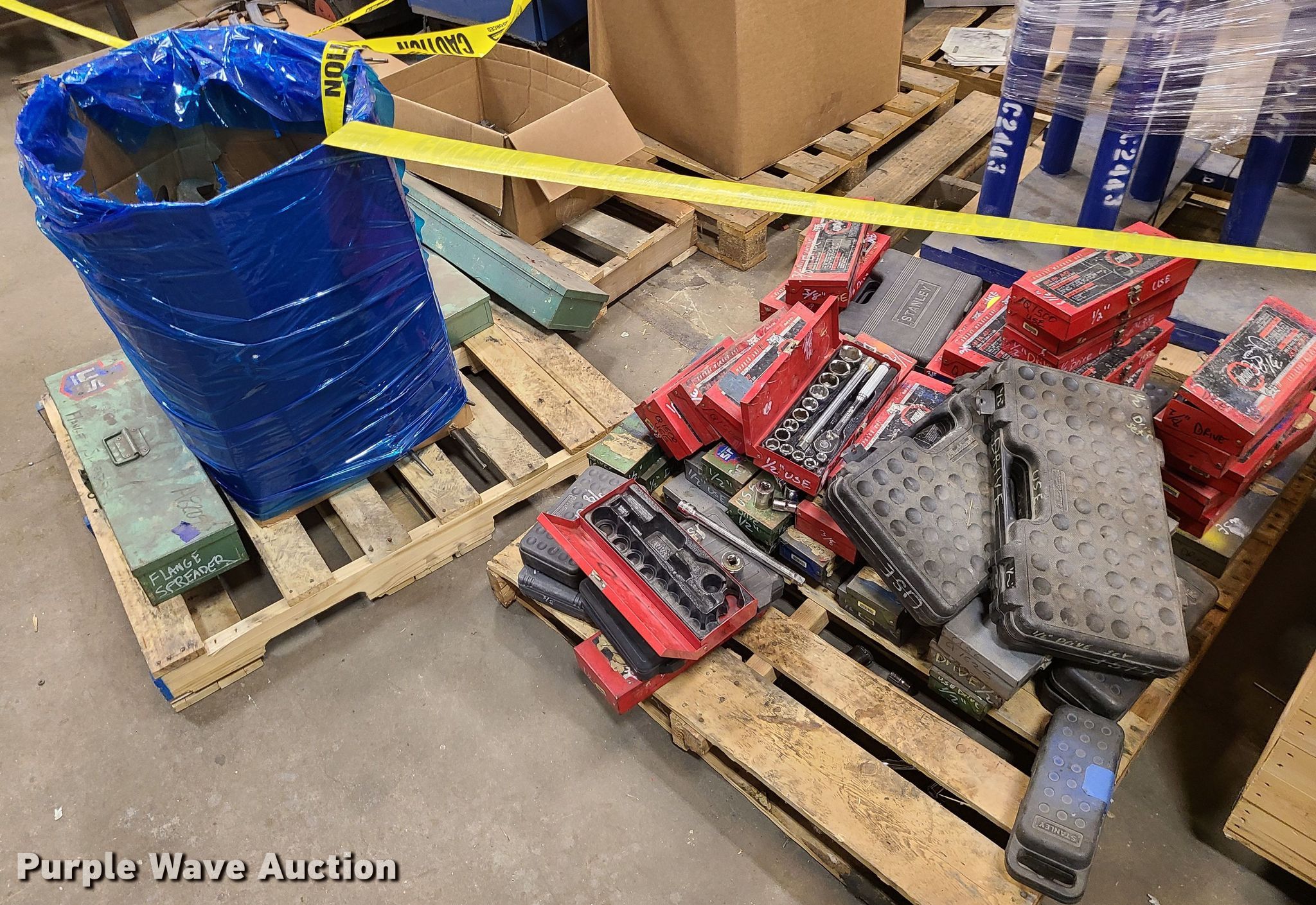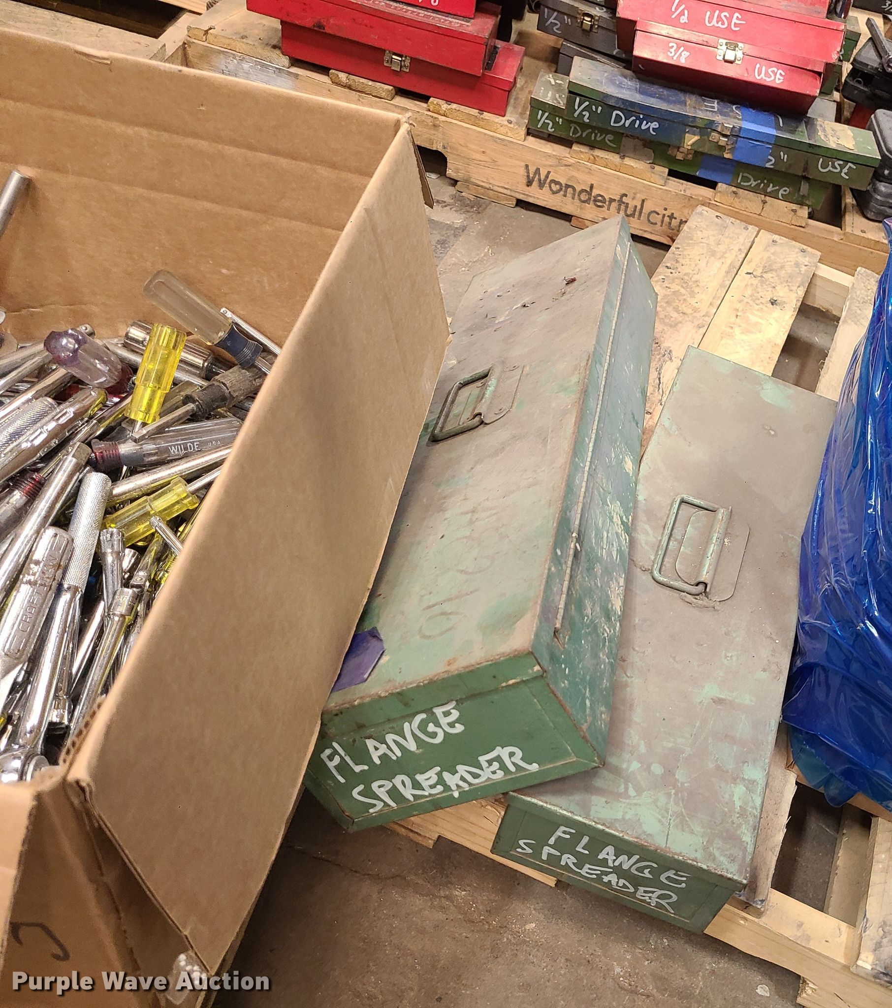Purple Wave is selling a used Tools in Missouri. This item is a Tools with the following: Wrenches, Sockets, Socket sets, Parts may be missing, Flange spreader, 55 gallon drum stand