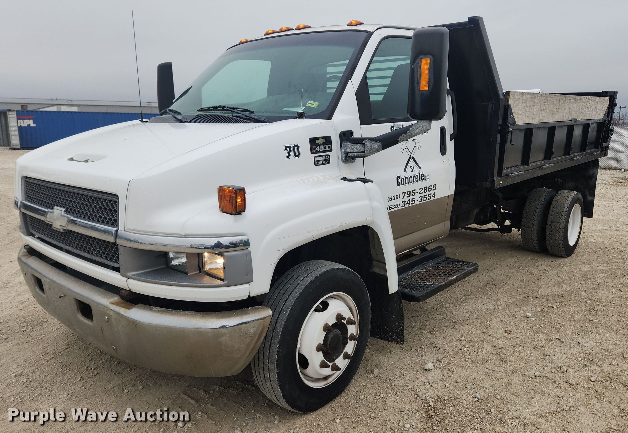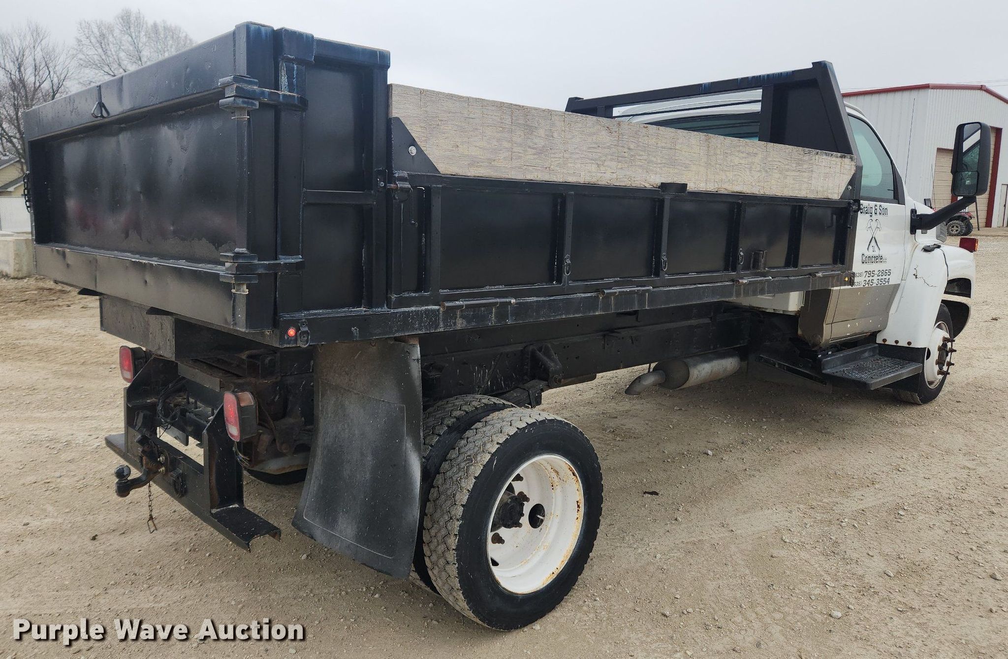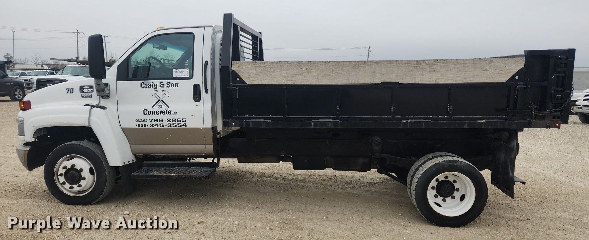 2003 Chevrolet C4500 dump flatbed truck. Miles: 112,399 on odometer, VIN: 1GBE4E1183F509628. Engine GM, Displacement: 6.6L, Cylinders: 8, Fuel type: Diesel. Transmission Automatic. Chassis Axles: Single, Suspension: Spring, Brakes: Hydraulic, GVWR: 16,500 lbs, Wheelbase: 176". Interior AC, Heat, Heated mirrors, Power windows, Power locks, Cruise control, Brake controller. Features Dump flatbed 12' L x 96" W, Side height: 16", Side board height: 10", Removable sides, Ram: Single. Tires Size: 225/70R19.5. Notes Dash warning indicator: Check engine, Non-operational passenger door handle. Kansas title. Craig and Son Concrete. 585 Edinger Rd. Wentzville, MO 63385