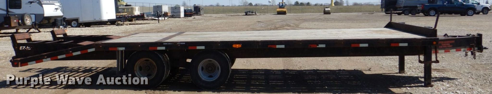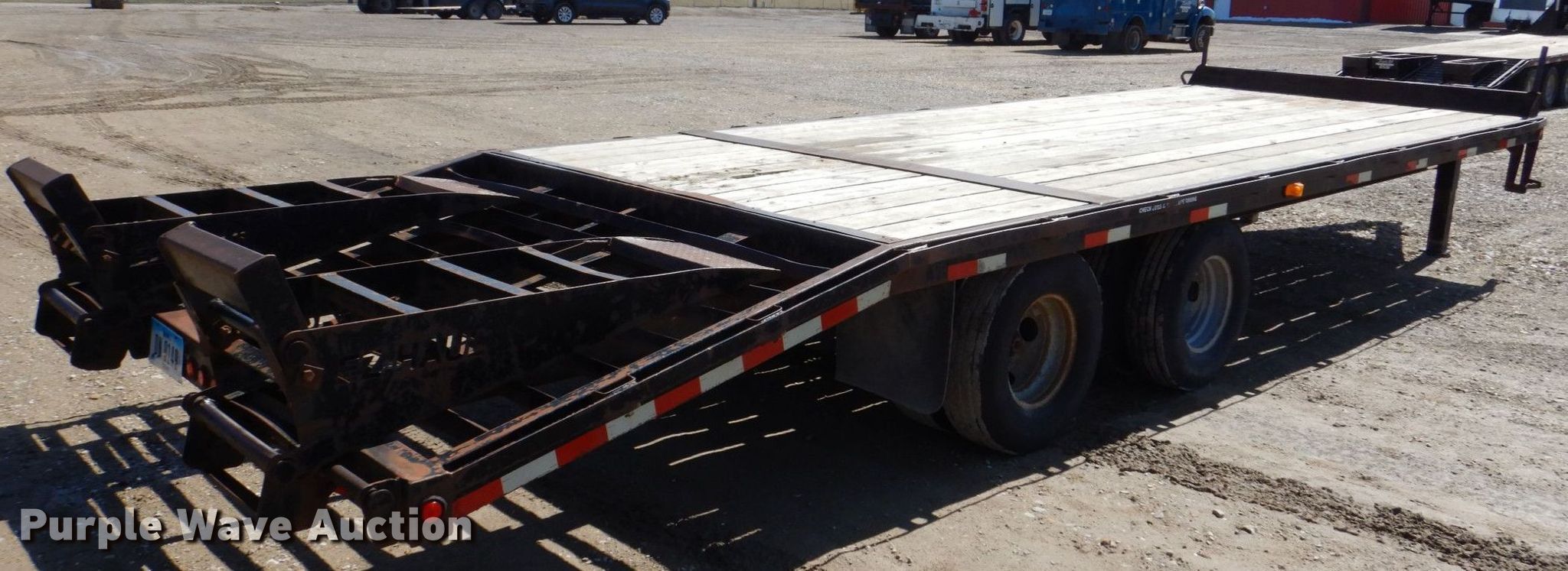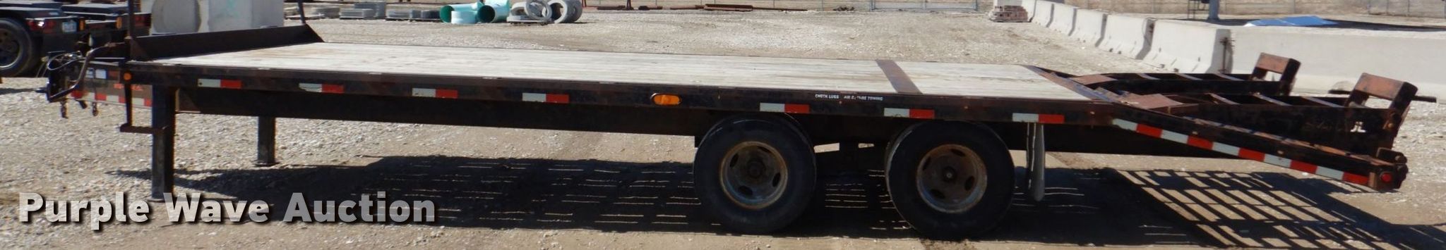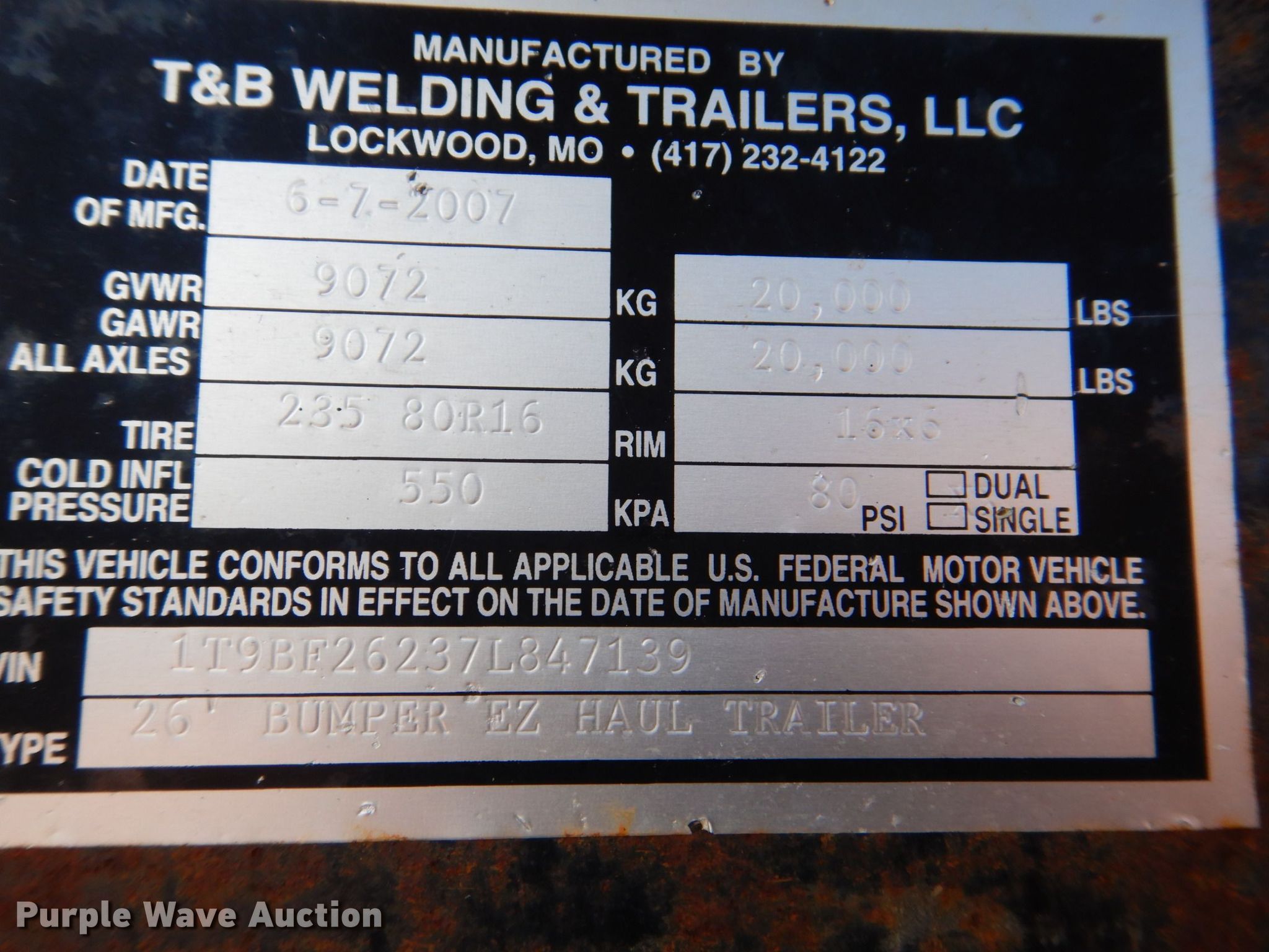 2007 T & B equipment trailer. VIN: 1T9BF26237L847139. Dimensions Overall: 32' 4" L x 8' 6" W, Deck: 21' L x 8' W, Deck height: 3', Tail length: 5' 6", Ramps: Manual Length: 5'. Features Deck type: Wood. Chassis Hitch: Pintle, Landing gear: Dual, Suspension: Walking beam, Brakes: Electric, Axles: Tandem, GVWR: 20,000 lbs. Tires Steel wheels, Size: 235/85R16. Notes Contents not included. Iowa title. Title distribution may be delayed up to 14 days from verification of funds. Triple B Construction Corp.. 710 Ayres Progress Dr. Wilton, IA 52778