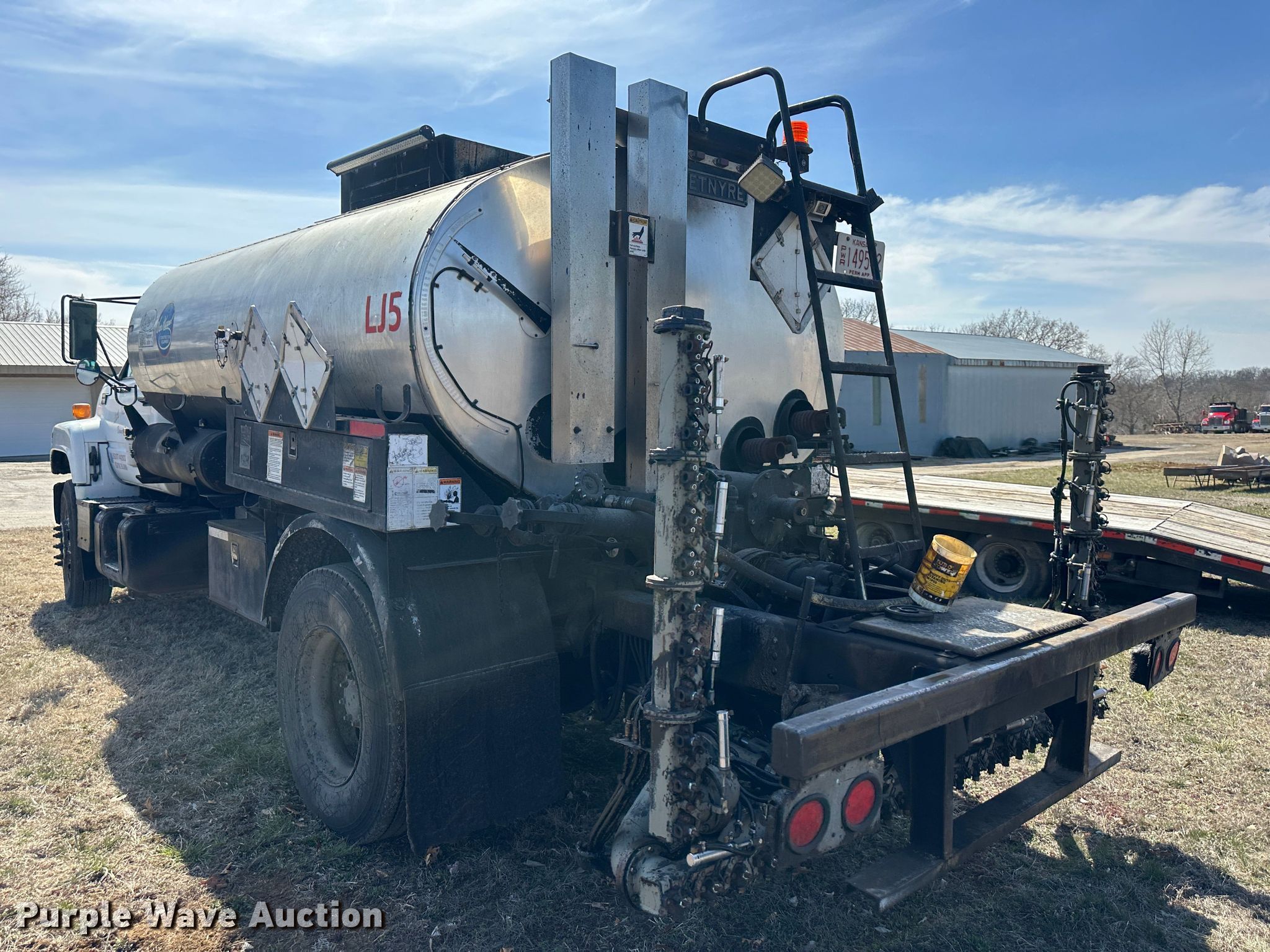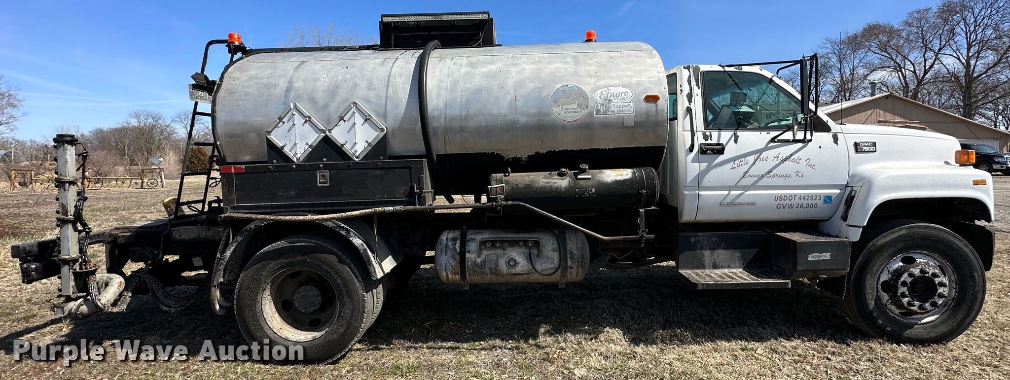 1998 GMC C7500 oil distributor truck. Miles: 210,423 on odometer, VIN: 1GDM7H1C6WJ520500. Engine Caterpillar 3126, Displacement: 7.2L, Cylinders: 6, Fuel type: Diesel. Transmission Manual, Speed: 5, plus 2. Chassis Axles: Single, Suspension: Spring, Brakes: Air, Front mount PTO, GVWR: 26,000 lbs. Interior AC, Heat. Features Bed / tank Etnyre Black-Topper II series 2000, Capacity: 2,000 gallons, 12' L x 96" W, Burner: LPG, In-cab controls, Spray wand, Spray boom Width: 16', Folding, Nozzles: 25.. Tires Size: 11R22.5. View repairs. Kansas title. Little Joe's Asphalt. Bonner Springs, KS 66012