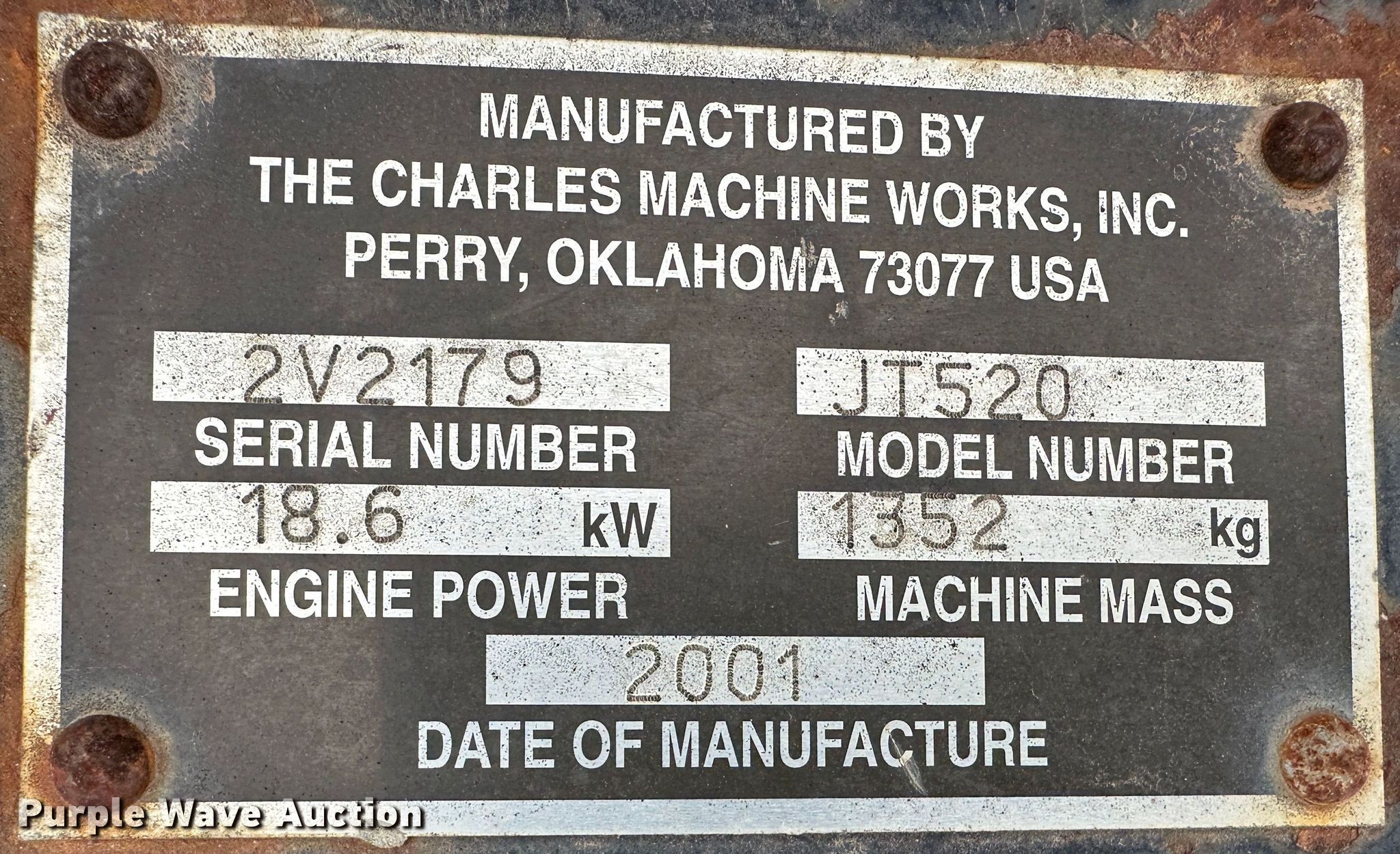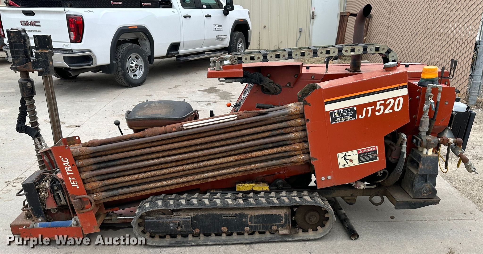 2001 Ditch Witch JT520 directional boring unit. Hours: 2,132 on meter, Serial: 2V2179. Engine Kubota, Displacement: 1.5L, Cylinders: 3, Fuel type: Diesel. Features Bean A0413C, GPM: 9, Drill bit width: 3", Drill stems On drill: 36, Drill stem length: 5' Diameter: 1", Rear hydraulic stabilizers, Hydraulic stake down. Tracks Width: 7", Rubber. Larson Construction, Inc.. Manhattan, KS 66502
