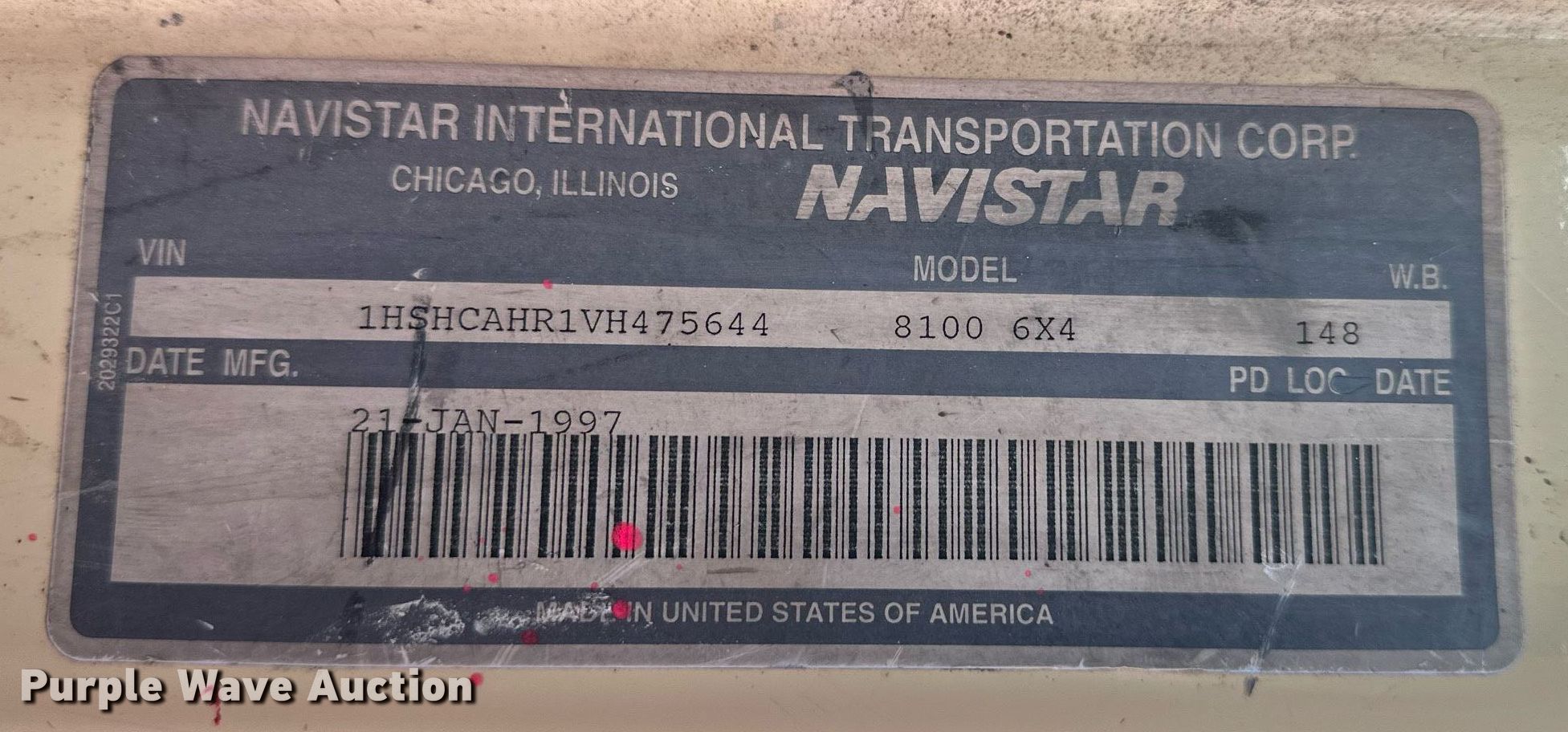1997 International 8100 water truck. Miles: 376,554 on odometer, VIN: 1HSHCAHR1VH475644. Engine Cummins M11, Displacement: 10.8L, Cylinders: 6, Fuel type: Diesel. Transmission International , Manual, Speed: 9. Chassis Axles: Tandem, Differential lock: Inter-axle, Suspension: Spring, Brakes: Air, PTO. Interior Heat, Cruise control. Features Bed / tank EMI, 14' L x 96" W, Spray bar: Front, Rear, Side discharge, Top fill, Rear drain: 3", Rear outlet: 4". Tires Size: 11R22.5. Missouri title. Title distribution may be delayed up to 14 days from verification of funds. 4600 State Highway Y. Cleveland, MO 64734
