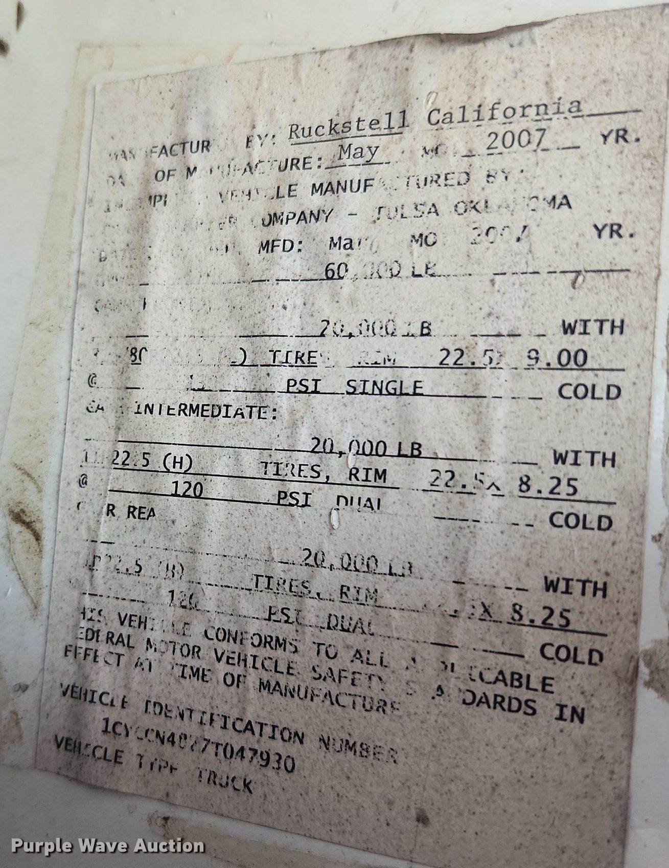 2007 Crane Carrier Low Entry dump truck. Miles: 52,529 on odometer, Hours: 3,468 on meter, VIN: 1CYCCN4827T047930. Engine John Deere, Displacement: 8.1L, Cylinders: 6, Fuel type: CNG. Transmission Allison, Automatic. Chassis Double frame, Axles: Tandem, Differential lock: Inter-axle, Suspension: Spring over walking beam, Brakes: Air, PTO, GVWR: 60,000 lbs FAWR: 20,000 lbs, IAWR: 20,000 lbs, RAWR: 20,000 lbs, Wheelbase: 165". Interior AC, Heat, Power windows, Brake controller. Features Dump bed Galion-Godwin 530FT-14, 14' L x 96" W, Side height: 33", Side board height: 11", Bed type: Steel, Ram: Single , End gate: Air operated. Tires Front: 315/80R22.5, Rear: 11R22.5. Notes Windshield chipped or cracked, Missing passenger window. Illinois title. Title distribution may be delayed up to 14 days from verification of funds. Zade LLC. East St. Louis, IL 62205