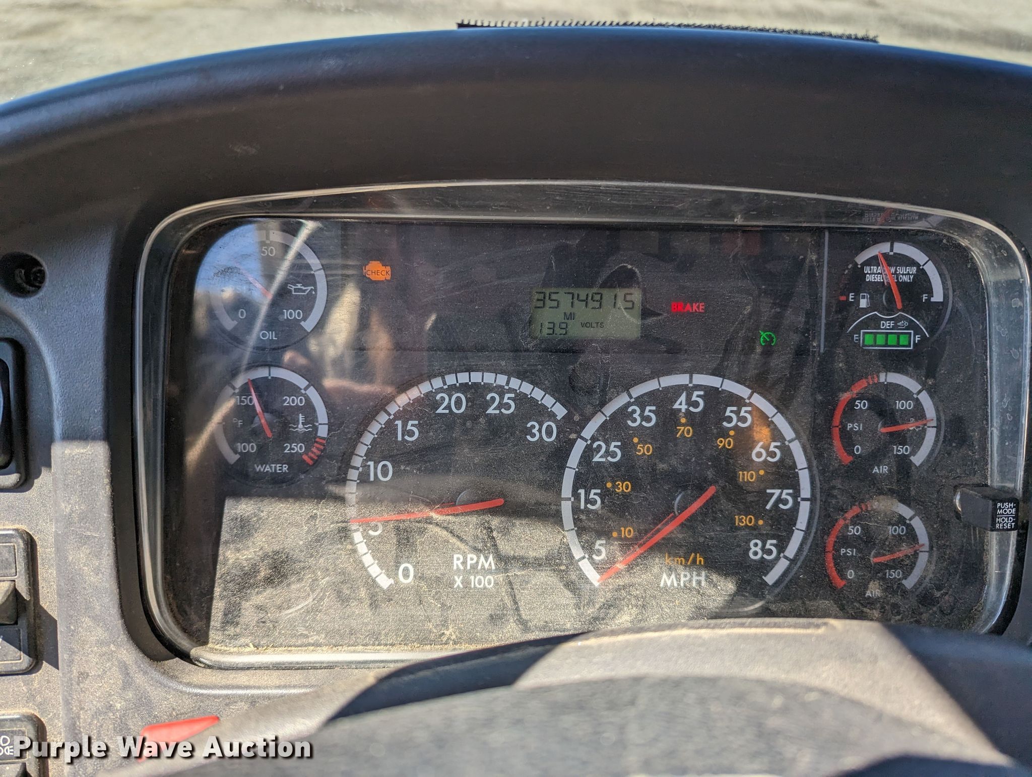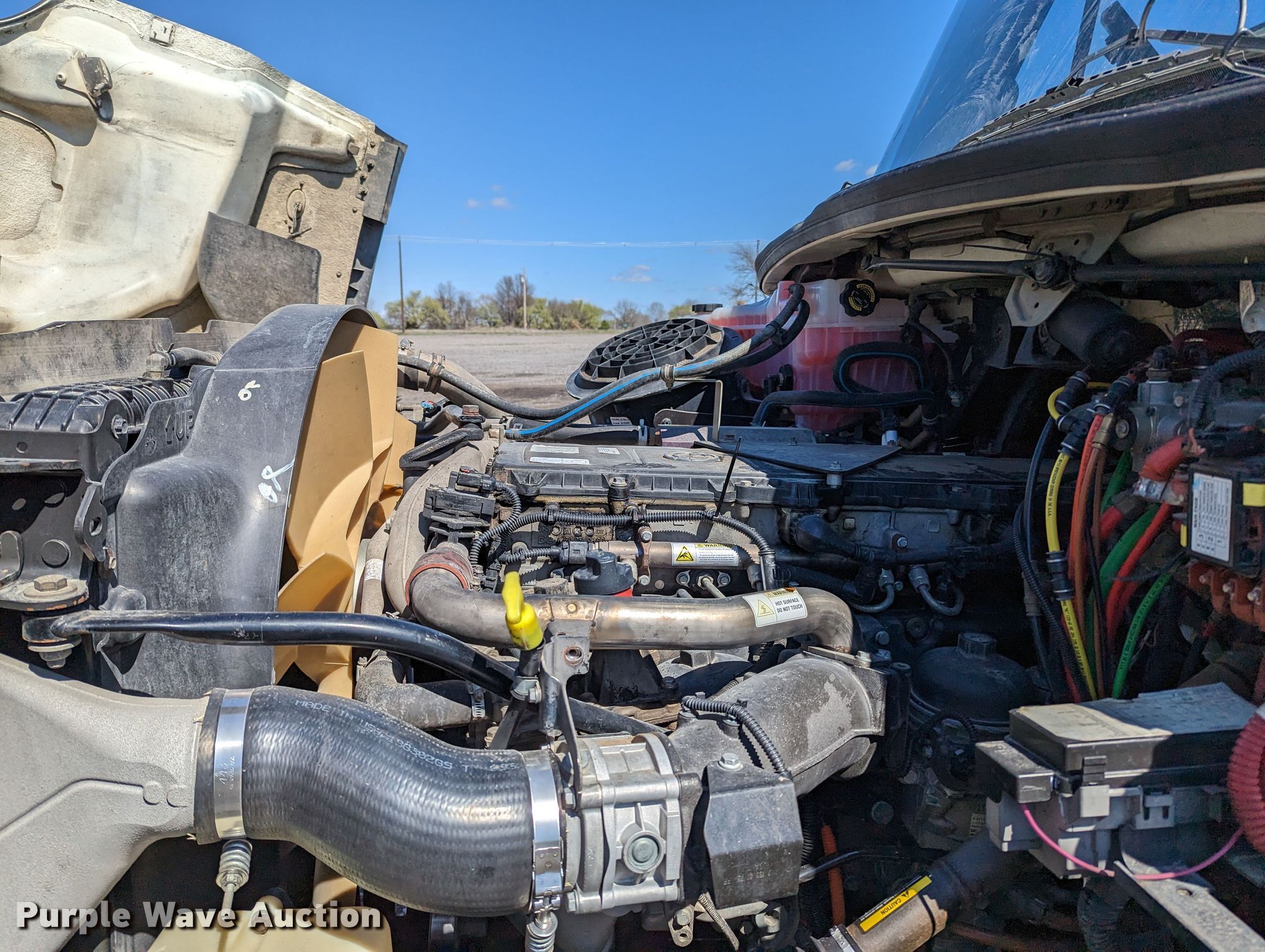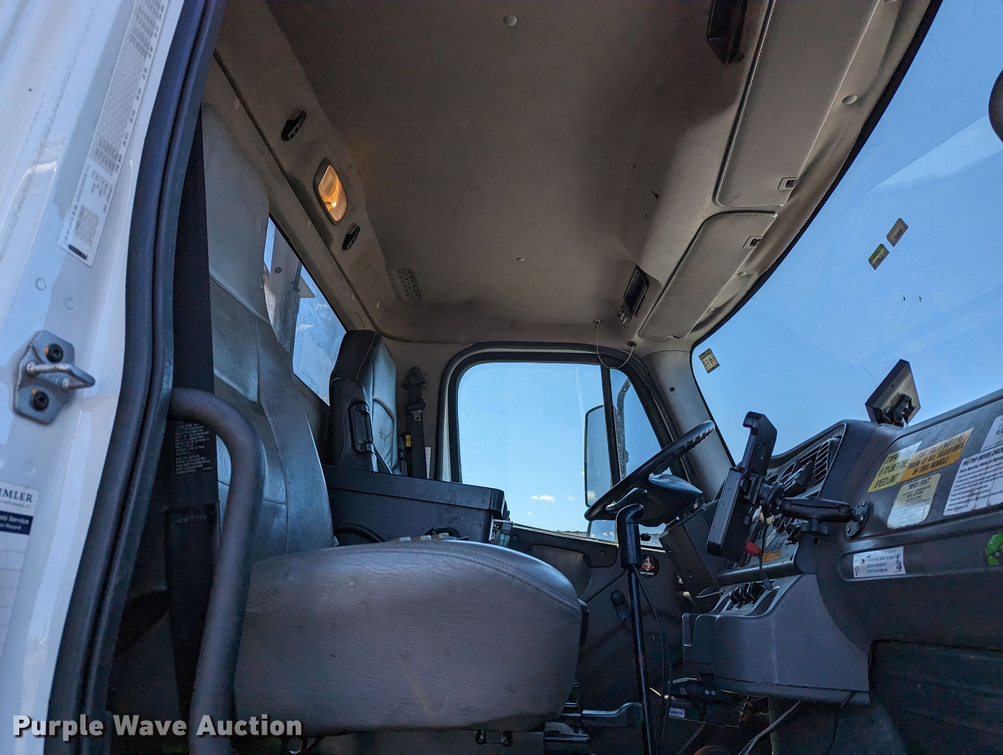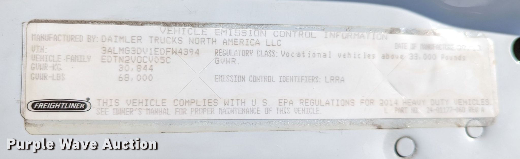 2014 Freightliner 114SD crane truck. Miles: 357,492 on odometer, VIN: 3ALMG3DV1EDFW4394. Engine Detroit Diesel DD13, Displacement: 12.8L, Cylinders: 6, Fuel type: Diesel, HP: 282.4, Engine brake. Transmission Eaton Fuller, Manual, Speed: 10. Chassis Axles: Tandem, Pusher axle, Suspension: Air, Brakes: Air, PTO, GVWR: 56,500 lbs FAWR: 16,000 lbs, RAWR: 42,500 lbs. Interior AC, Heat, Heated mirrors, Cruise control. Features Flatbed 16' 6" L x 96" W, Crane Builtrite Handlers 1010, Maximum boom length: 13' 10" Maximum lift capacity: 10,000 lbs, Boom controls Platform, Grapple 64" W. Tires Front: 315/80R22.5, Rear: 11R22.5, Lift axle: 295/75R22.5. Notes Dash warning indicator: Check engine. Oklahoma title. 15107 North 137th East Avenue. Collinsville, OK 74021