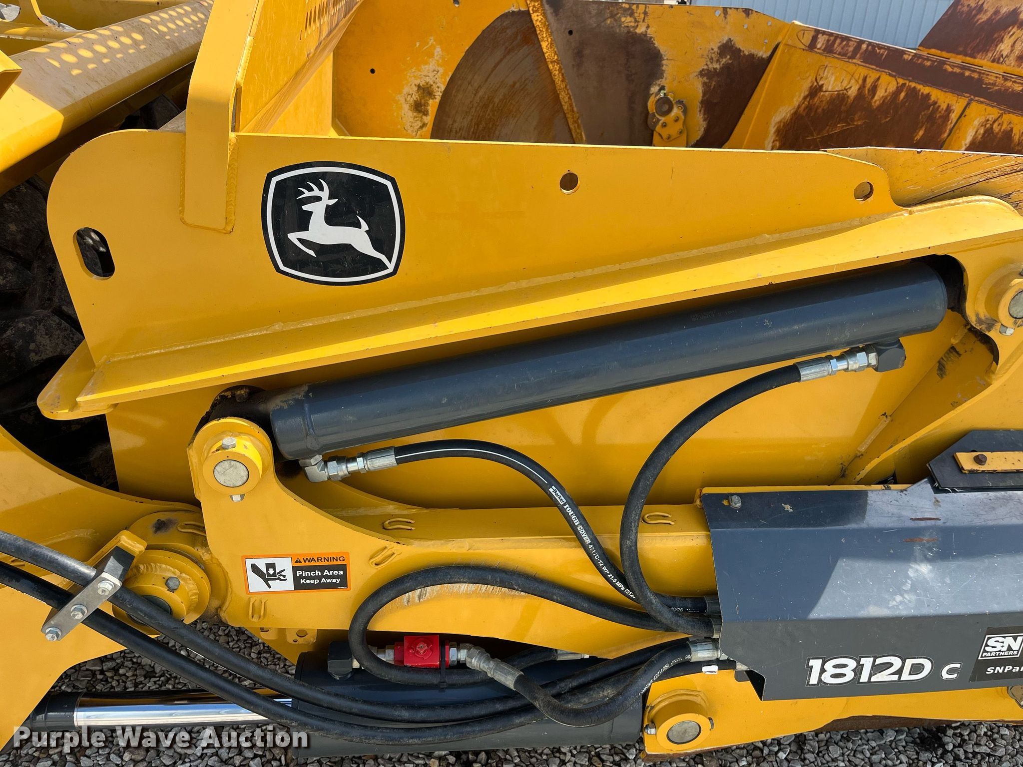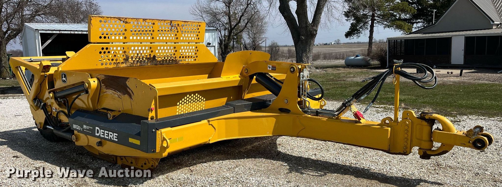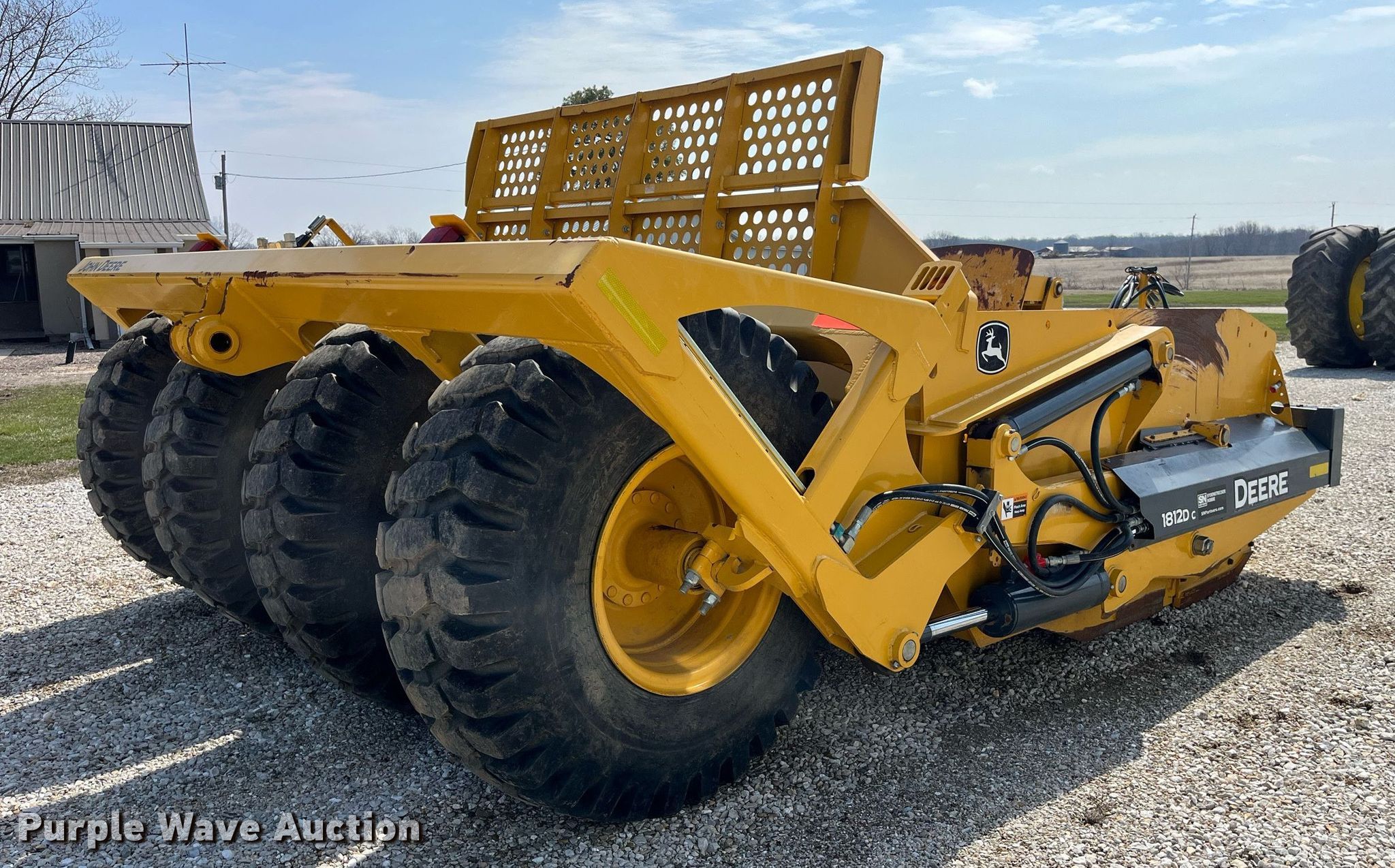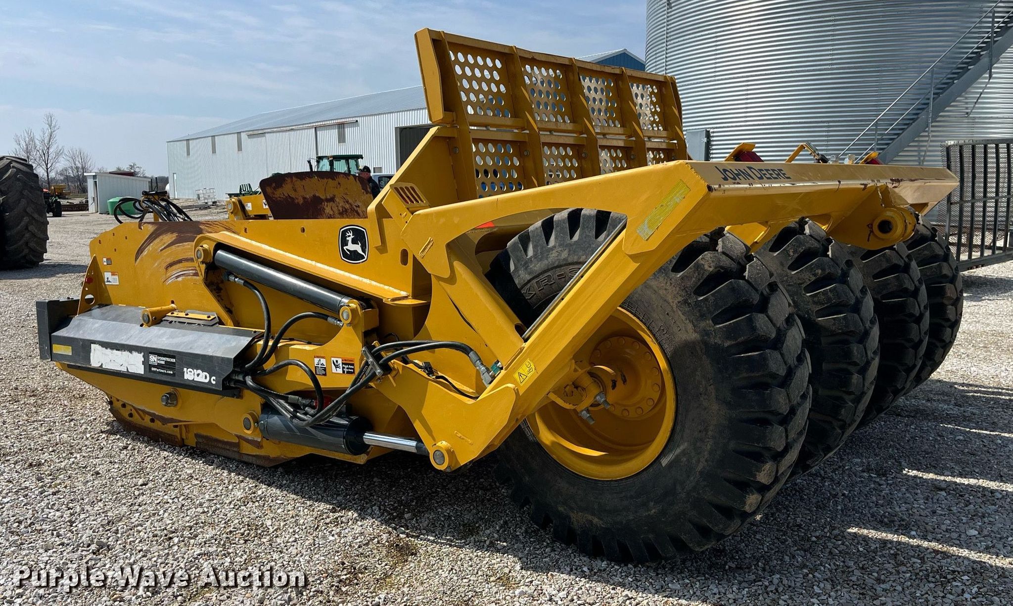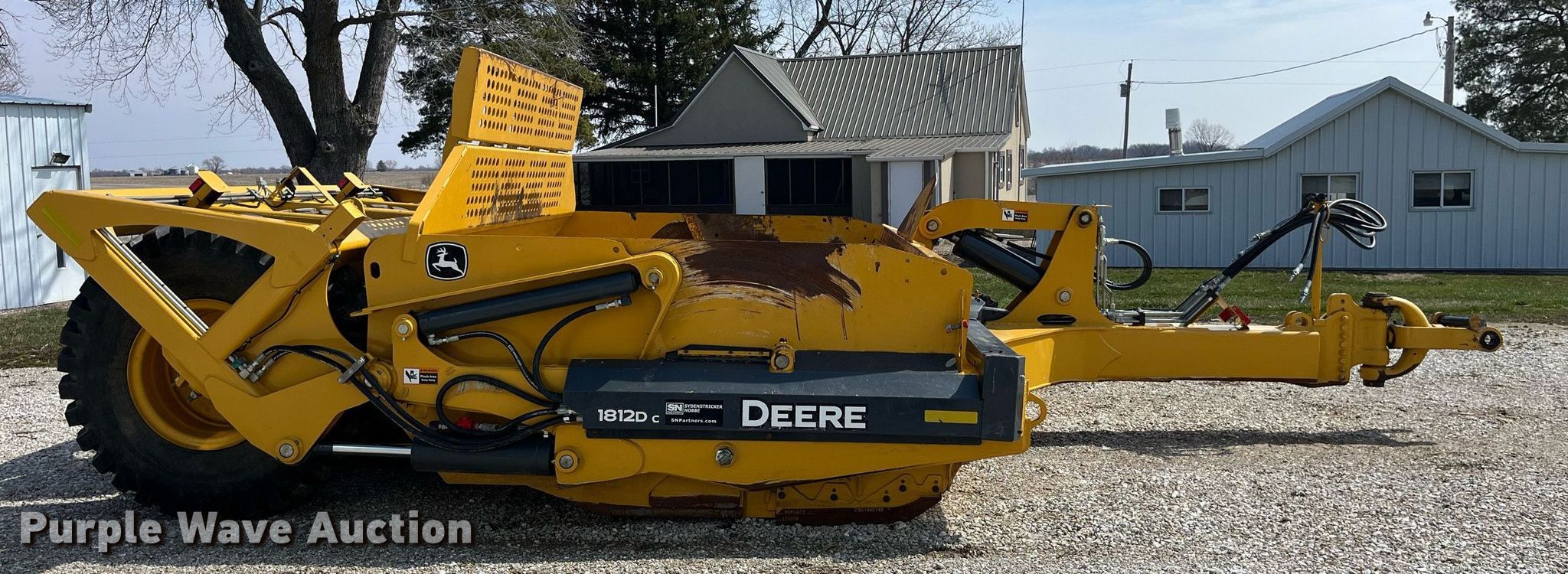 2019 John Deere 1812DC scraper. Serial: 1T81812CAKD419019. Features Bowl capacity: 18 cu.yd., Reversible cutting edge, Hydraulic lift, Hitch: Rear. Tires Rear: 20.5-25. Notes Tractor not included. John Deere hitch Fits John Deere 9000 series tractors. Jim Nelson Farms. 20957 State Highway K. Atlanta, MO 63530