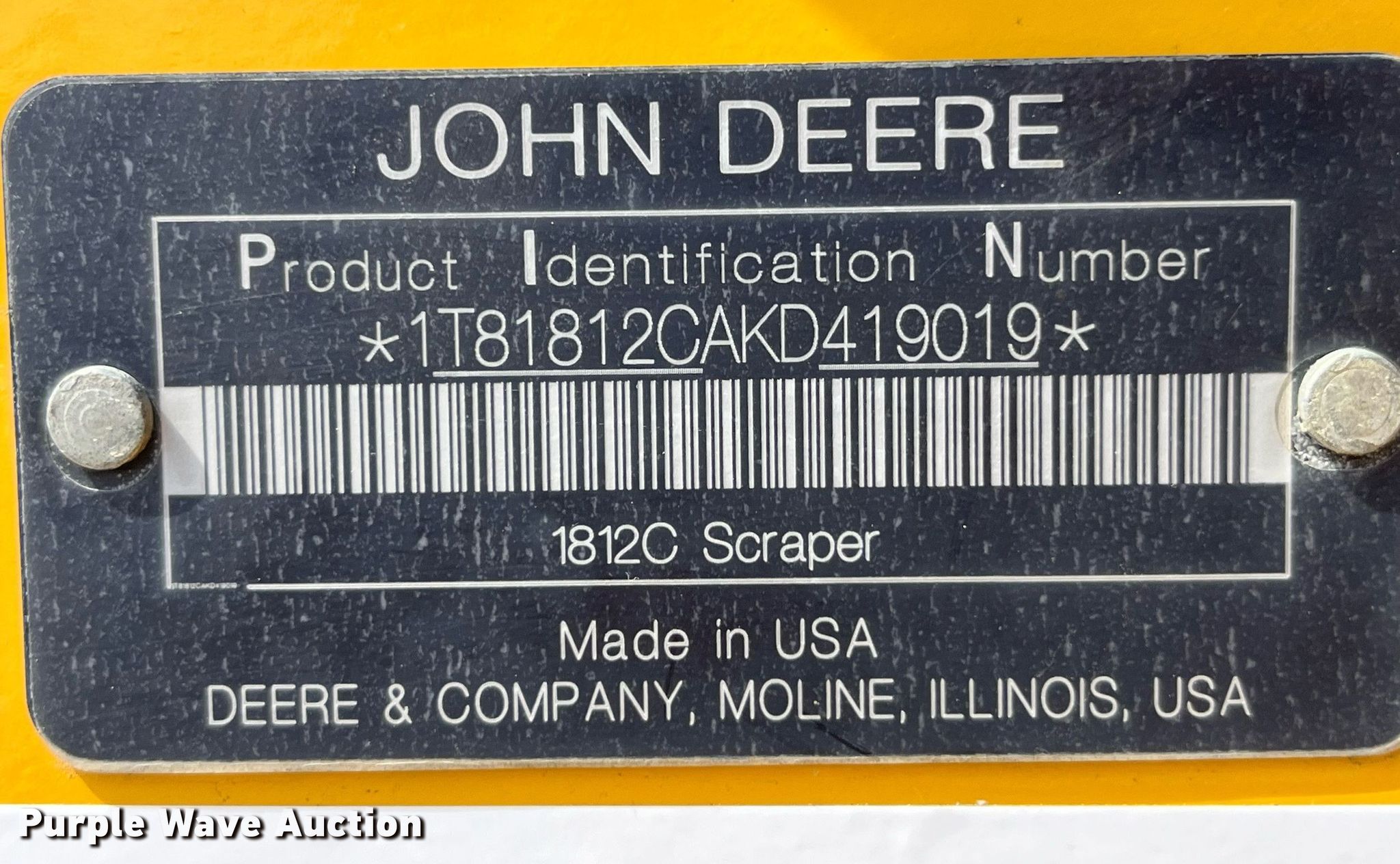 Purple Wave is selling a used Pull Type Scraper in Missouri. This item is a 2019 John Deere 1812DC scraper with the following: Serial: 1T81812CAKD419019