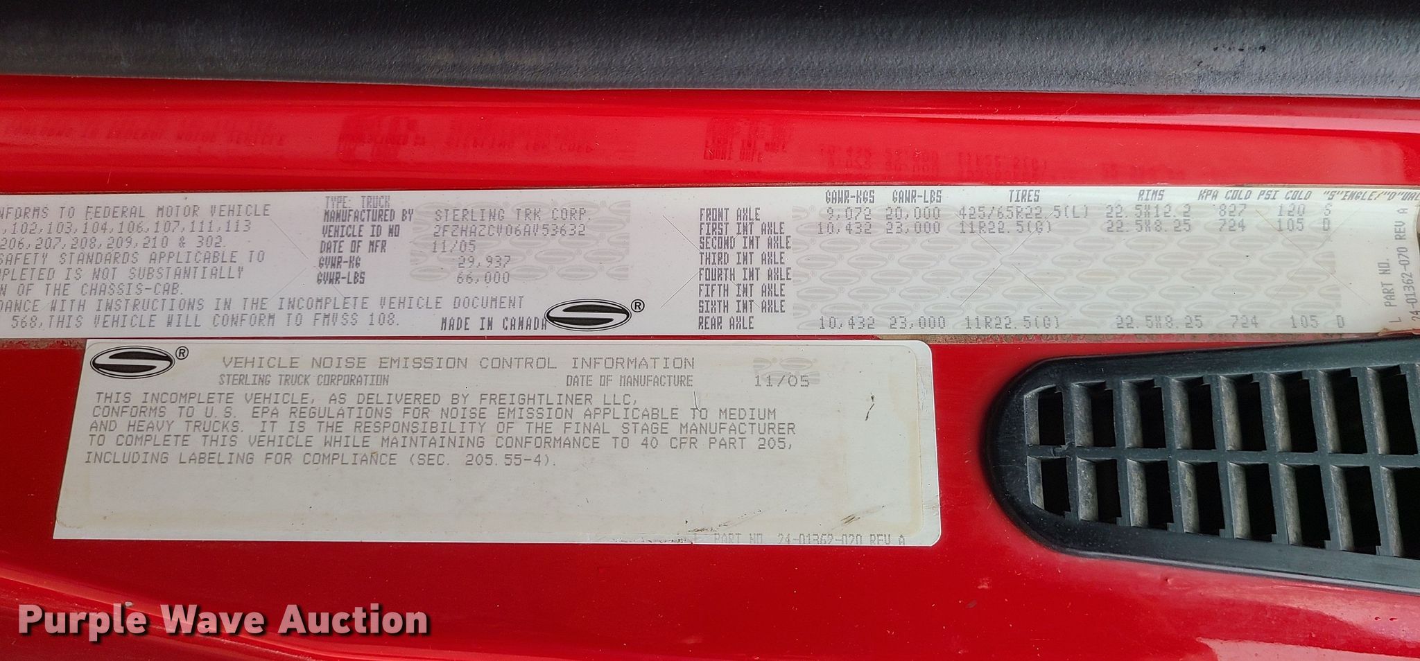 2006 Sterling L9500 crane truck. Miles: 147,107 on odometer, Hours: 10,996 on meter, VIN: 2FZHAZCV06AV53632. Engine Mercedes Benz MBE 4000, Displacement: 12.0L, Cylinders: 6, Fuel type: Diesel. Transmission Manual. Chassis Axles: Four, Pusher axle, Tag axle, Suspension: Spring over walking beam, Brakes: Air, GVWR: 66,000 lbs. Interior AC, Heat, Power windows, Cruise control. Features 22' x 102" W, Crane 2005 Fassi F410 Serial: 0277, Maximum boom length: 85' Maximum lift capacity: 7,716 lbs, Boom controls Ground, Remote control, Lift chart. Tires Front: 425/65R22.5, Rear: 11R22.5, Lift axle: 275/70R22.5, Rear lift axle: 215/75R17.5. Missouri title. Title distribution may be delayed up to 14 days from verification of funds. AB Rock - Open inspection April 26th. 15301 Broadmoor Street. Overland Park, KS 66223