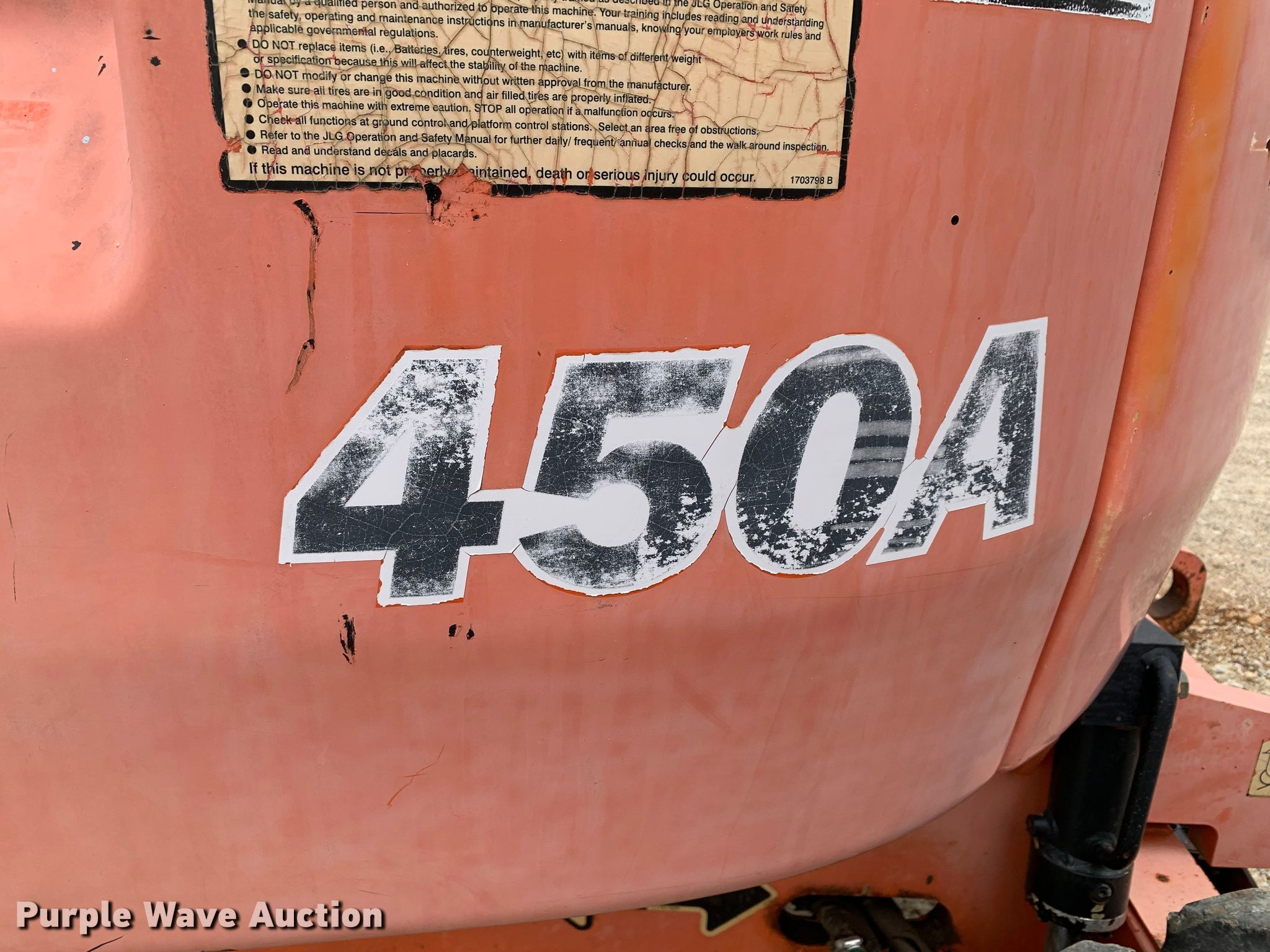 2000 JLG 450A boom lift. Hours: 4,138 on meter, Serial: 1264050300051368. Engine Cylinders: 4, Fuel type: Gas. Features Rough terrain, Maximum lift capacity: 500 lbs, Maximum reach length: 23', Maximum lift height: 45', Hydraulic leveling, Platform: 72" L x 30" W, AC power outlet, Controls: Platform, Ground, Platform rotation: Hydraulic. Tires Tire size: 33x15.50-16.5 NHS. Hendrix and Arp Contracting. 10061 HM 2276 N. Henderson, TX 75602