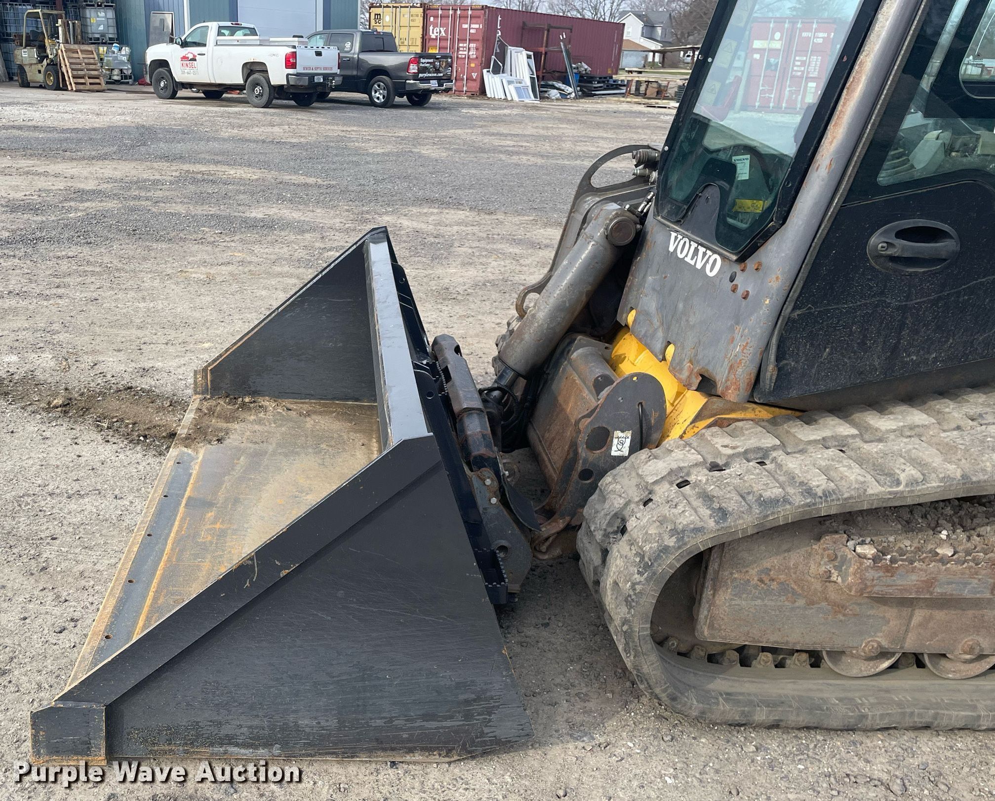 Volvo MC125C tracked skid steer loader. Hours: 4,043 on meter, Serial: GEO125TRCB1640250. Engine JCB, Cylinders: 4, Fuel type: Diesel. Transmission Hydrostatic, Two speed travel. Operators station Enclosed cab, Heat, Bucket control: Hand, Electronic Monitoring System panel. Features Auxiliary hydraulics, Auxiliary electrical outlet, Quick coupler: Hydraulic, Bucket Melecio 3027084, Width: 86", Cutting edge: Weld-on. Tracks Width: 18". Notes Glass cracked. Kinsel Trucking & Excavating LLC. 1675 E Walnut St. Canton, IL 61520