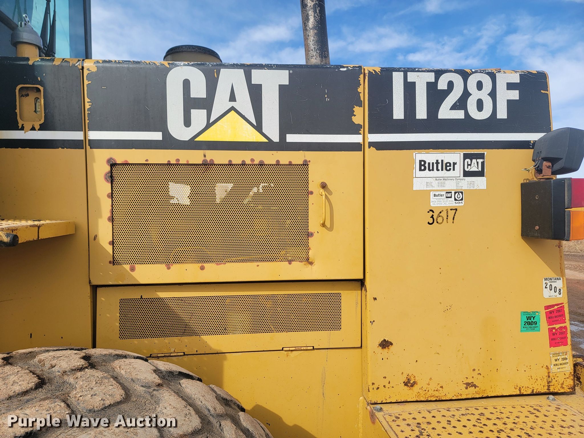 1995 Caterpillar IT28F wheel loader. Hours: 28,731 on meter, Serial: 3CL01283. Engine Caterpillar, Cylinders: 6, Fuel type: Diesel. Transmission Powershift, 4F - 4R. Operators station Enclosed cab, AC, Heat, Bucket controls: Two-lever. Features Auxiliary hydraulics: Front, Quick coupler: Hydraulic, Bucket Width: 101", Cutting edge: Bolt-on, Forks Length: 48". Tires Front: 20.5-R25, Rear: 20.5R25. Notes Glass cracked. Gustafson Builders. 4101 Deadwood Avenue North. Rapid City, SD 57709