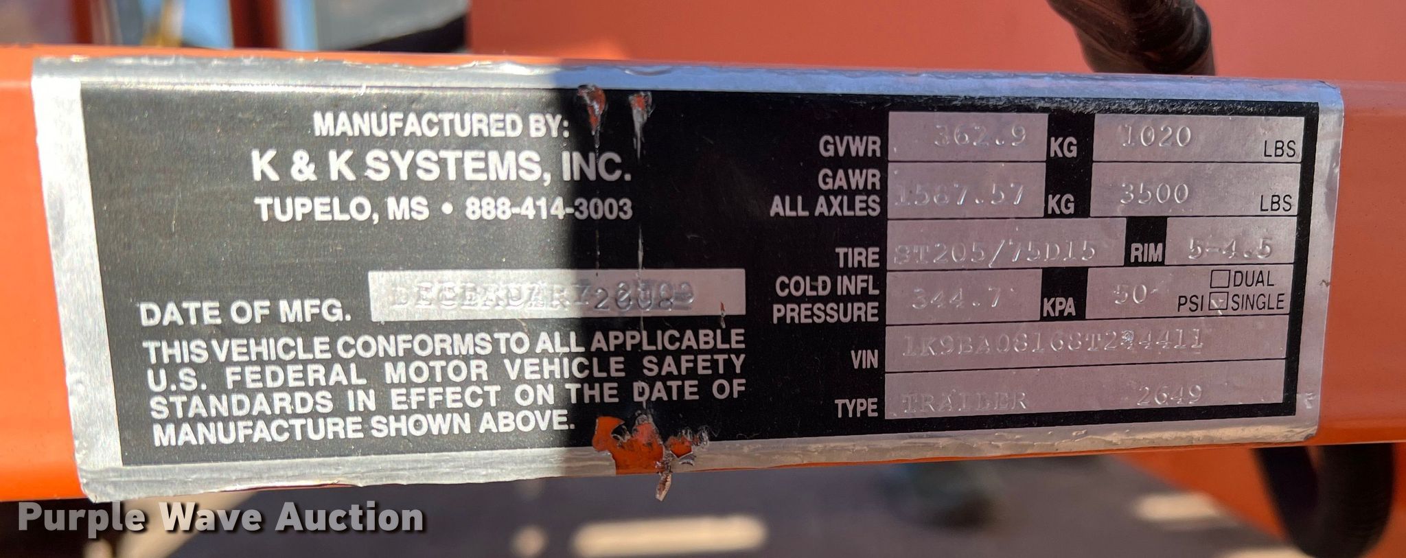 Purple Wave is selling a used Road Safety Equip. in Texas. This item is a 2008 K&K Systems arrow board trailer with the following: VIN: 1K9BA08168T244411