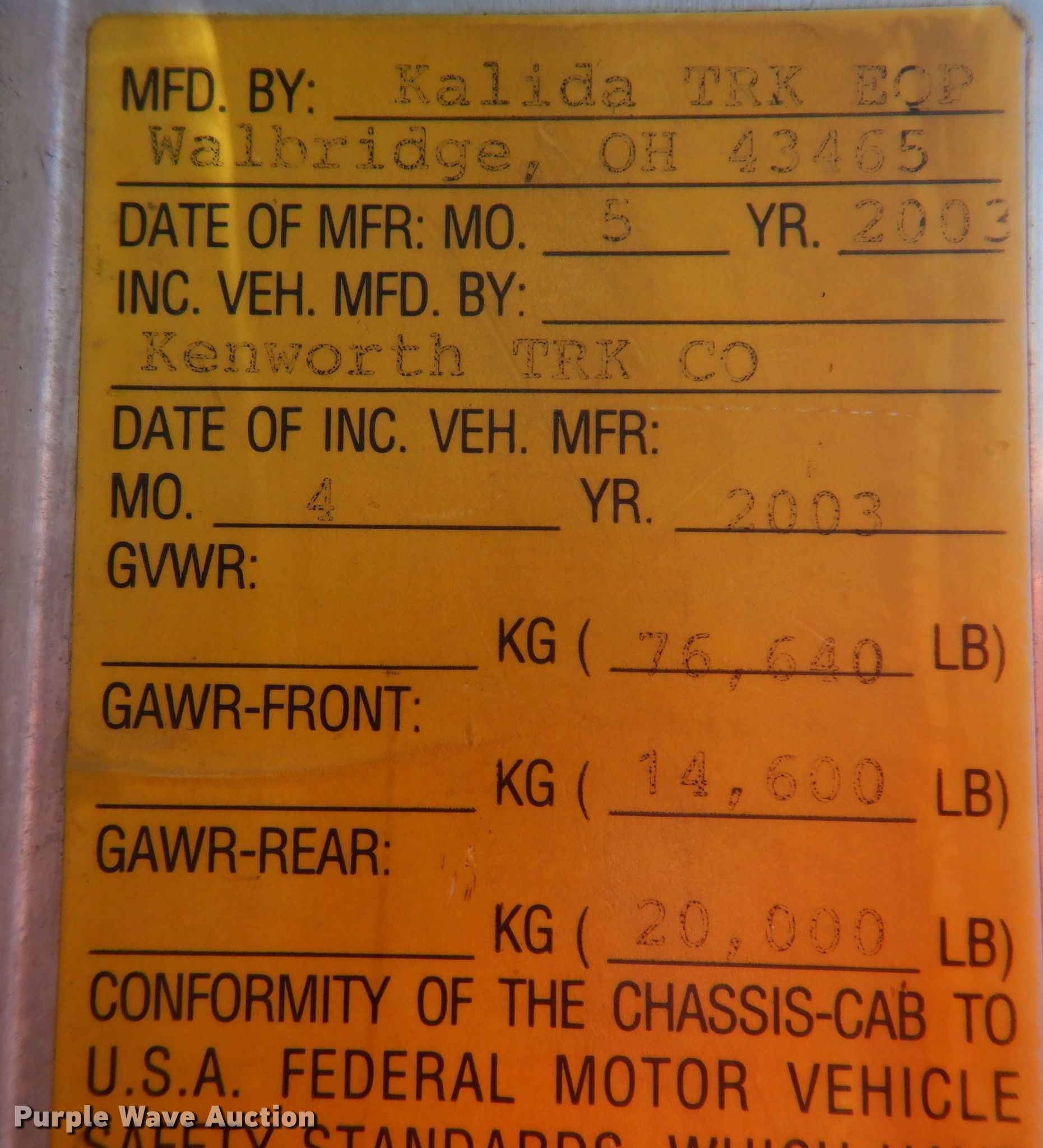 2004 Kenworth T800 dump truck. Miles: 138,205 on odometer, VIN: 1NKDXTEXX4J052500. Engine Caterpillar C12, Serial: SKS42668, Displacement: 11.9L, Cylinders: 6, Fuel type: Diesel, HP: 430, kW: 321. Transmission Eaton Fuller 8LL, Manual, Speed: 10. Chassis Double frame, Axles: 4, Gear ratio: 4.56, Pusher axle Steerable, Differential lock: Inter-axle, Suspension: Spring over walking beam, Brakes: Air, PTO, GVWR: 76,640 lbs FAWR: 14,600 lbs, IAWR: 20,000 lbs, RAWR: 20,000 lbs, Lift axle GAWR: 11,020 lbs. Interior AC, Heat, Heated mirrors, Cruise control. Features Dump bed Hilark 17 3/16, 17' L x 96" W, Side height: 48", Side board height: 6", Bed type: Steel, Barrel, Ram: Single , End gate: Air operated. Tires Front: 385/65R22.5, Rear: 11R22.5, Lift axle: 255/70R22.5. Notes Service records available upon request to [email protected] or [email protected]. Iowa title. Title distribution may be delayed up to 14 days from verification of funds. J&K Contracting LLC. 1307 East Lincoln Way. Ames, IA 50010