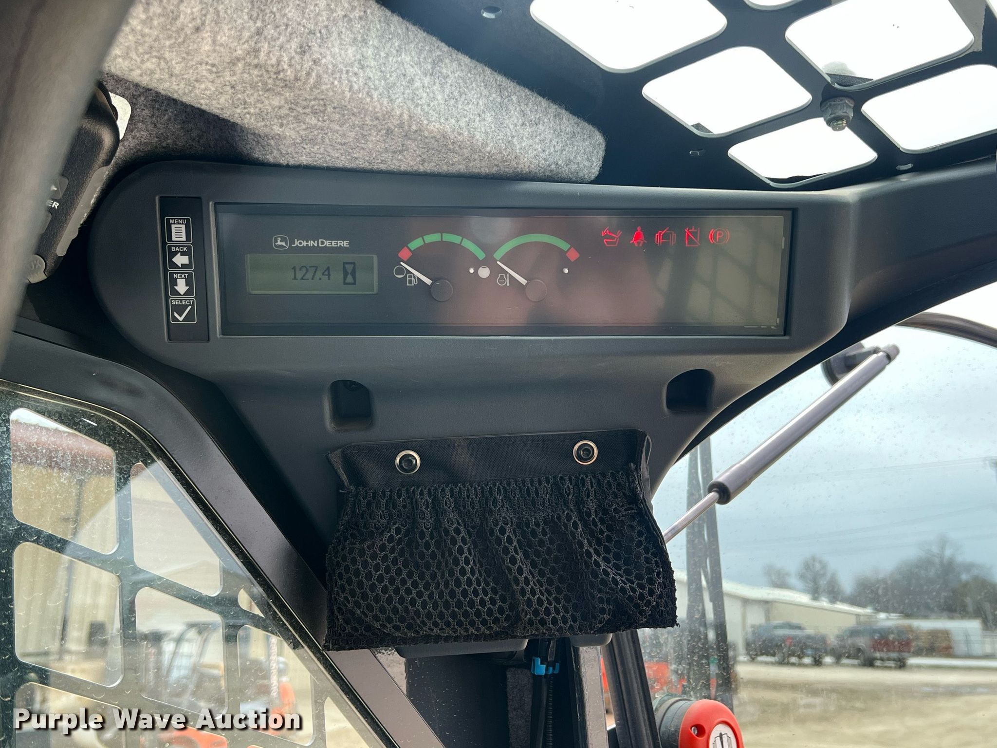 2021 John Deere 320G skid steer loader. Hours: 127 on meter, Serial: 1T0320GKEMJ397992. Engine John Deere, Cylinders: 4, Fuel type: Diesel. Transmission Hydrostatic, Two speed travel. Operators station Enclosed cab, AC, Heat, Bucket control: Hand, Pattern changer. Features Auxiliary hydraulics, Quick coupler: Hydraulic, Bucket Width: 67", Cutting edge: Weld-on, Teeth: Bolt-on. Tires Size: 12-16.5. The Rental Station. 2029 S Santa Fe Ave. Chanute, KS 66720