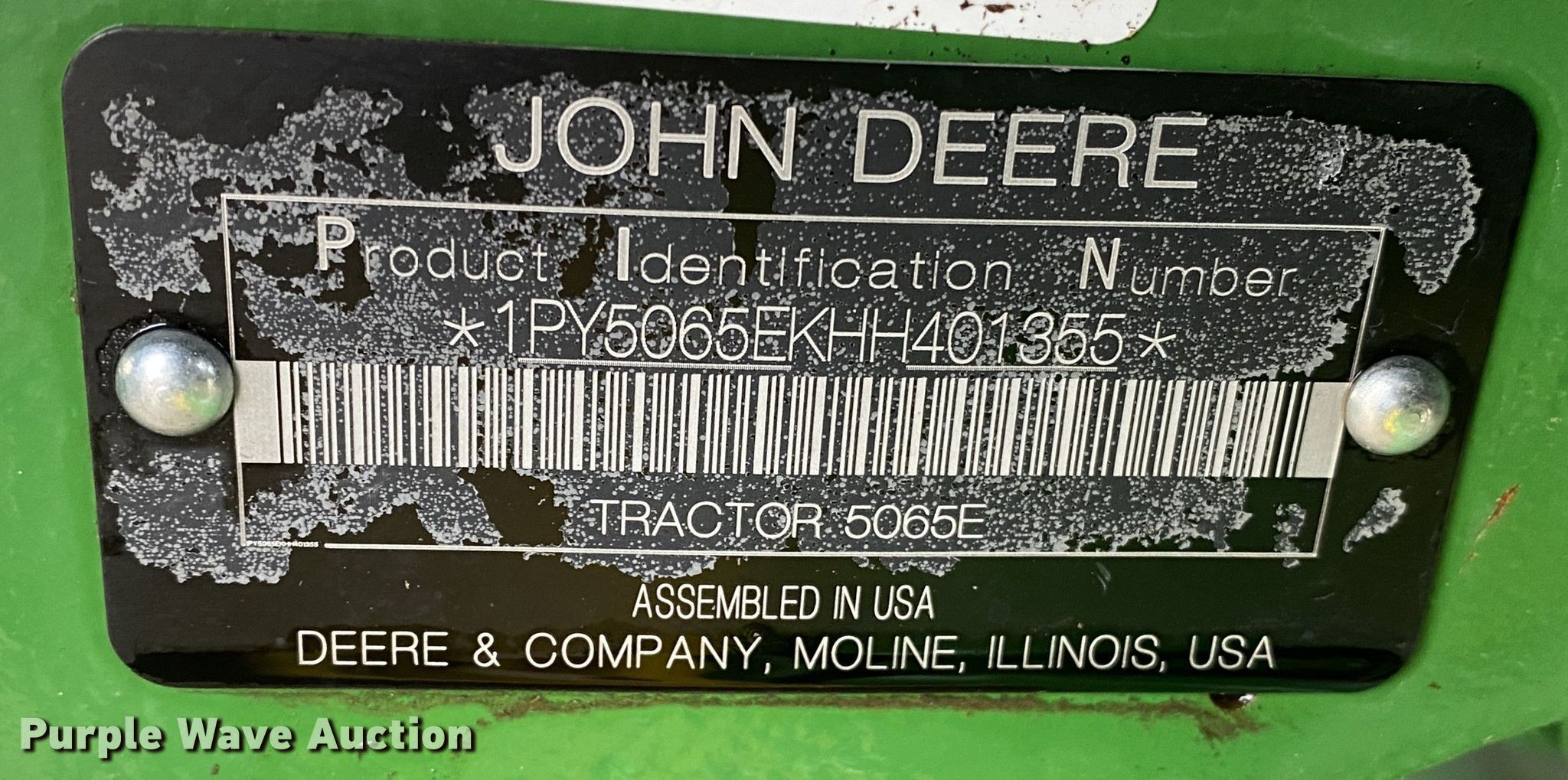 Purple Wave is selling a used Tractor in Oklahoma. This item is a 2017 John Deere 5065E MFWD tractor with the following: Hours: 801 on meter, Serial: 1PY5065EKHH401355