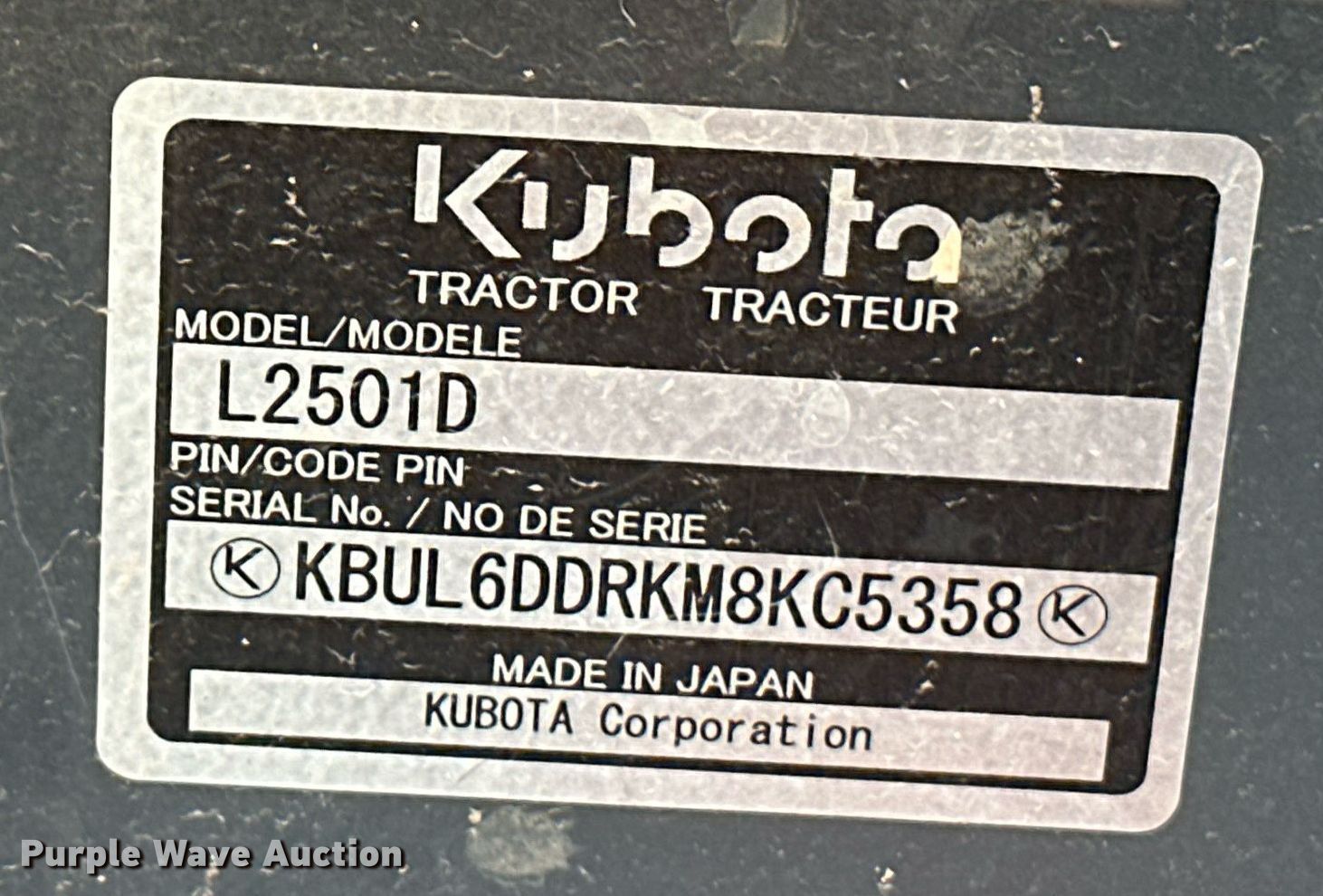 Purple Wave is selling a used Tractor in Oklahoma. This item is a 2020 Kubota L2501D MFWD tractor with the following: Hours: 85 on meter, Serial: KBUL6DDRKM8KC5358