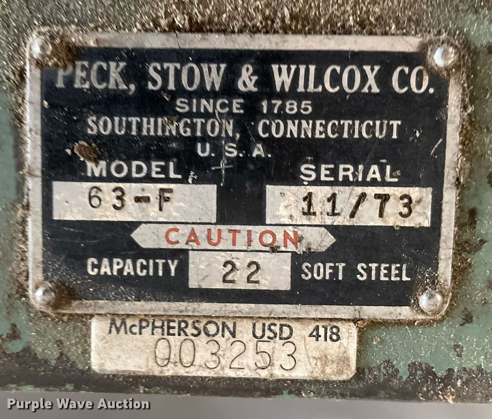 Peck Stow & Wilcox 63-F metal brake has sold in McPherson, Kansas for $253. Item DK7321 sold on May 2nd, 2023.