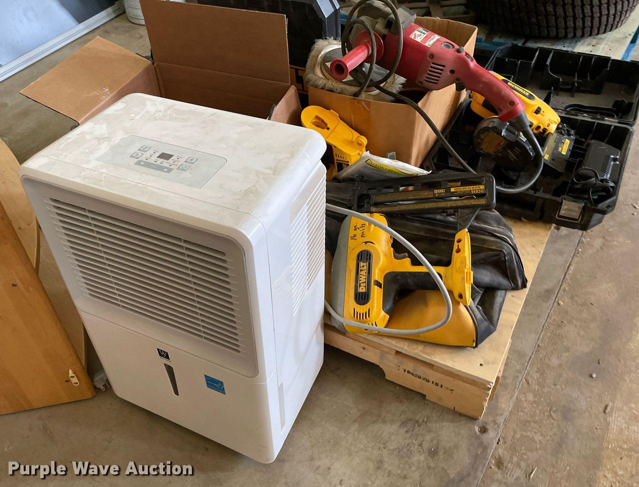 Purple Wave is selling a used Tools in Kansas. This item is a Tools with the following: 2014 True Value dehumidifier, Dewalt DC608 brad nailer, Dewalt DC616 finish nailer, Milwaukee 7" polisher, (2) Dewalt DW933 jigsaw, (3) Performax multi tools, Alltrade multi tool, (3) Senco nailers, Milwaukee drill, Shelf