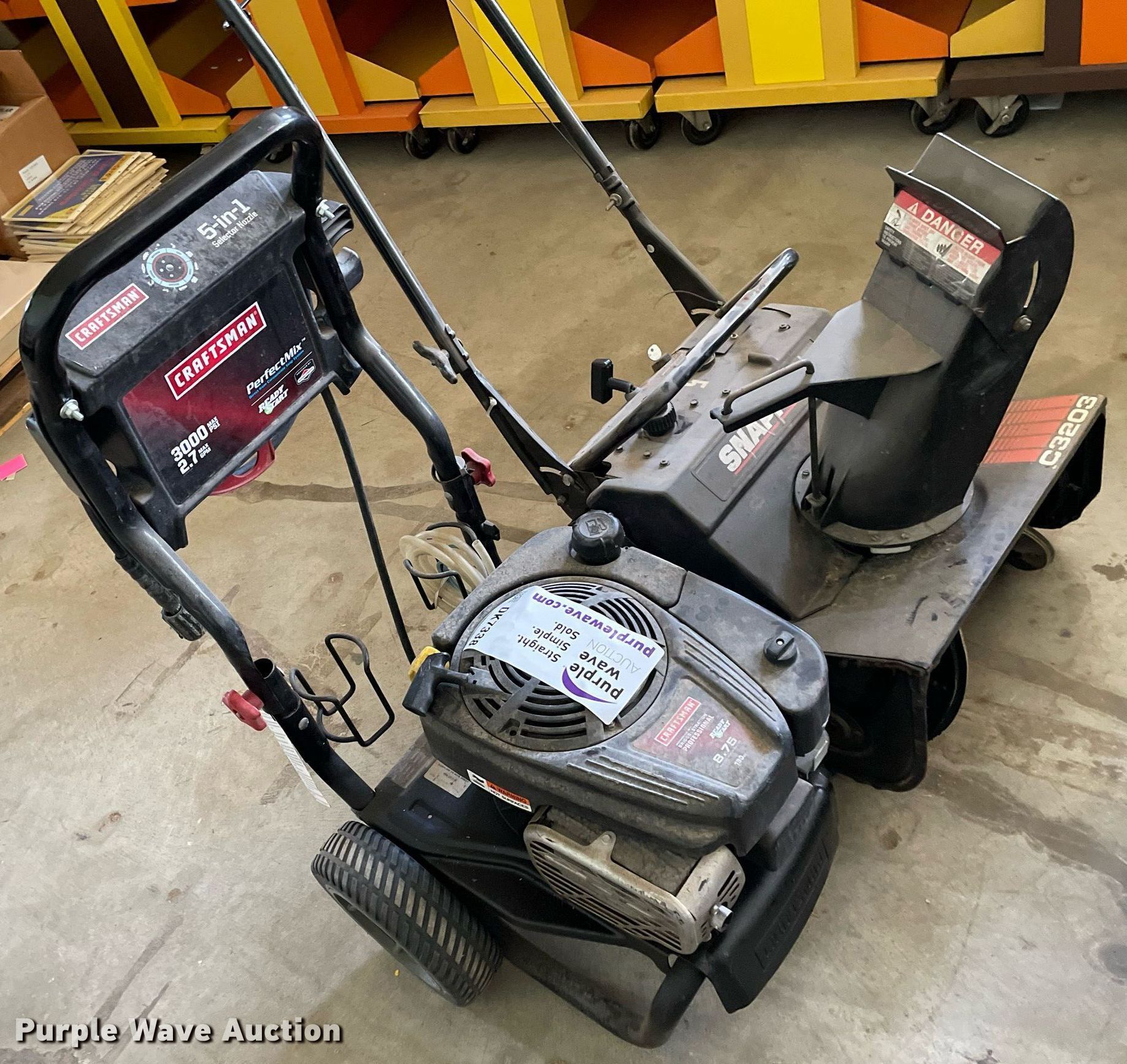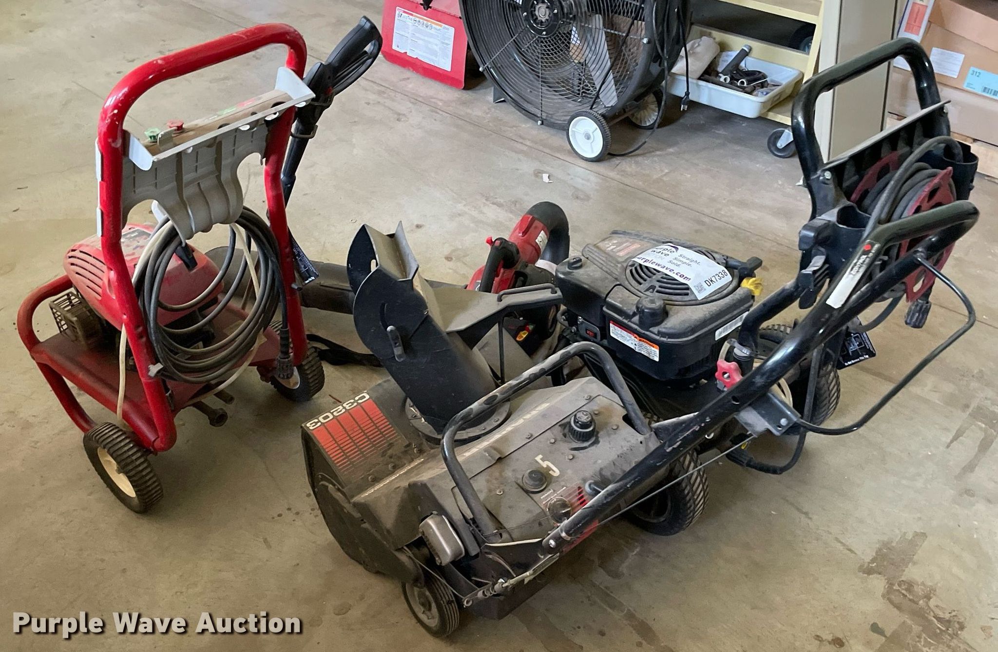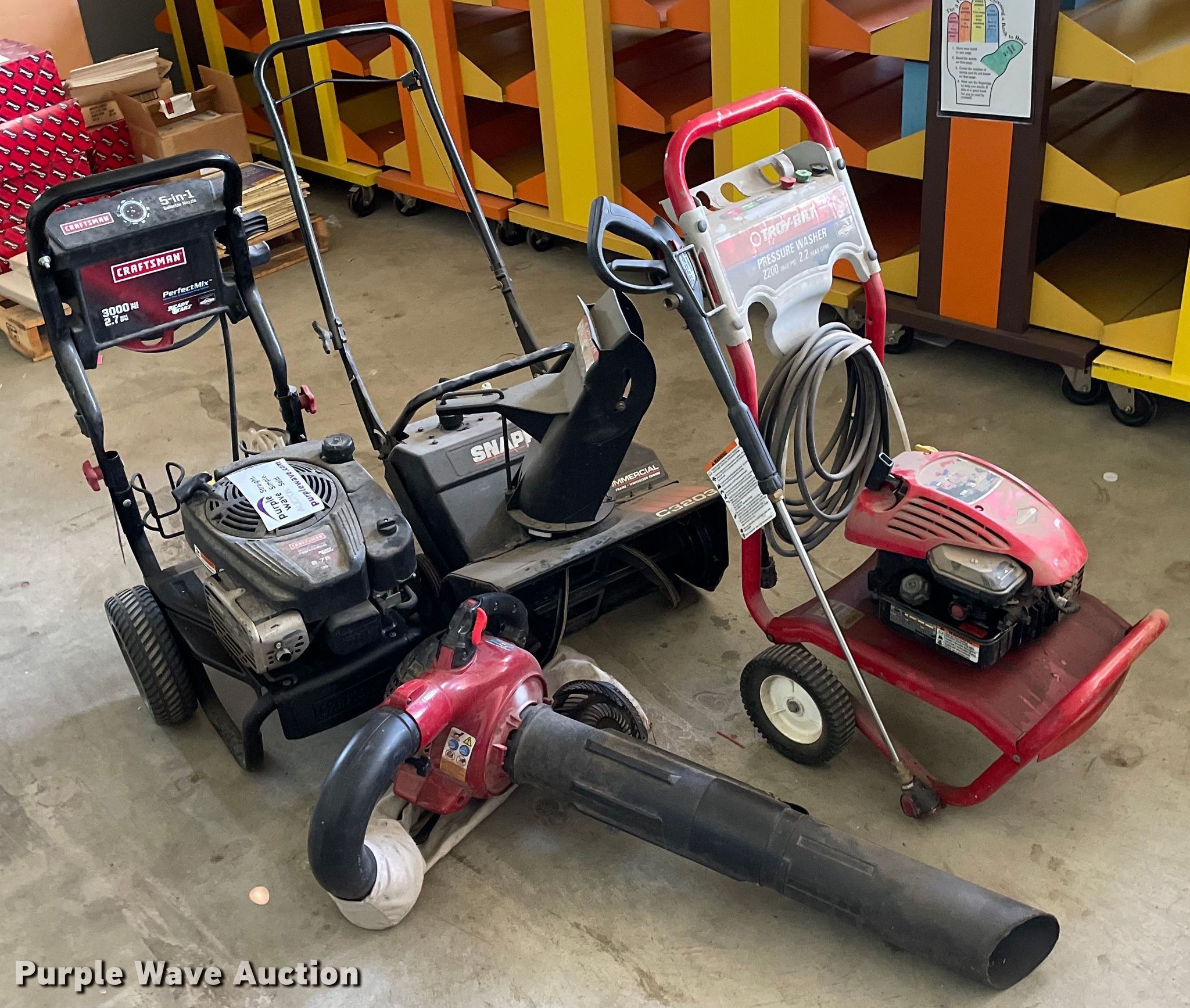 Purple Wave is selling a used Lawn and Garden in Kansas. This item is a Tools with the following: Snapper C3203 snow blower, Craftsman Perfect Mix pressure washer, 3000 max psi, 2.7 max gpm, Troy-Bilt 020292 pressure washer, 2200 max psi, 2.2 max gpm, Craftsman 25 cc gas blower, 450 cfm