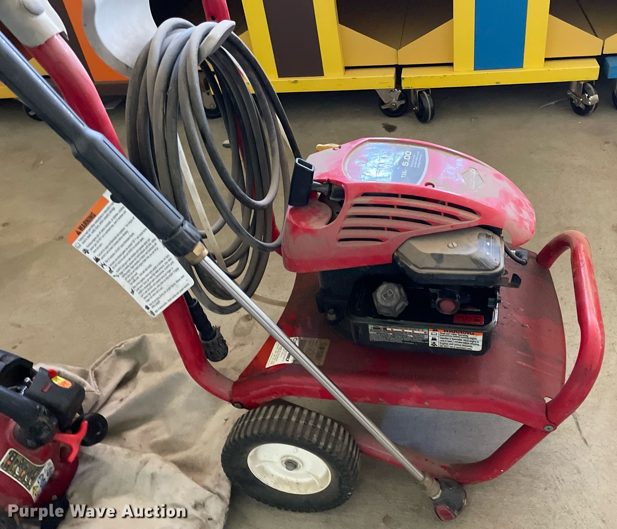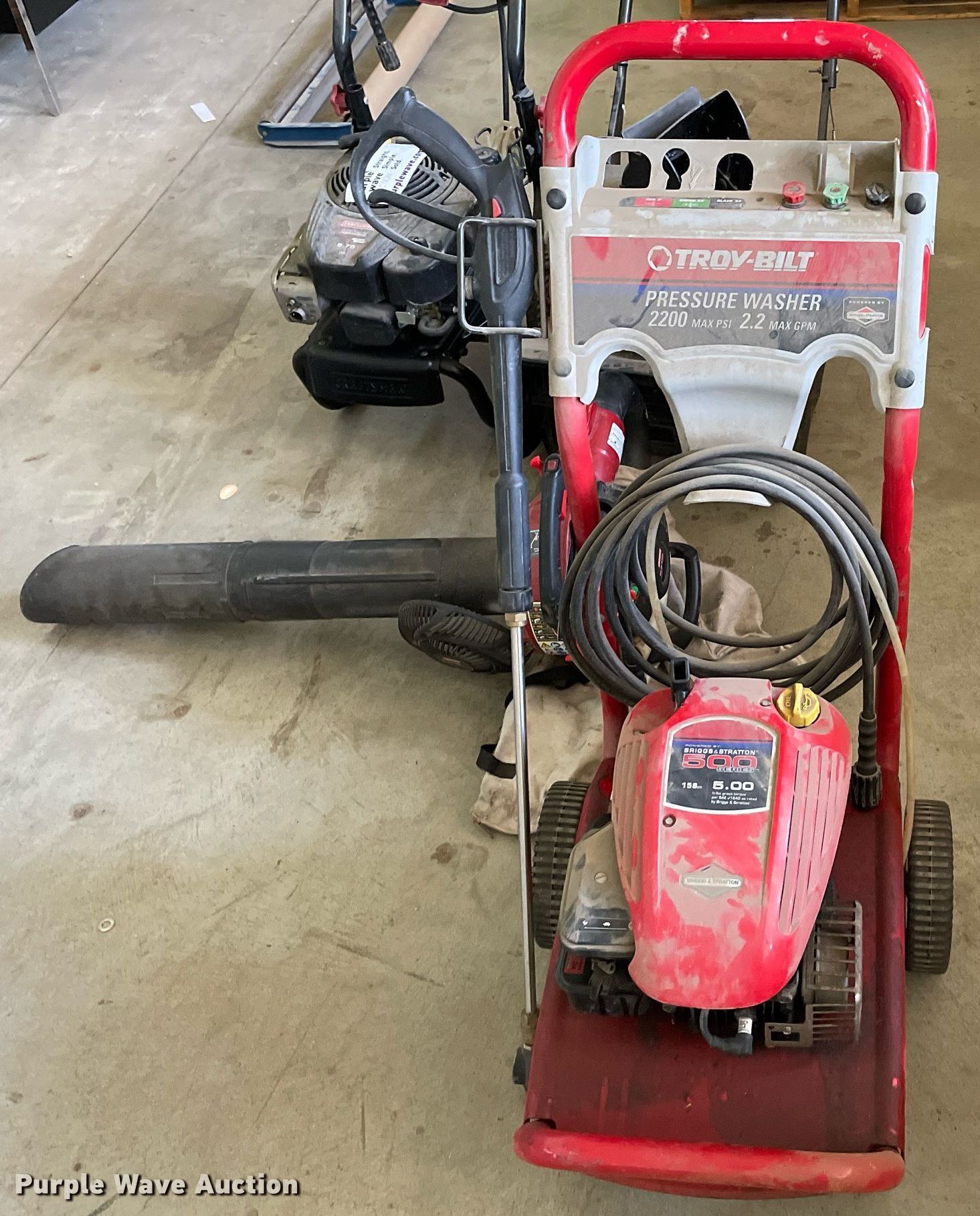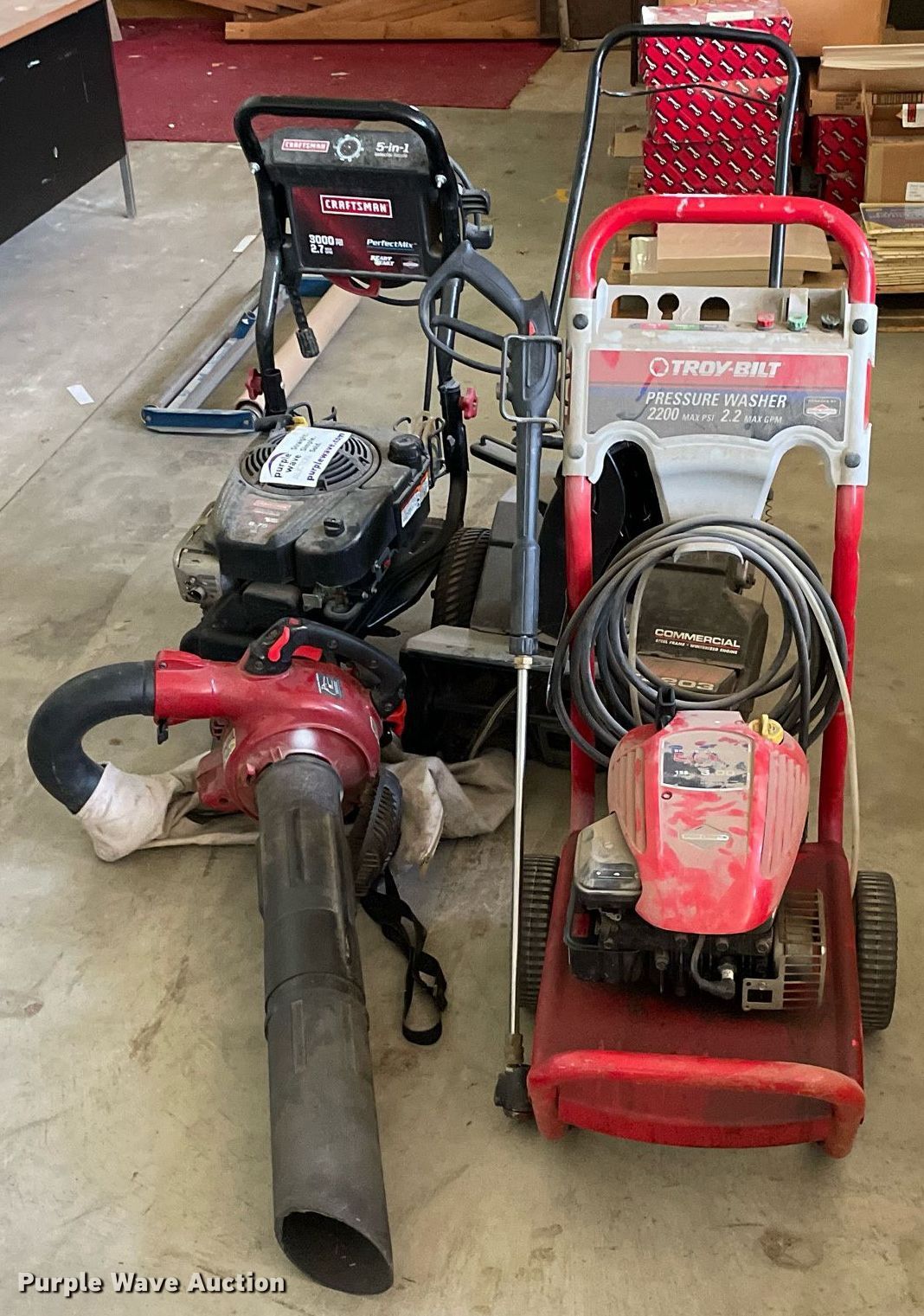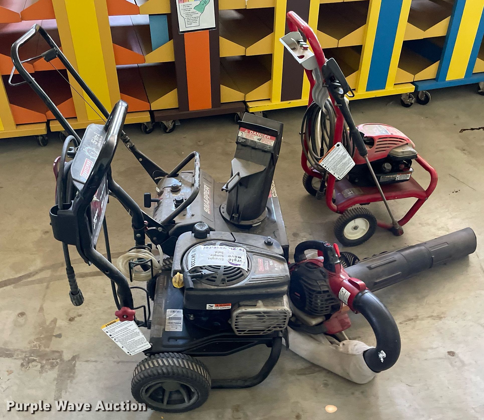 Purple Wave is selling a used Lawn and Garden in Kansas. This item is a Tools with the following: Snapper C3203 snow blower, Craftsman Perfect Mix pressure washer, 3000 max psi, 2.7 max gpm, Troy-Bilt 020292 pressure washer, 2200 max psi, 2.2 max gpm, Craftsman 25 cc gas blower, 450 cfm