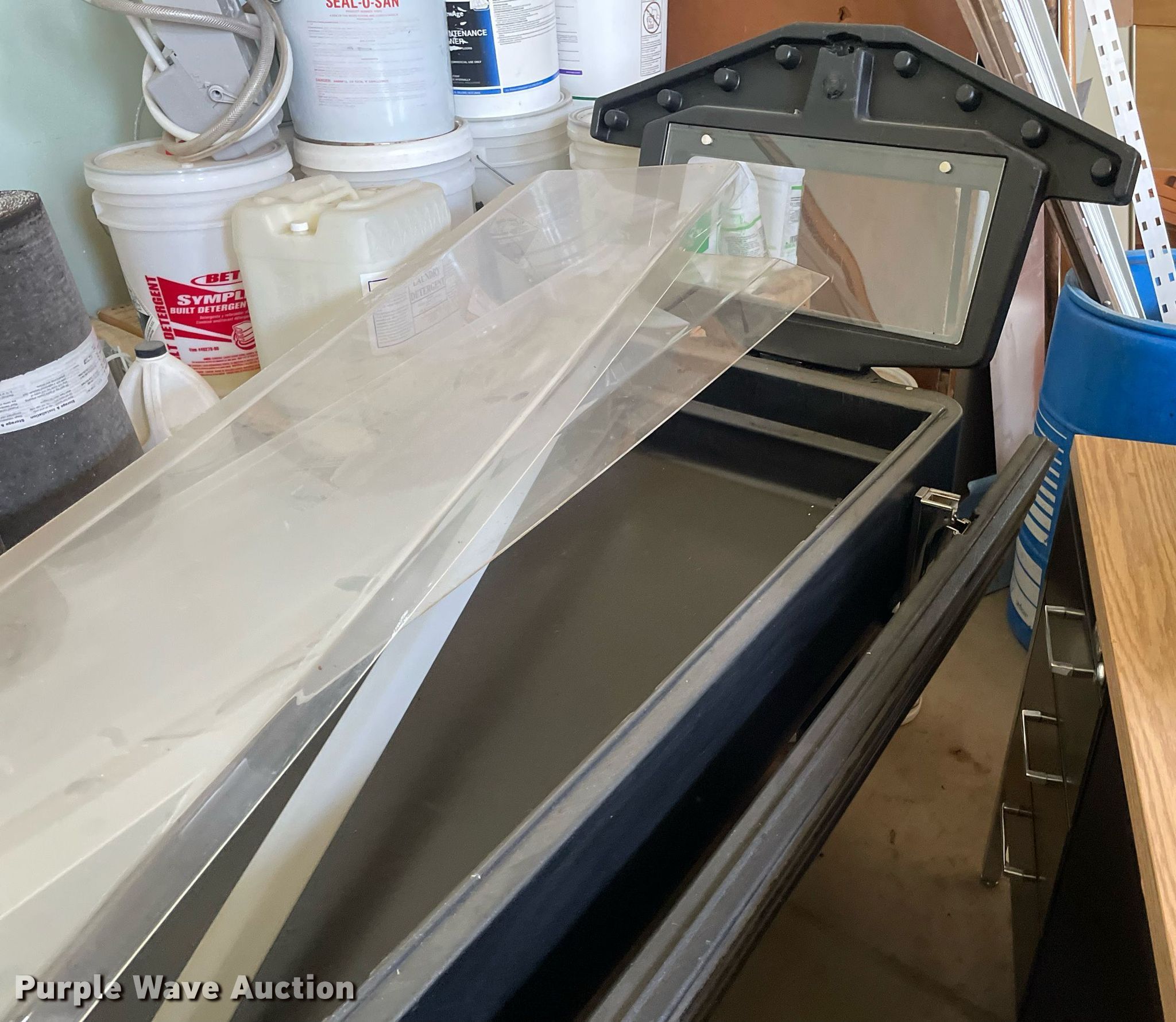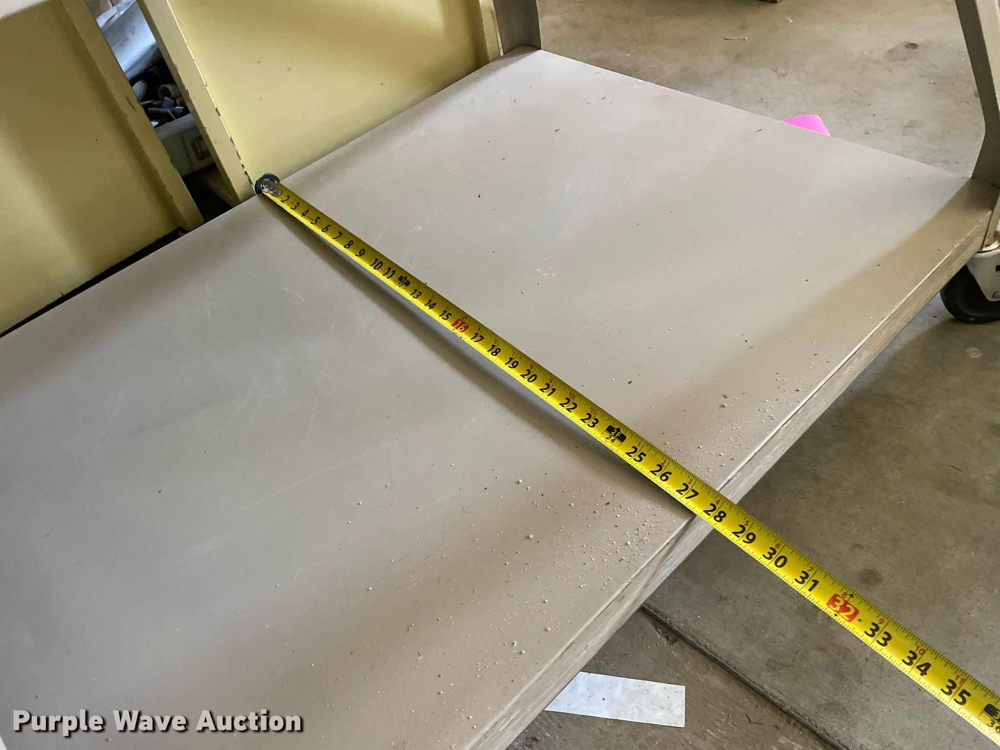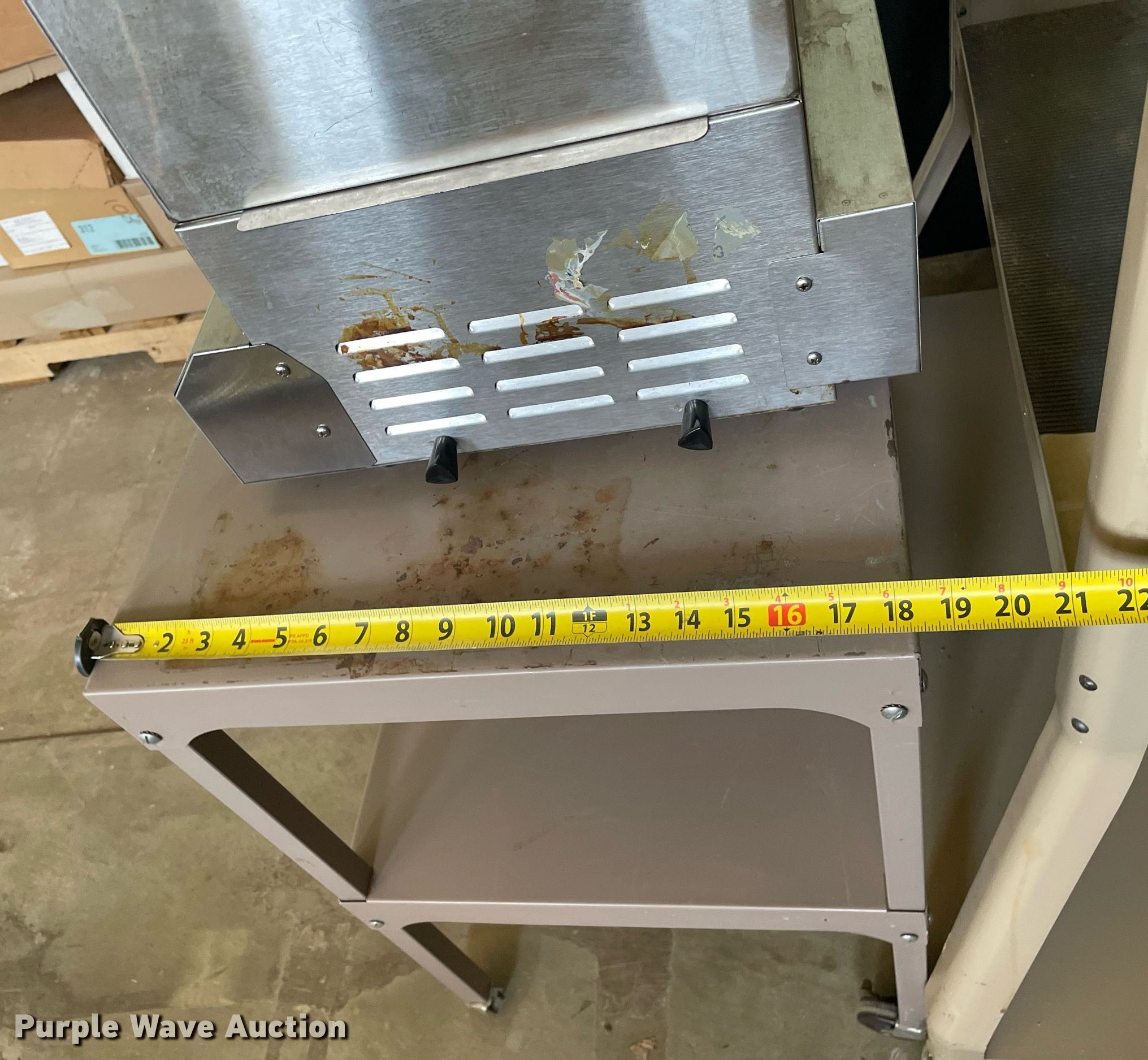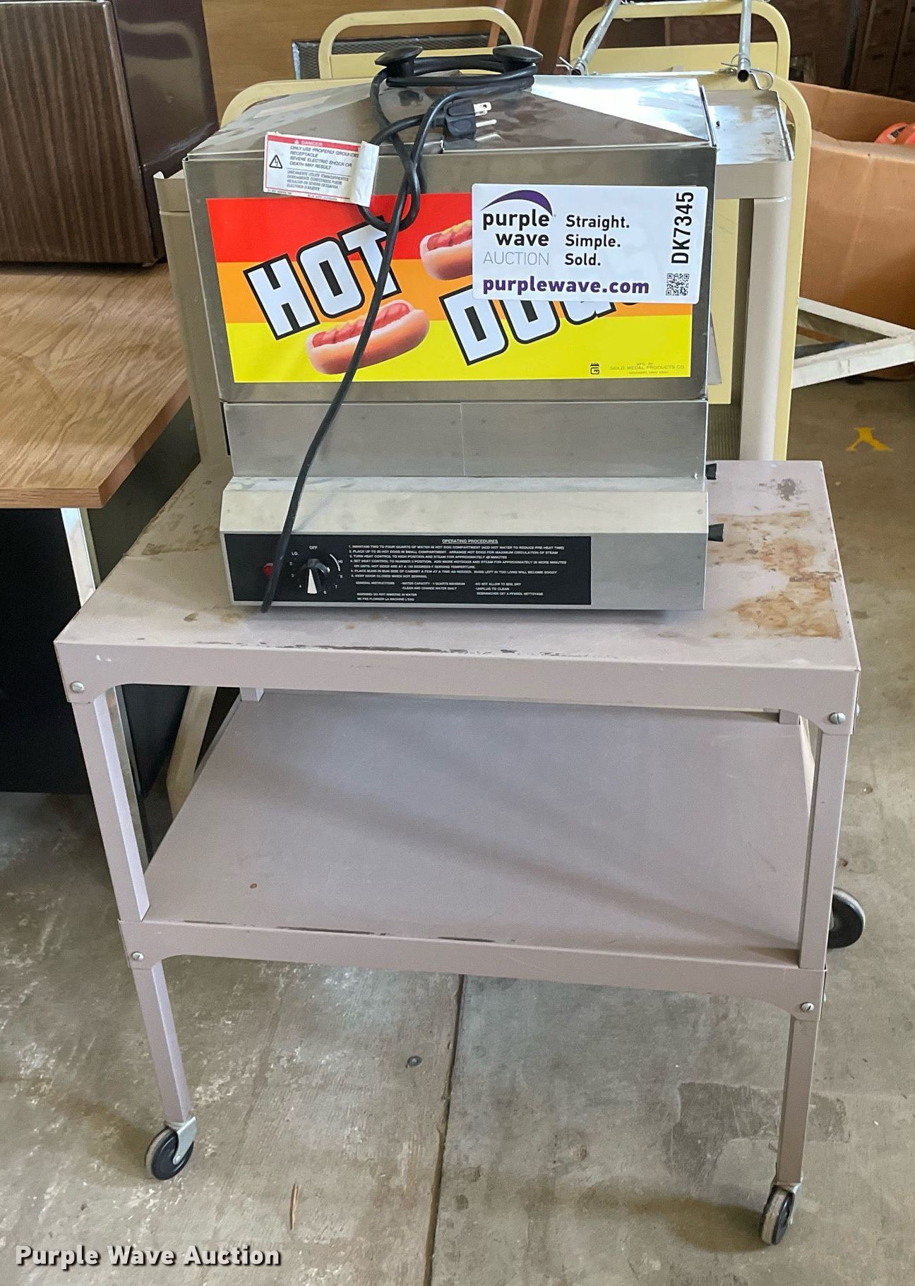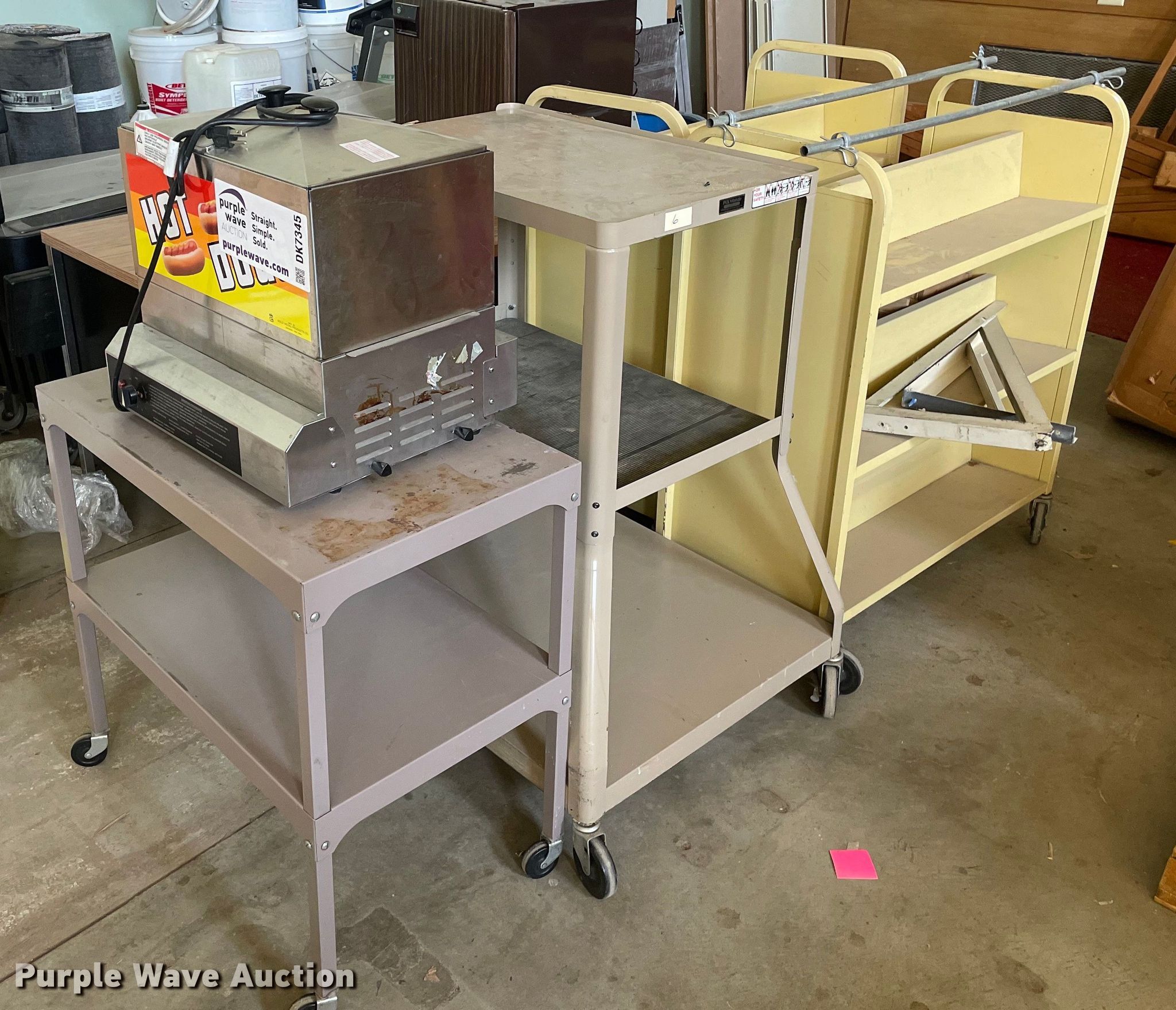 Purple Wave is selling a used Furniture in Kansas. This item is a Furniture with the following: Desk, (2) carts, (2) book shelves, Hot Dog steamer, General Electric mini fridge, Salad bar