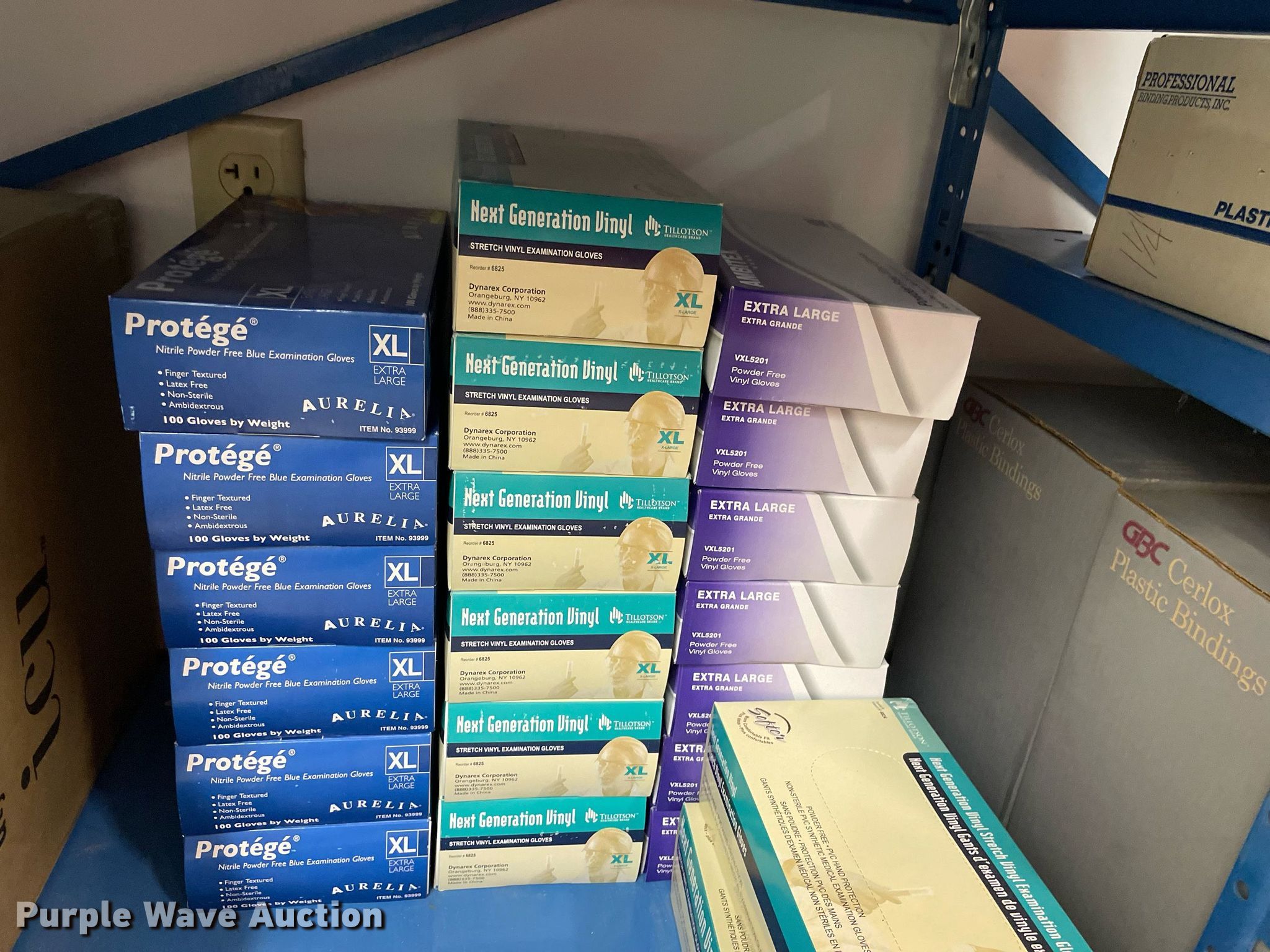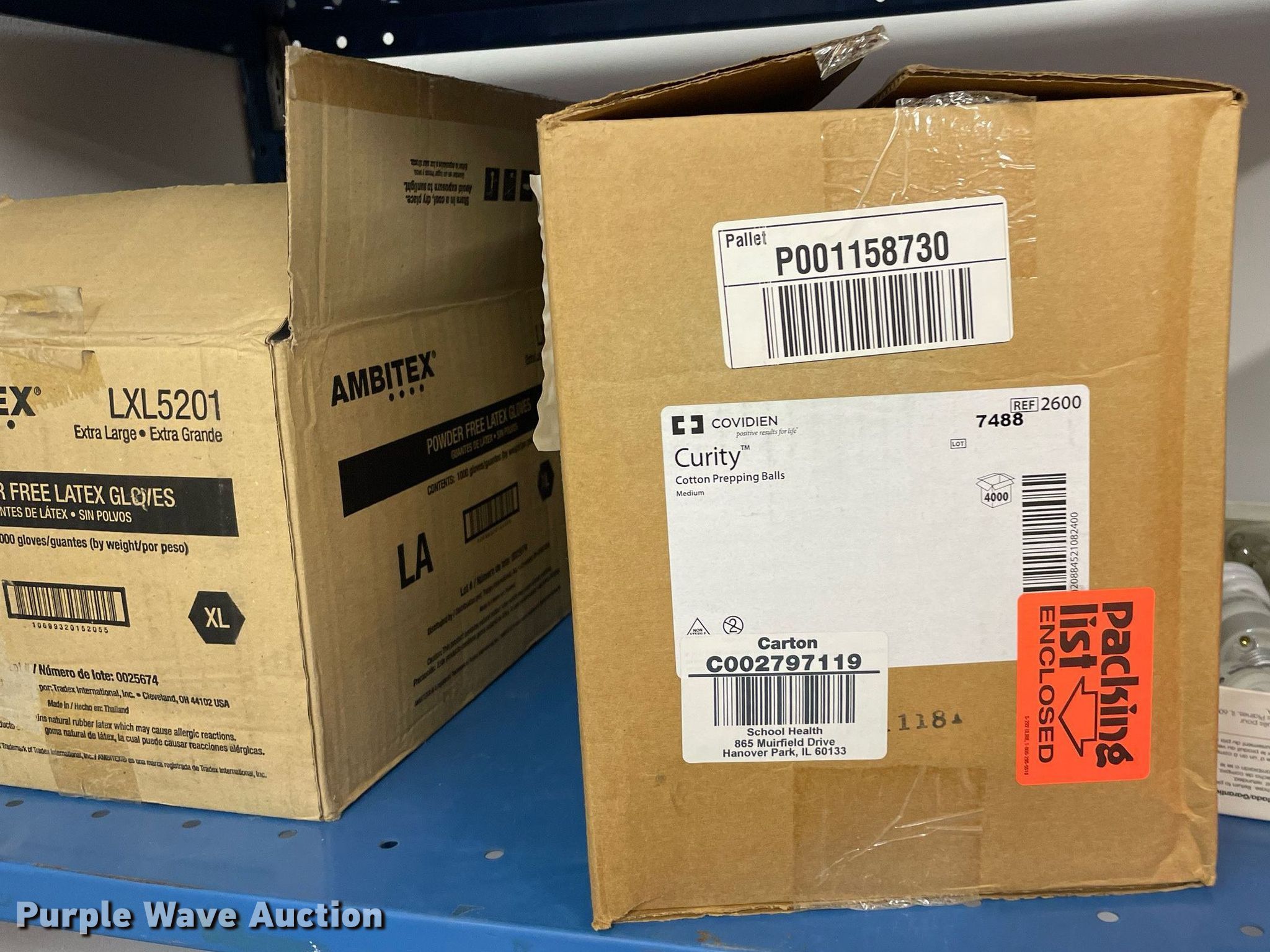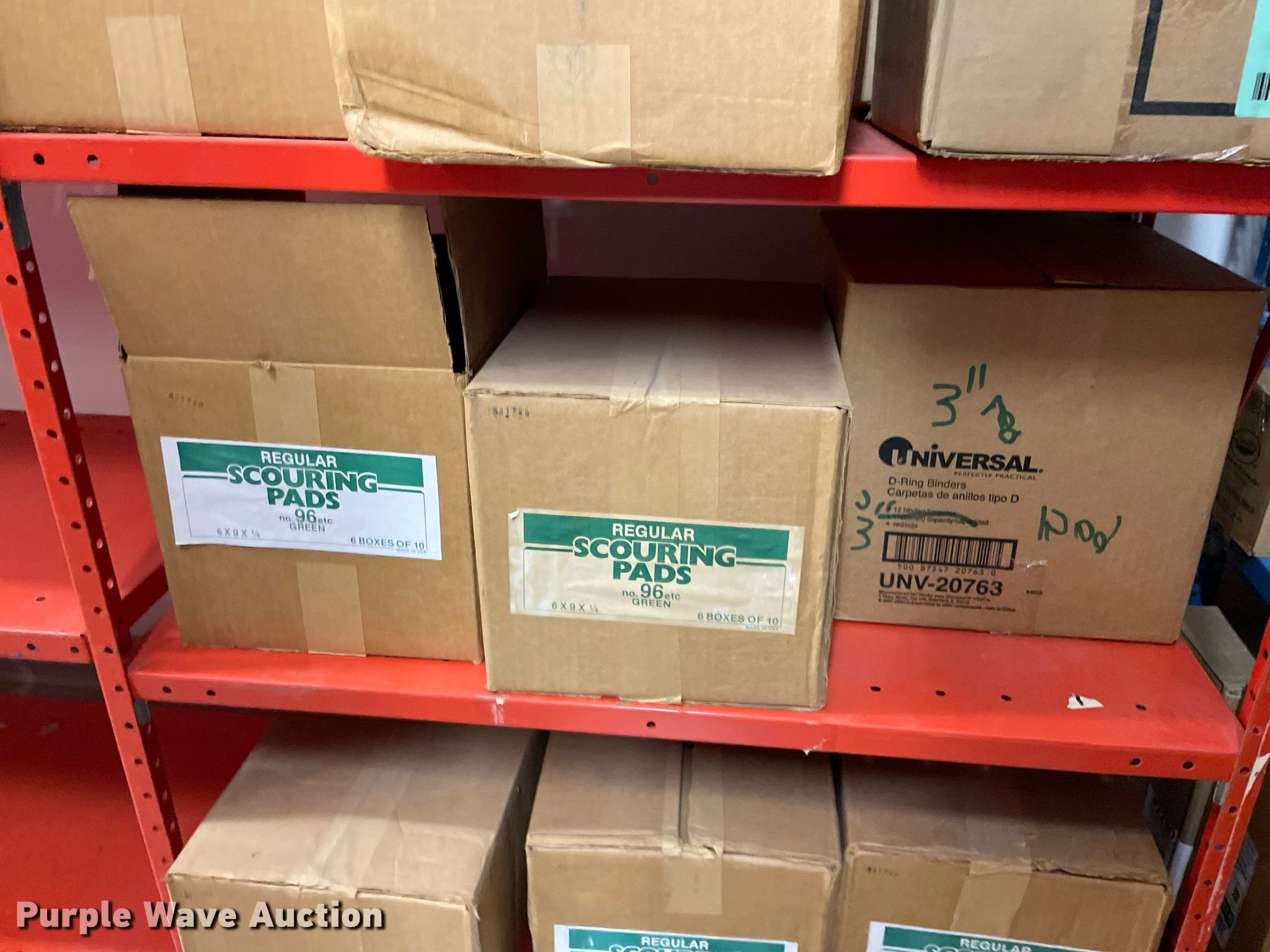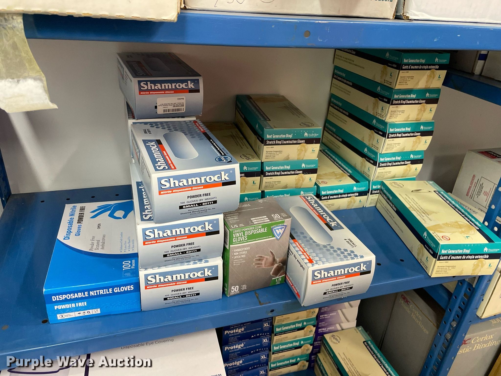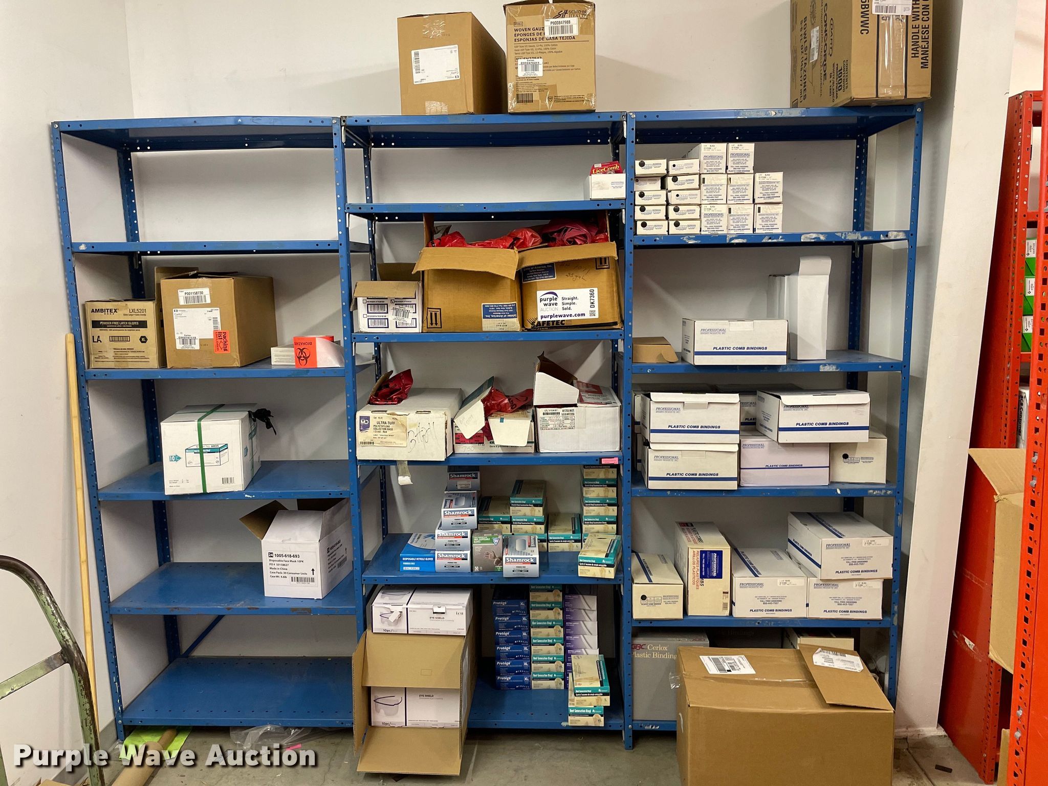 Purple Wave is selling a used Office Supplies and Equip. in Kansas. This item is a Office supplies with the following: Gloves, Cotton balls, Infectious waste bags, Plastic cutlery, Hot/Cold packs, Foam cups, Bleach, Soap, Paint, Floor brushes, Binders and more