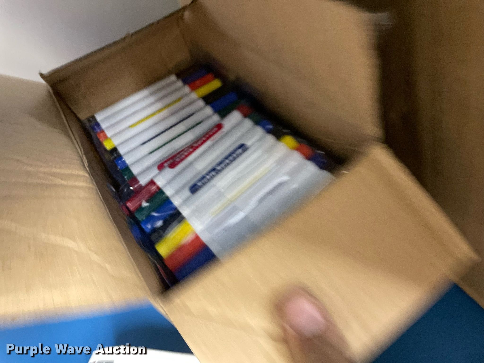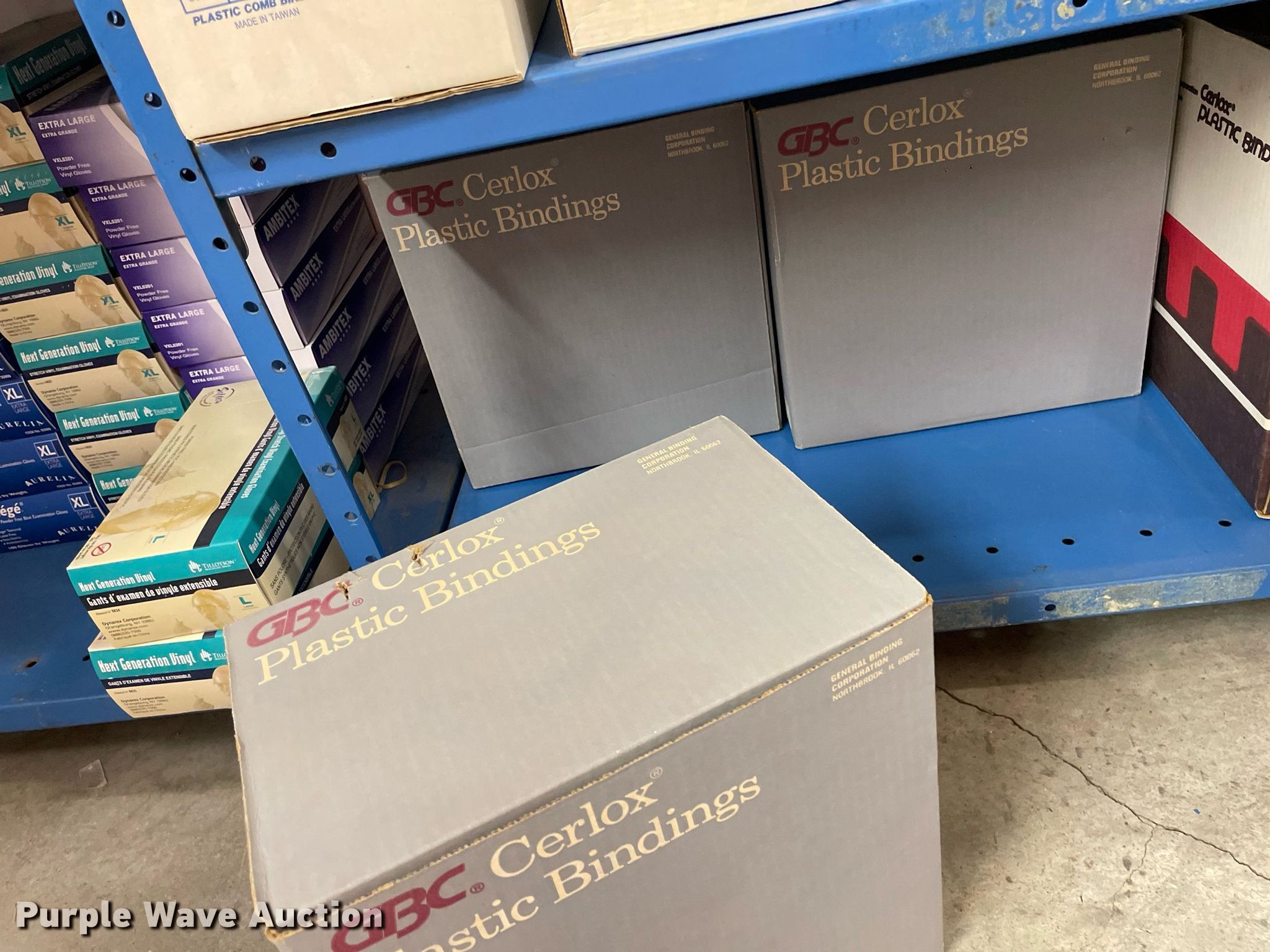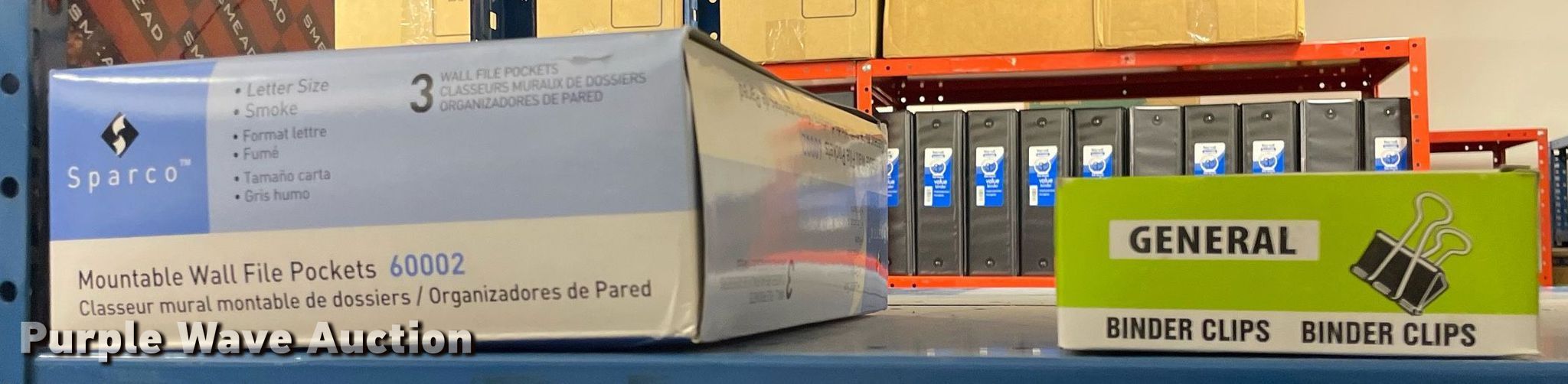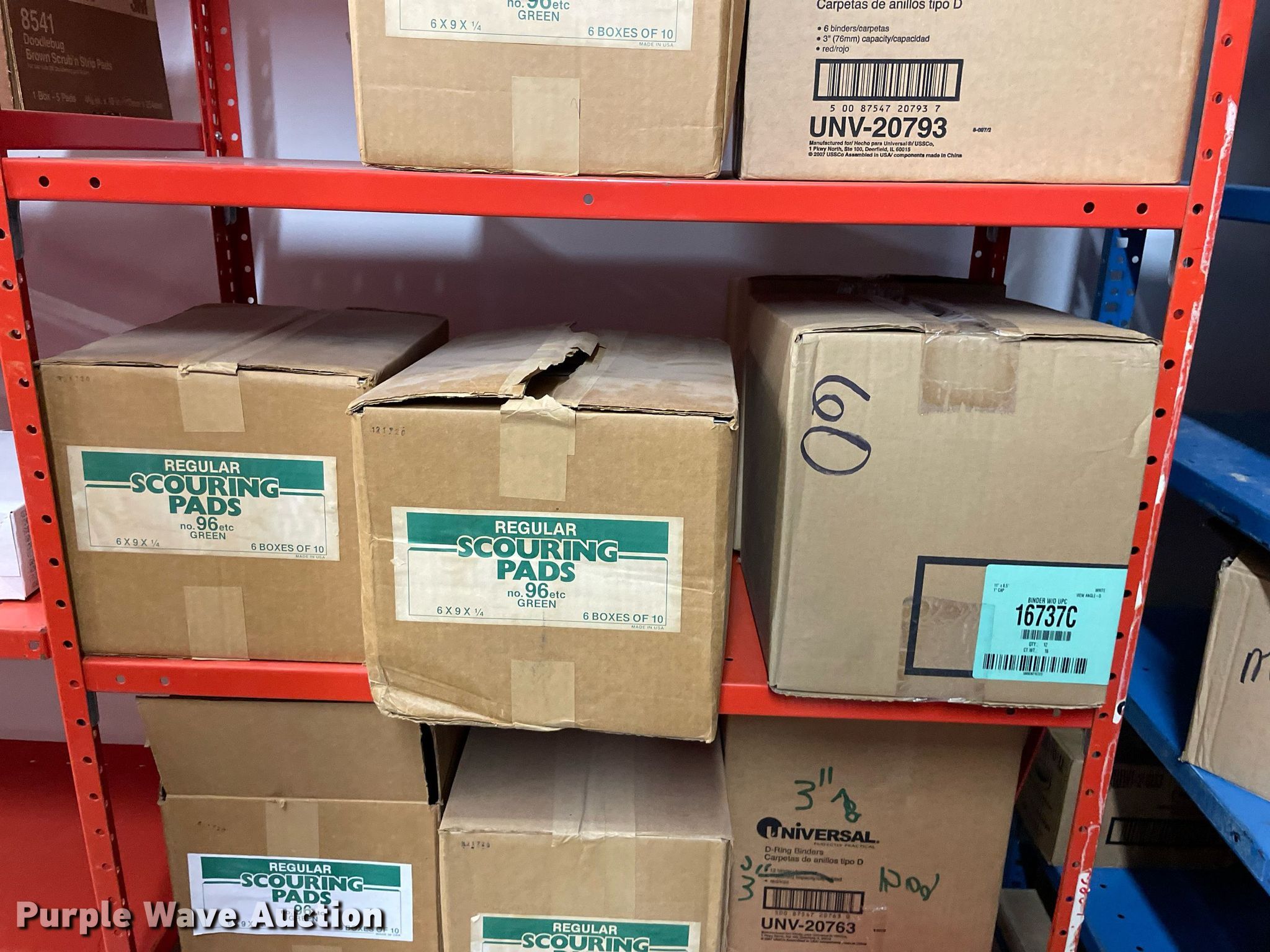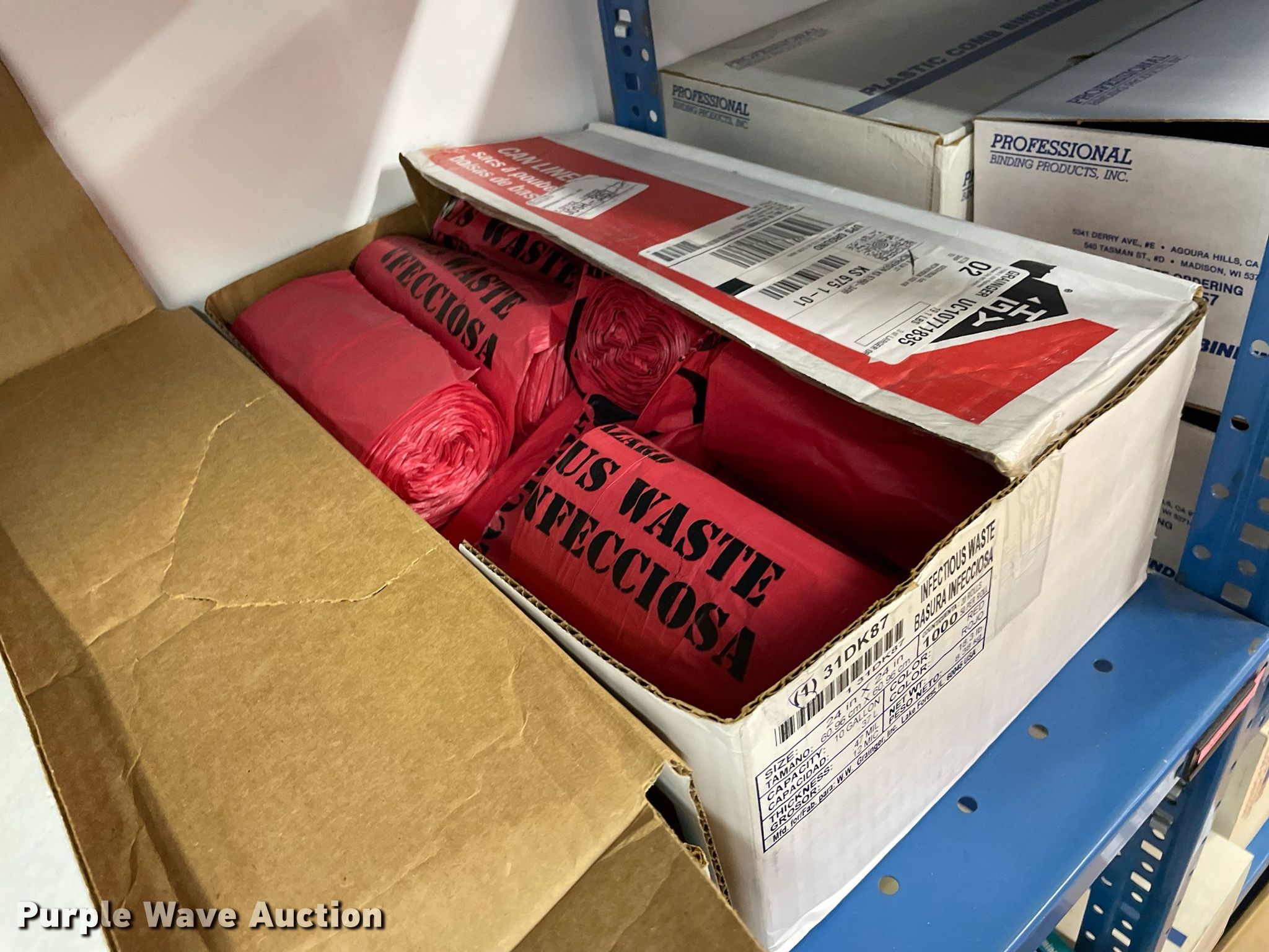 Purple Wave is selling a used Office Supplies and Equip. in Kansas. This item is a Office supplies with the following: Gloves, Cotton balls, Infectious waste bags, Plastic cutlery, Hot/Cold packs, Foam cups, Bleach, Soap, Paint, Floor brushes, Binders and more