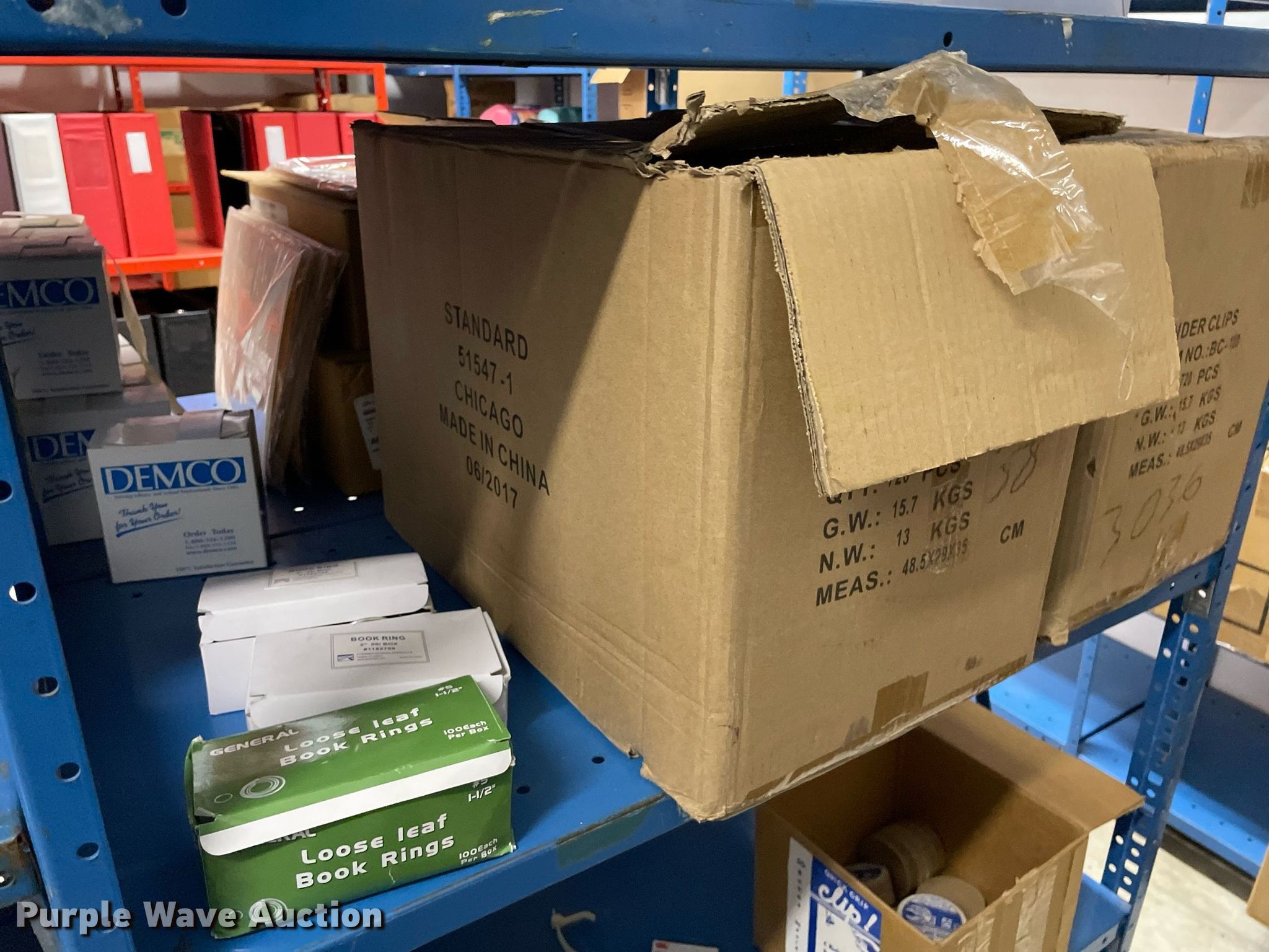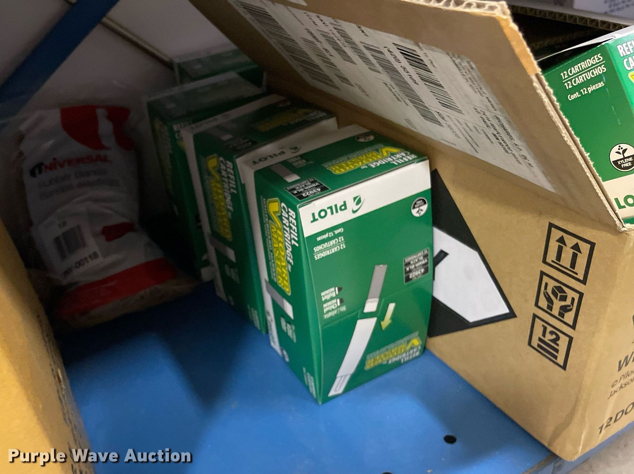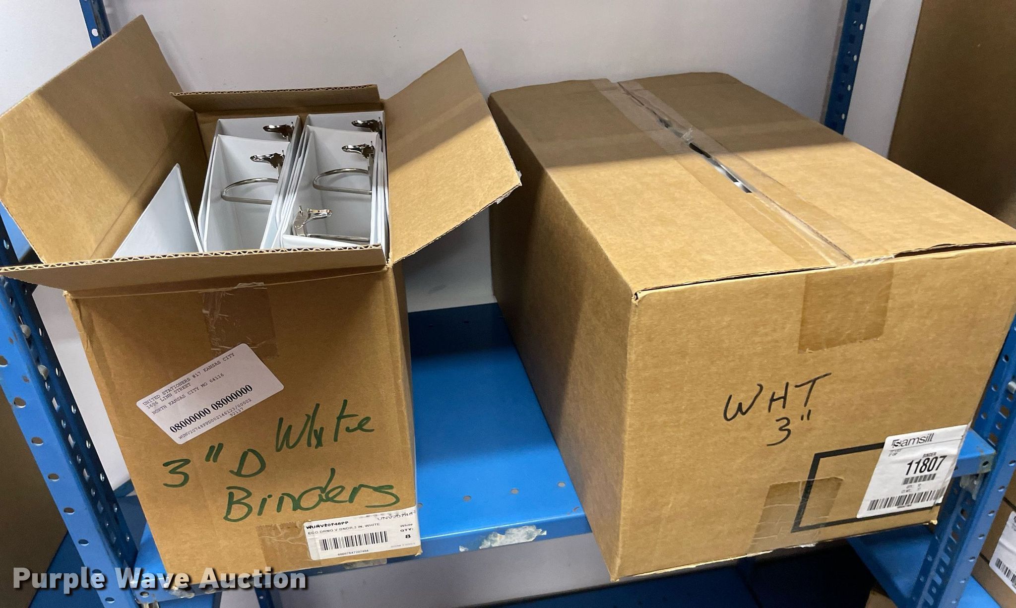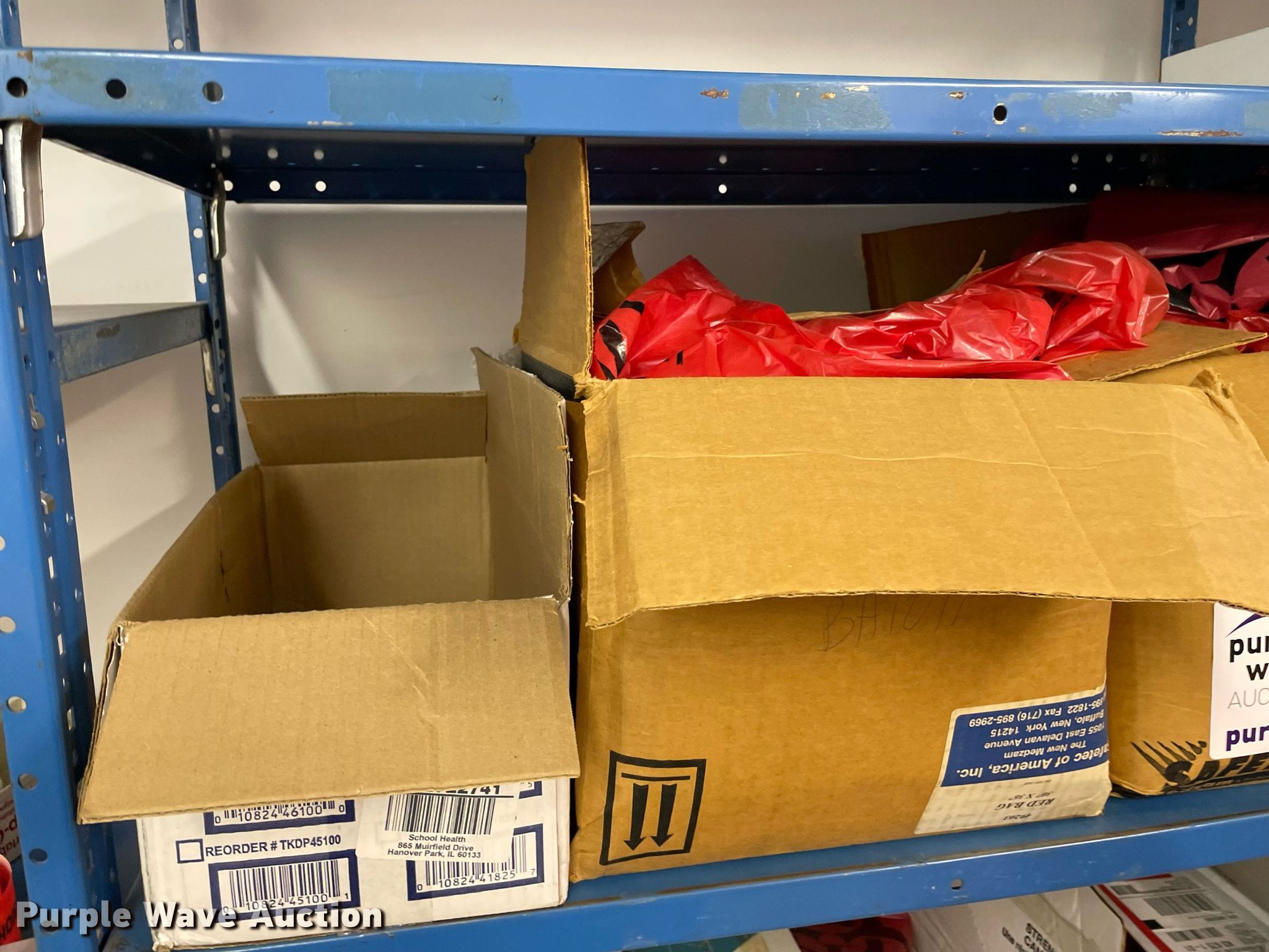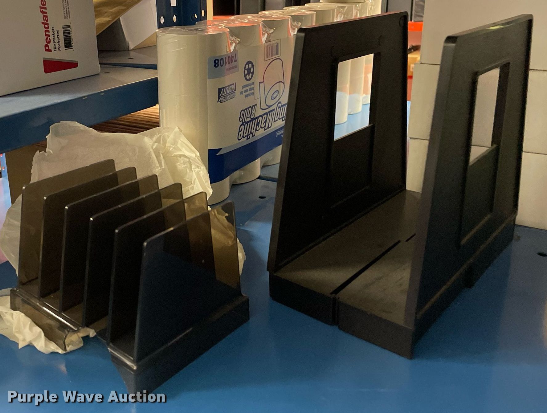 Purple Wave is selling a used Office Supplies and Equip. in Kansas. This item is a Office supplies with the following: Gloves, Cotton balls, Infectious waste bags, Plastic cutlery, Hot/Cold packs, Foam cups, Bleach, Soap, Paint, Floor brushes, Binders and more