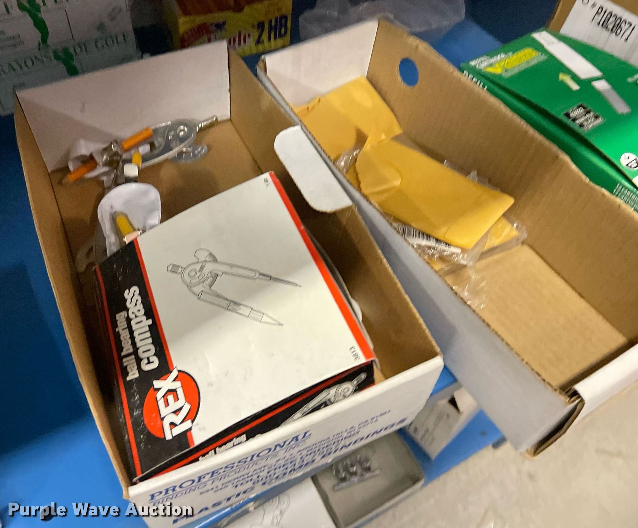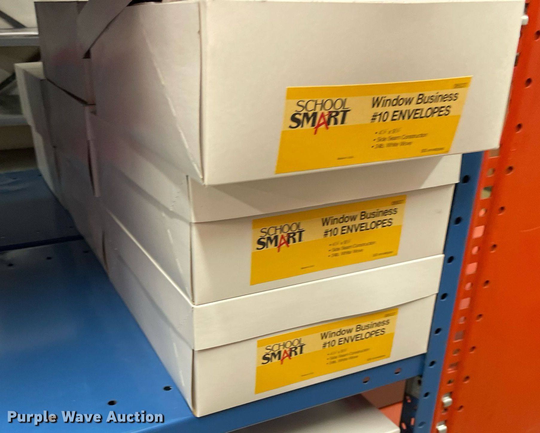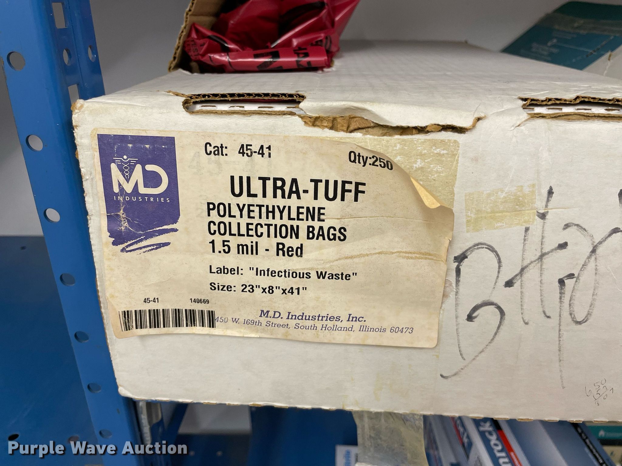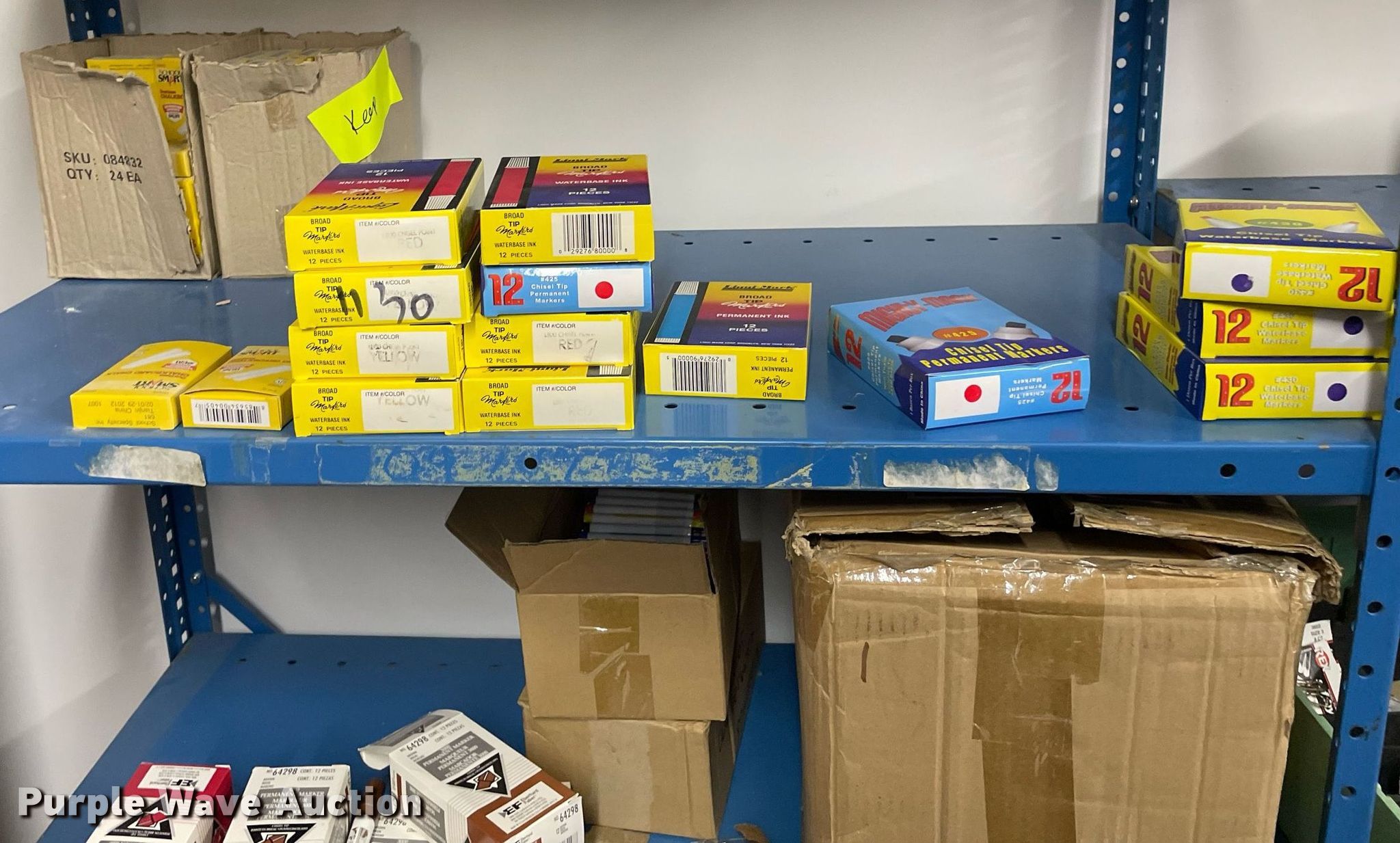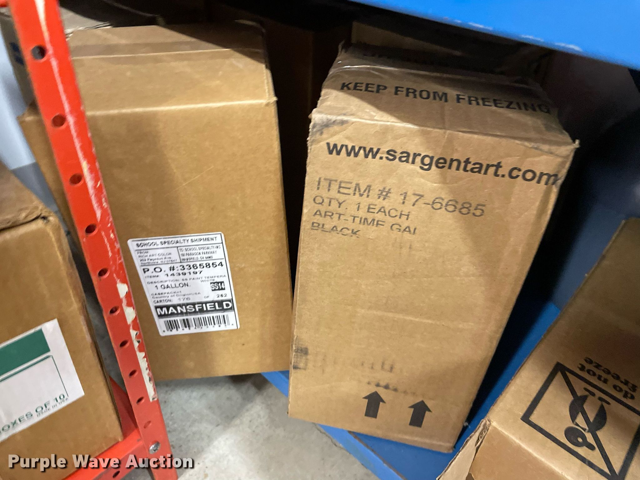 Purple Wave is selling a used Office Supplies and Equip. in Kansas. This item is a Office supplies with the following: Gloves, Cotton balls, Infectious waste bags, Plastic cutlery, Hot/Cold packs, Foam cups, Bleach, Soap, Paint, Floor brushes, Binders and more