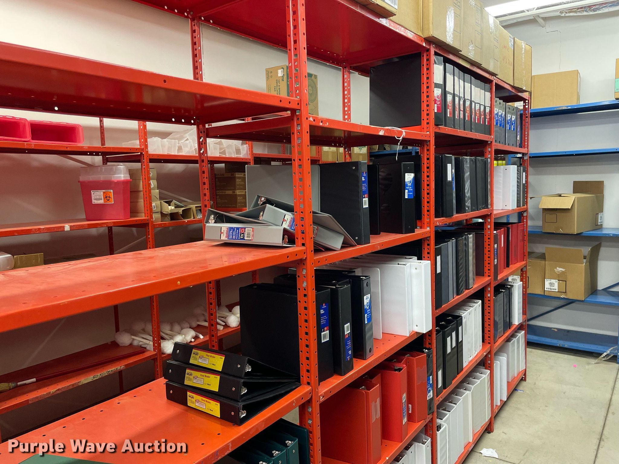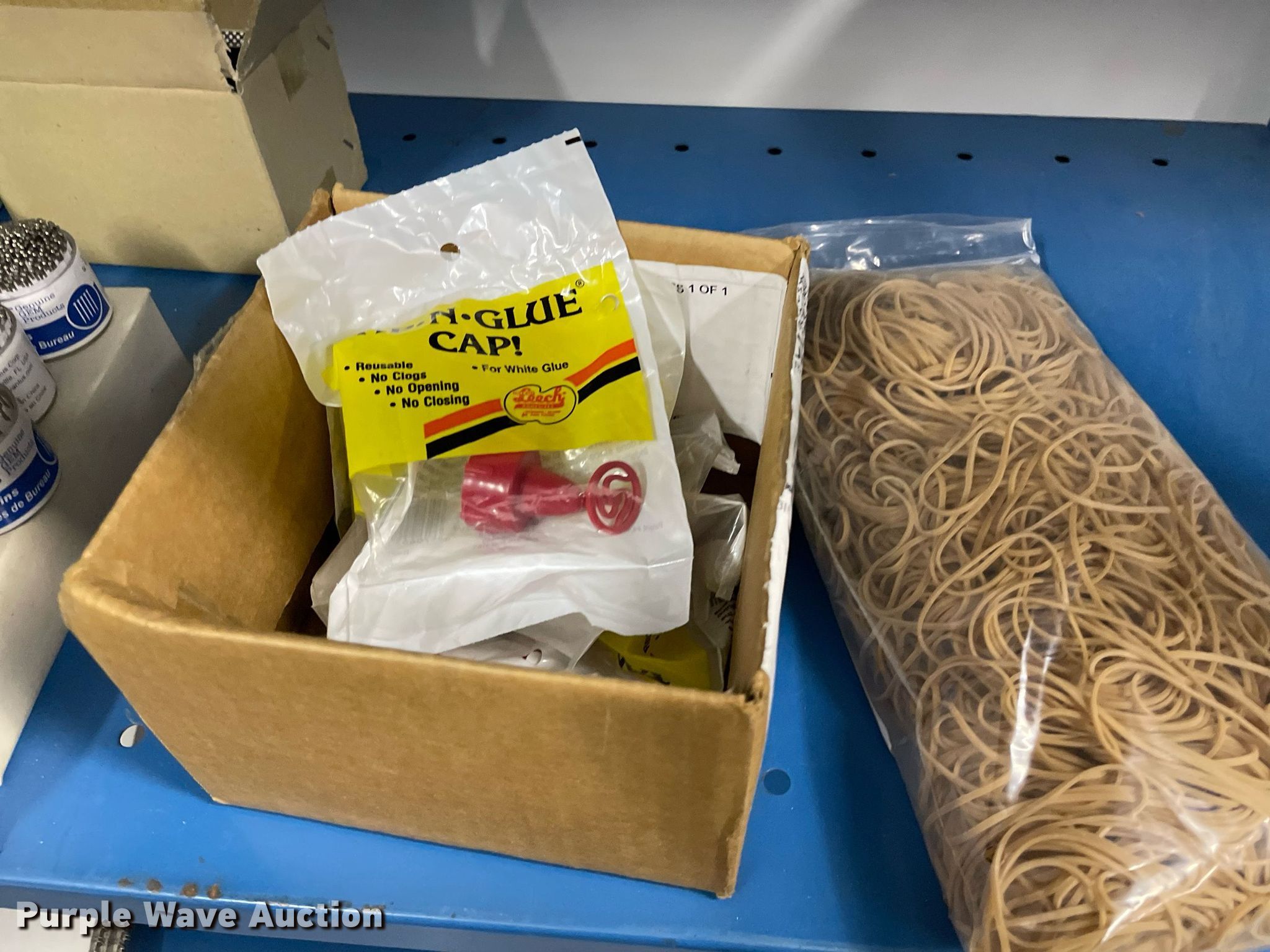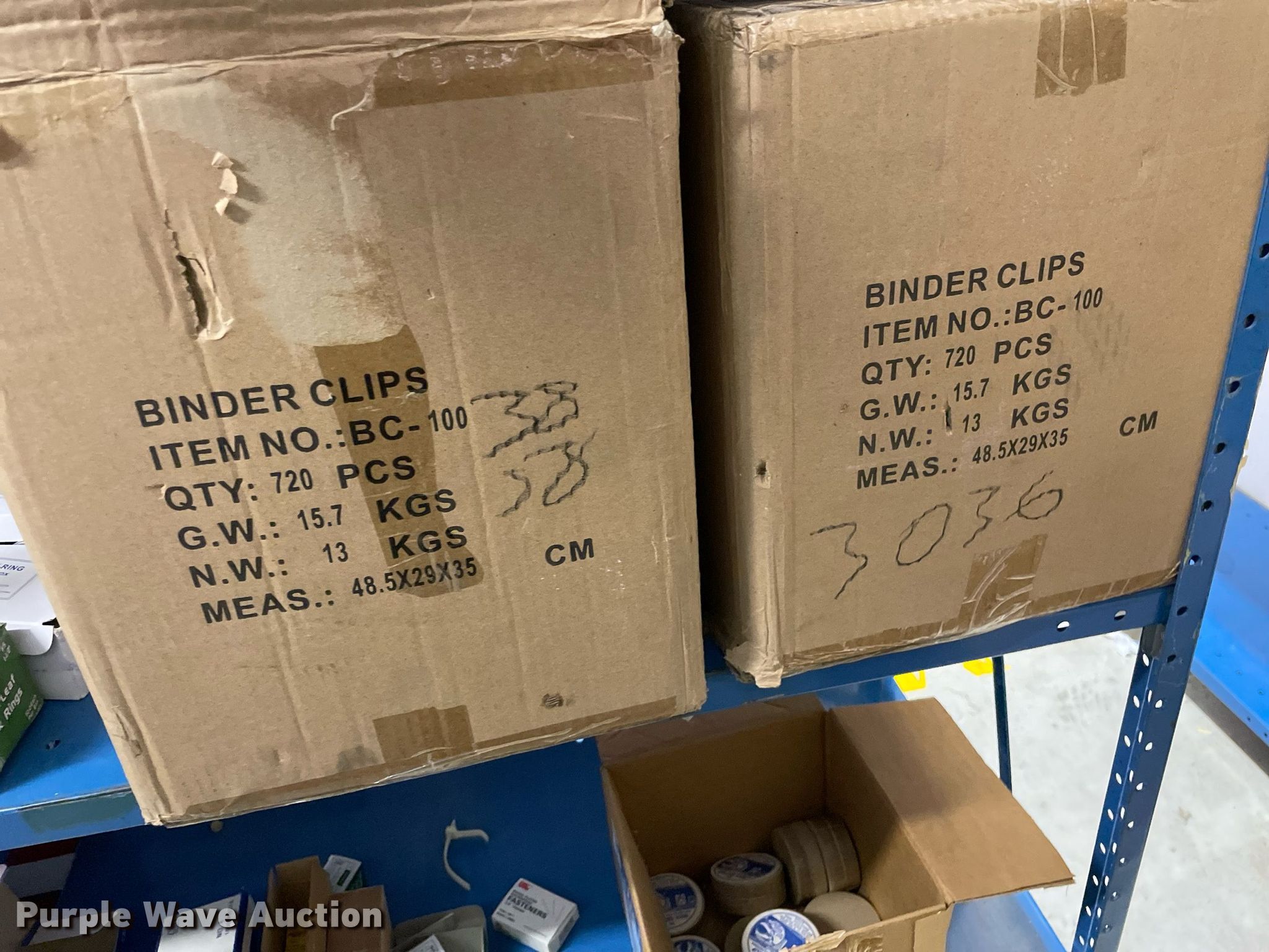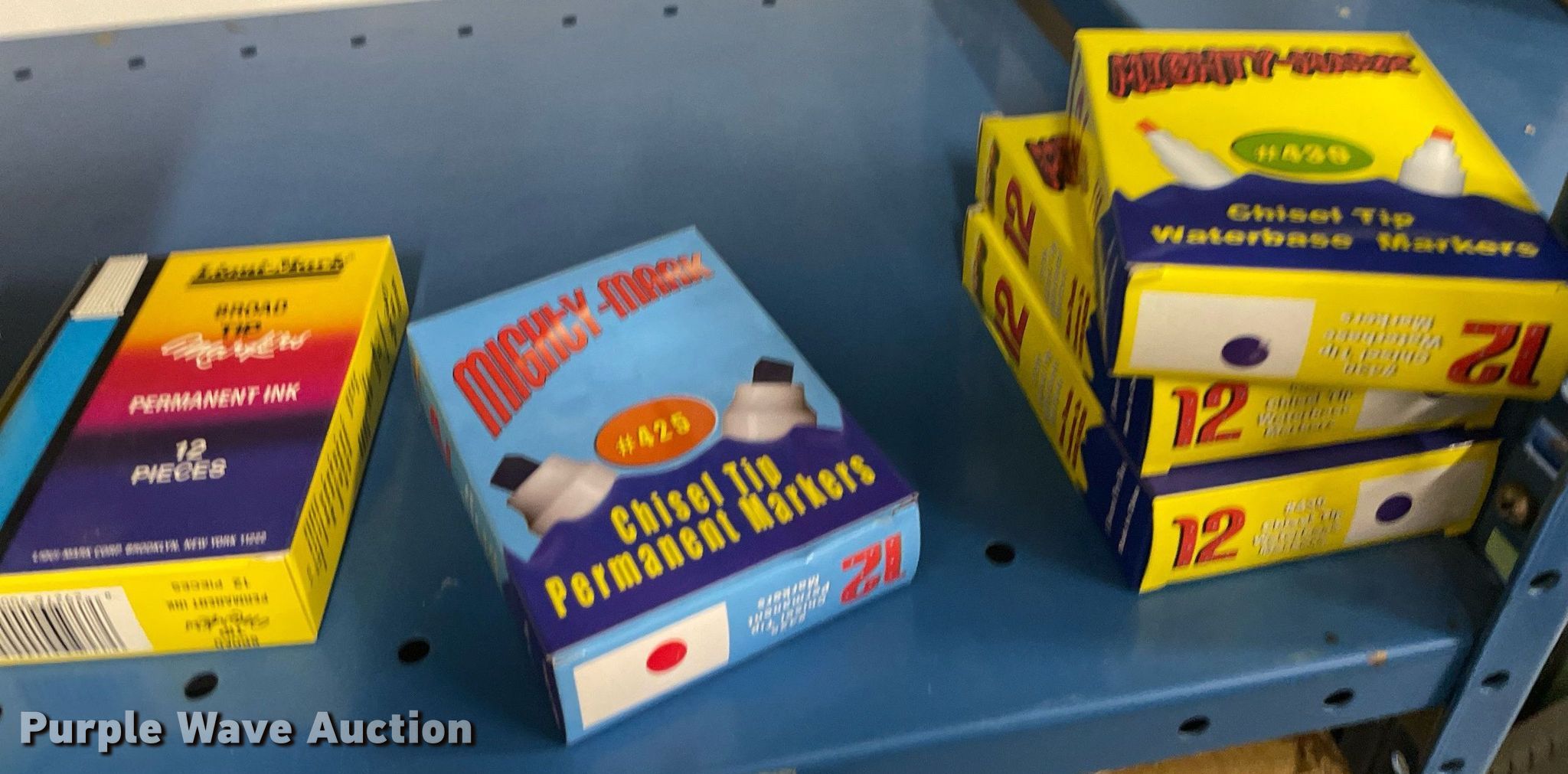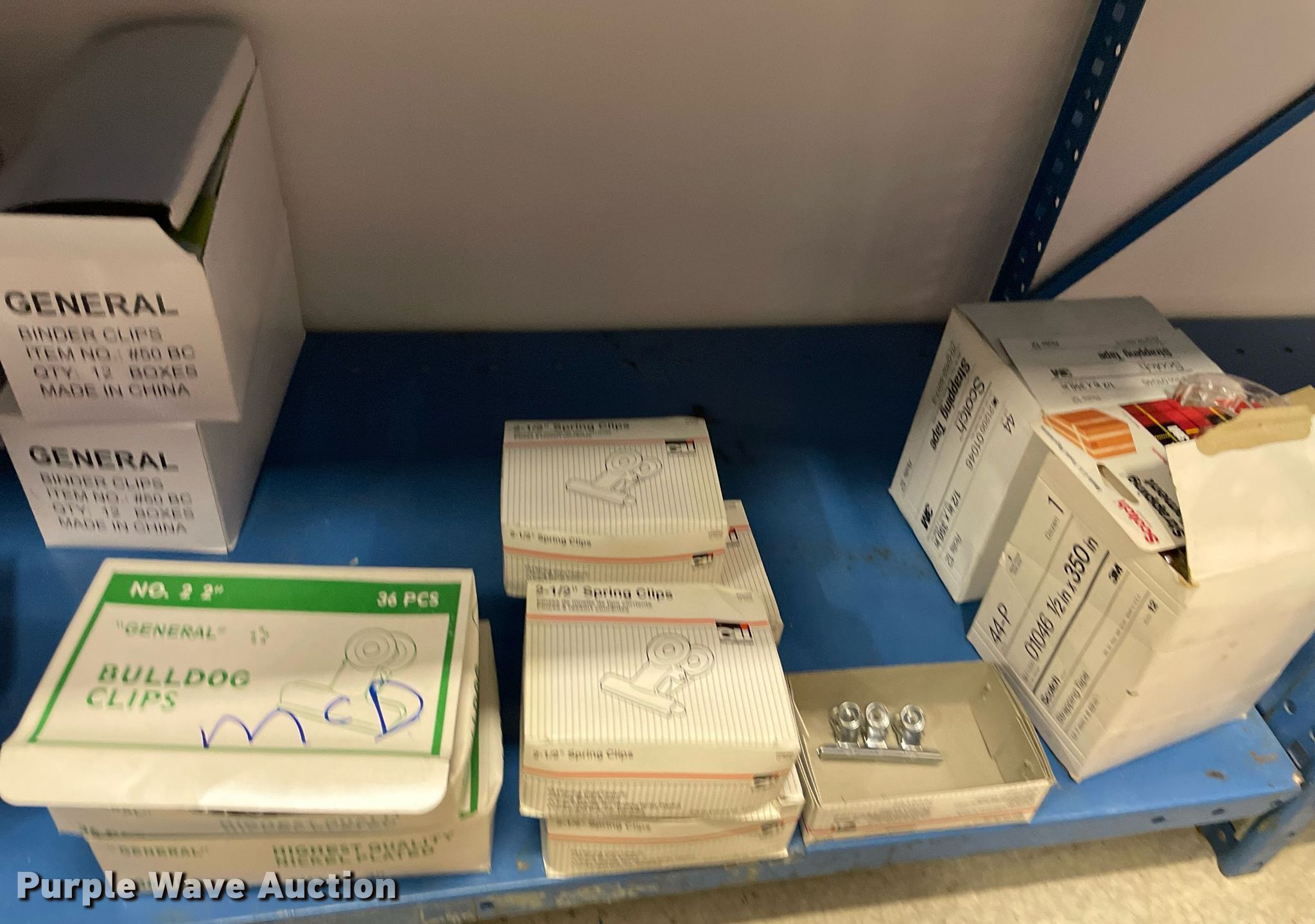 Purple Wave is selling a used Office Supplies and Equip. in Kansas. This item is a Office supplies with the following: Gloves, Cotton balls, Infectious waste bags, Plastic cutlery, Hot/Cold packs, Foam cups, Bleach, Soap, Paint, Floor brushes, Binders and more