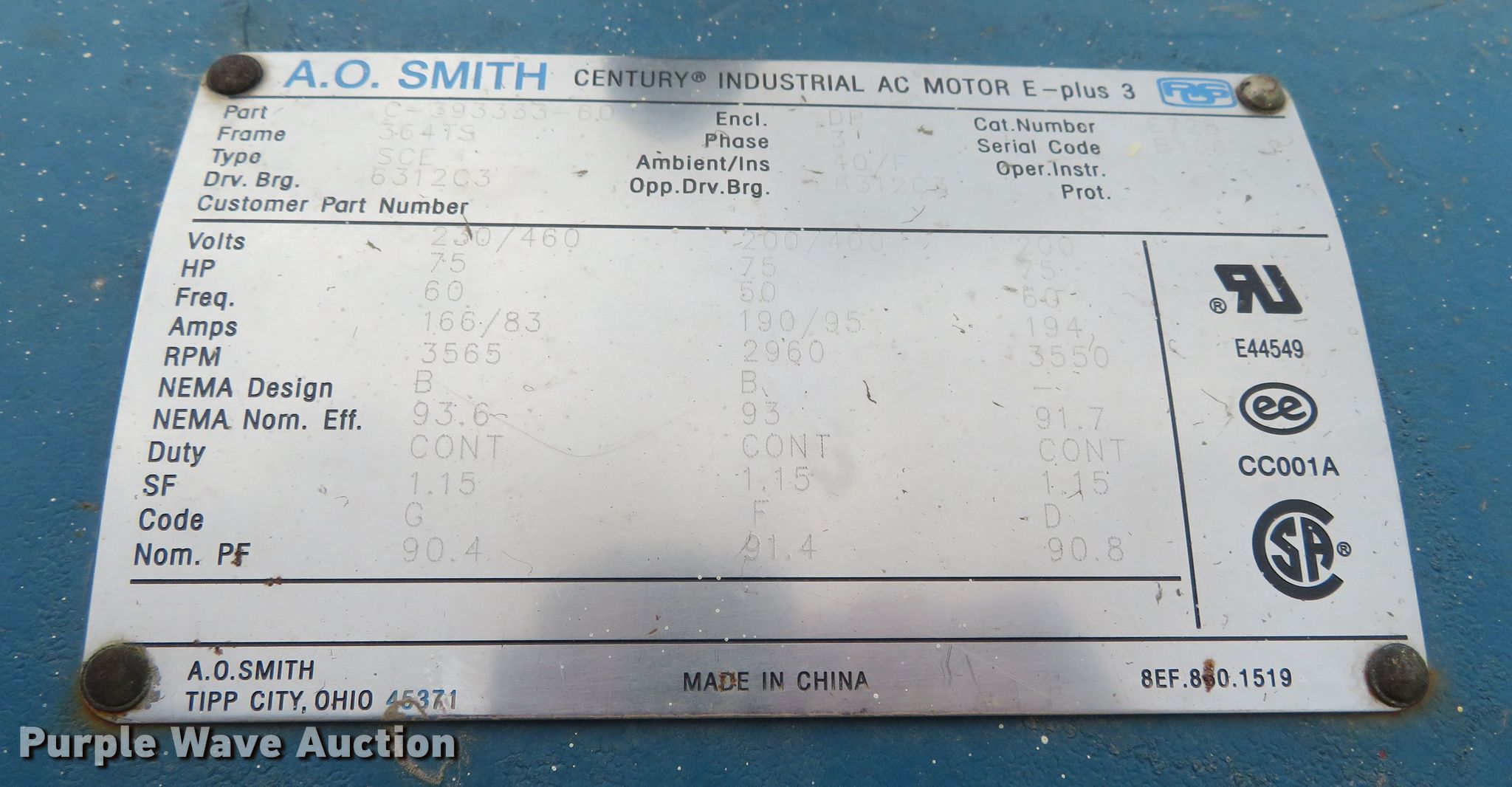 Hoffman 38308C2 blower. Serial: 1074211-RB1. Electric motor HP: 75, Volts: 230/460, Phase: Three. Notes Unknown operating condition. City of Perryville. 304 S Kingshighway. Perryville, MO 63775