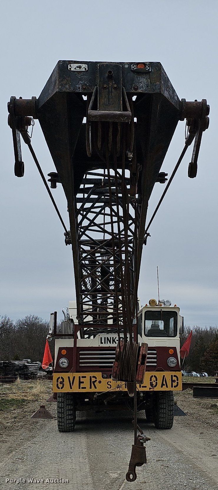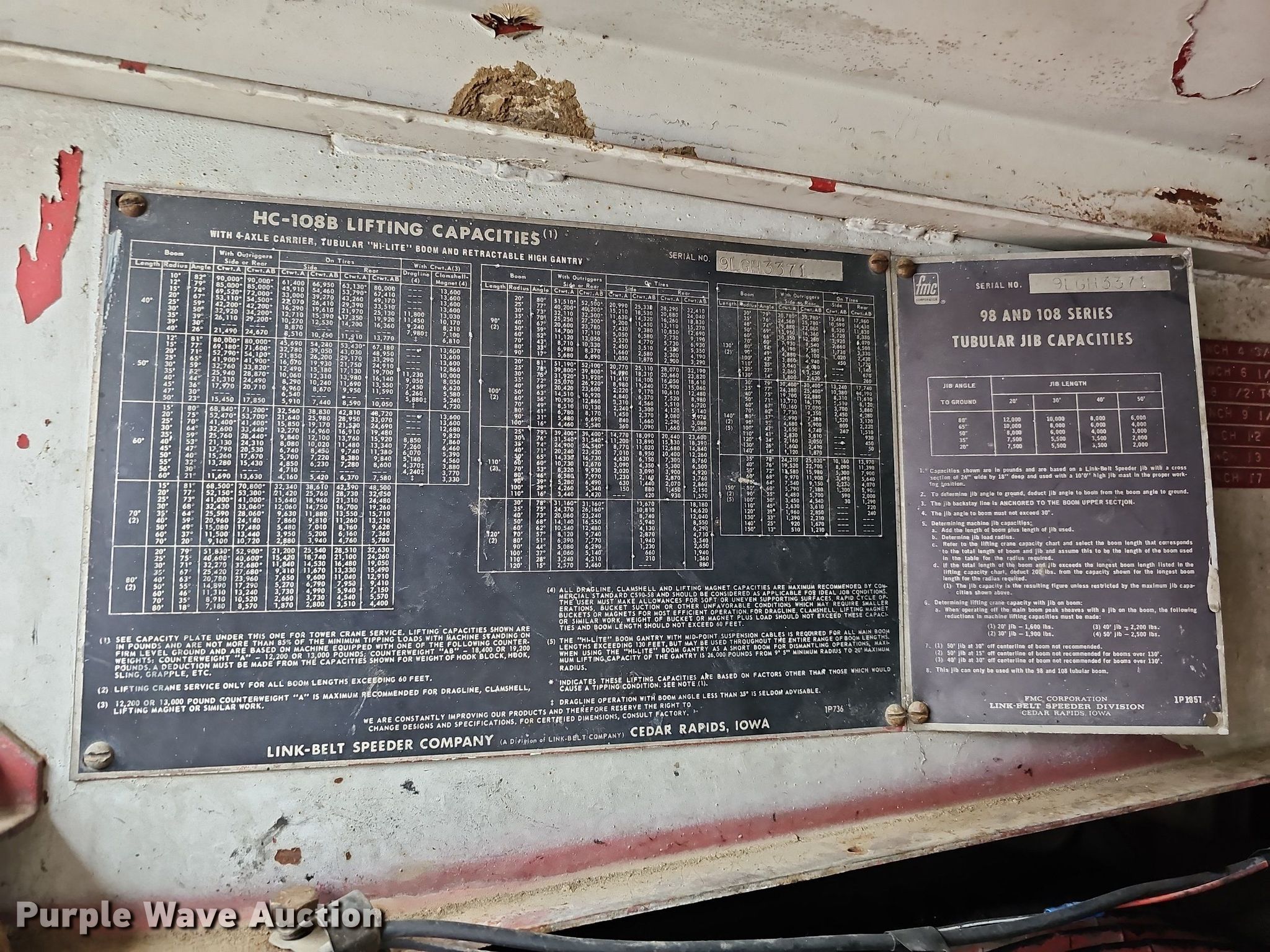 Link-Belt HC108-B crane. Miles: 26,242 on odometer, Serial: 49849. Engine Fuel type: Diesel. Upper engine Make: GM, Cylinders: 4, Engine hours: 2,949, Fuel type: Diesel. Transmission Manual, Speed: 13. Chassis Axles: Tandem, Suspension walking beam, Brakes: Air, Controls: Hydraulic actuated. Operators station Enclosed cab, Heat, Upper interior Heat, Crane controls: Stick. Features Boom HC-108B, Lattice, Maximum boom length: 40' Sections: 2, Maximum lift capacity: 90,000 lbs, Maximum lift height: 120', Stabilizers: 4, Boom controls In-cab, Boom dolly 11'6" L x 96" W, Tires 11R24.5, 285/75R24.5, Winches: 2, Crane block Sheaves: 3, (3) 20' boom extensions, Lift chart, Single landing gear. Tires Size: 14.00R20. Notes Possible hydraulic leak under boom cab. Transfer of ownership documentation will be a bill of sale which will be assigned and distributed by the seller. Harrison County Missouri. 31998 West 200th Avenue. Bethany, MO 64424