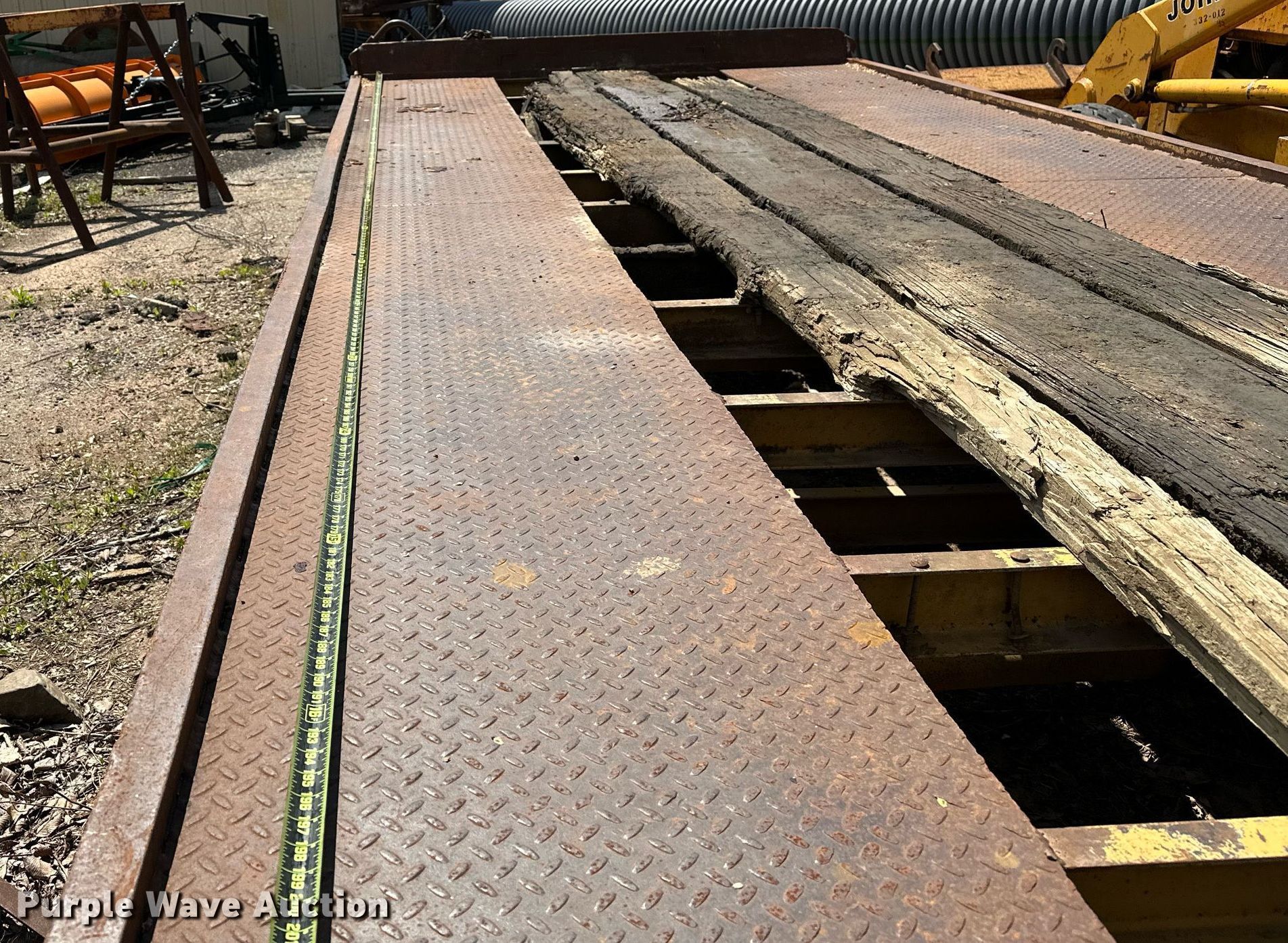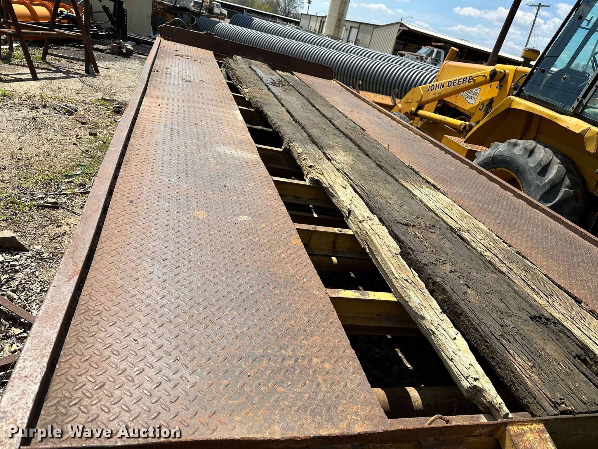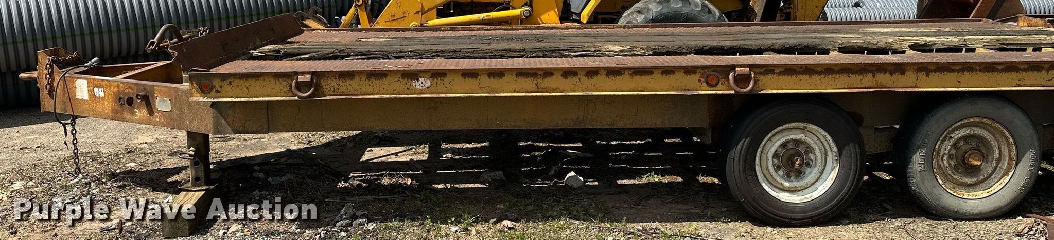 1990 Belshe equipment trailer. VIN: 16JF01836L1021470. Dimensions Overall: 28' 4" L x 94" W, Deck: 18' L x 90" W, Tail length: 64", Ramps: Manual Length: 4'. Features Deck type: Steel, Wood. Chassis Hitch: Pintle, Landing gear: Single, Two speed, Suspension: Spring, Brakes: Electric, Axles: Triple. Tires Steel wheels, Size: 225/75R16. Notes Non-operational brakes. Oklahoma title. Title distribution may be delayed up to 30 days from verification of funds. LeFlore County. 650 Main Street. Heavener, OK 74937