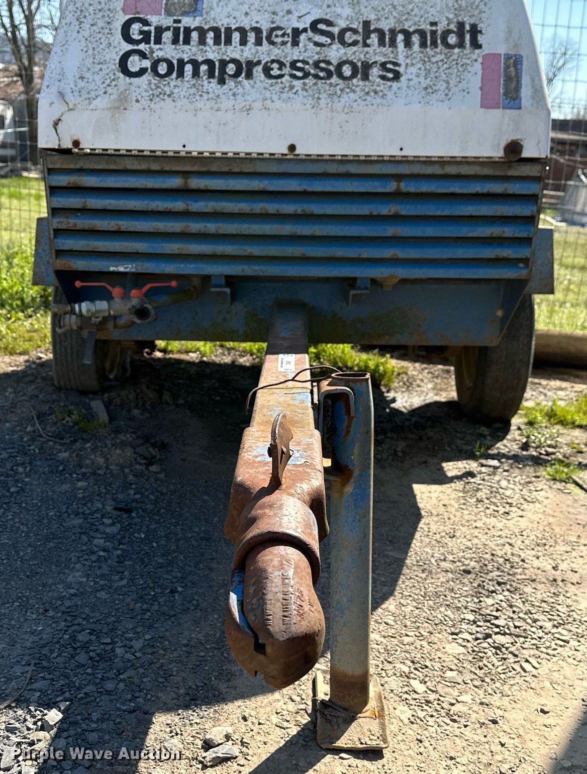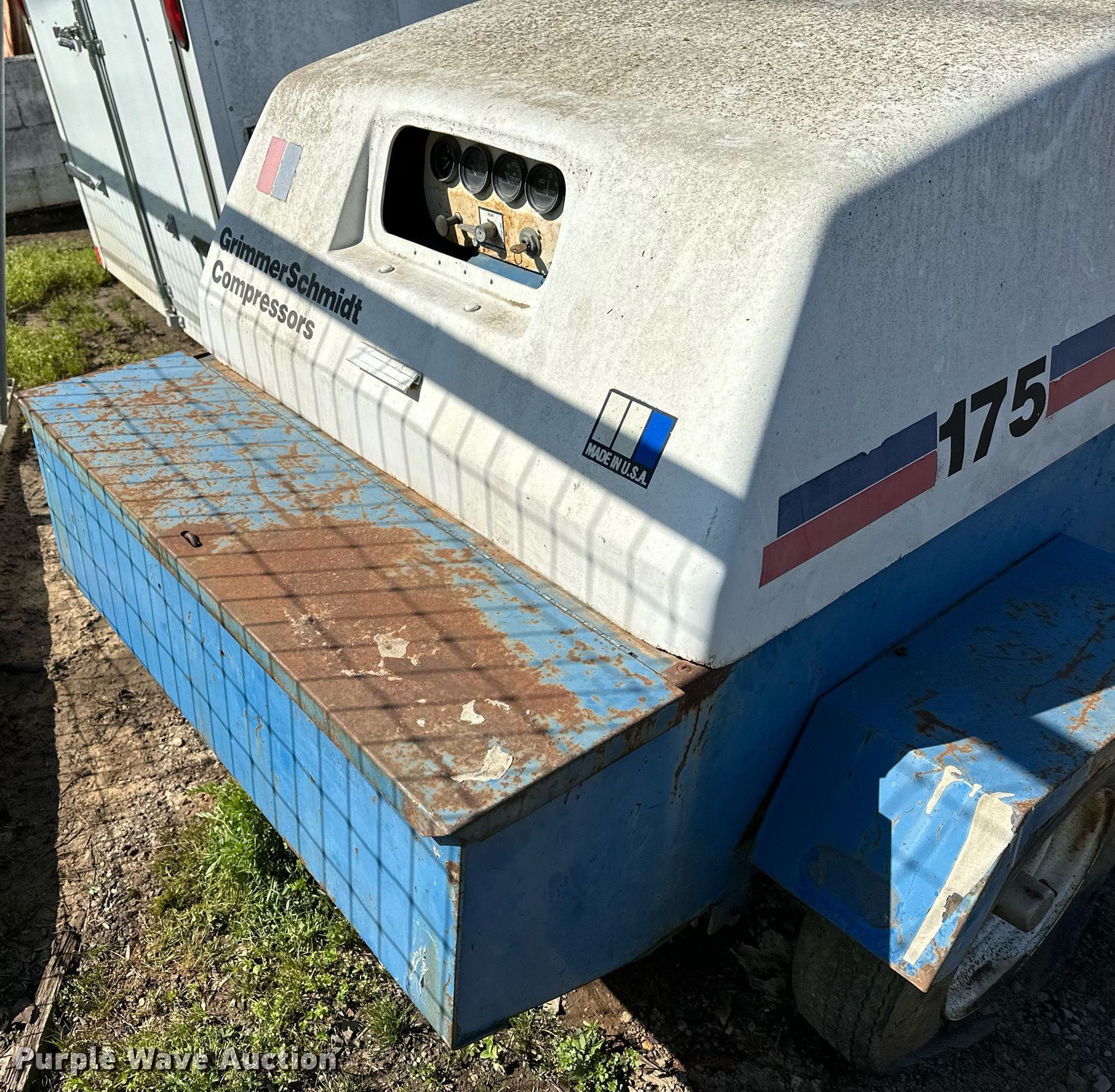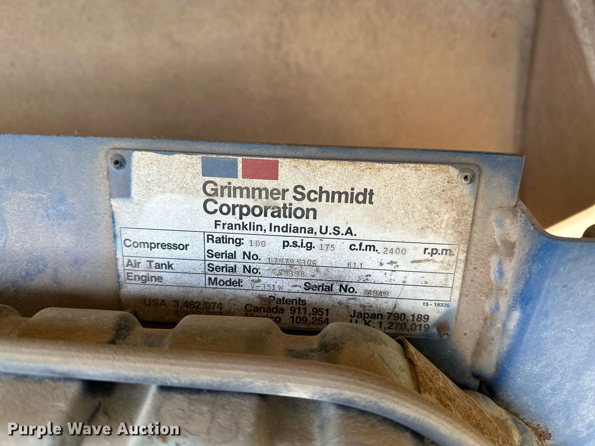 Grimmer Schmidt 175 air compressor. Hours: 589 on meter, Serial: 175795306. Engine Model: Y-351W, Serial: 04949, Cylinders: 4, Fuel type: Gas. Features Air compressor Grimmer Schmidt 175, CFM: 2,400, PSI: 175. Trailer 11' L x 60" W, Ball hitch size: 2", Suspension: Spring, Axles: Single, Tire size: 78-13. Notes Flat tire. This is worksite support equipment and will not come with a title. Transfer of ownership documentation will be a bill of sale. LeFlore County. 650 Main Street. Heavener, OK 74937