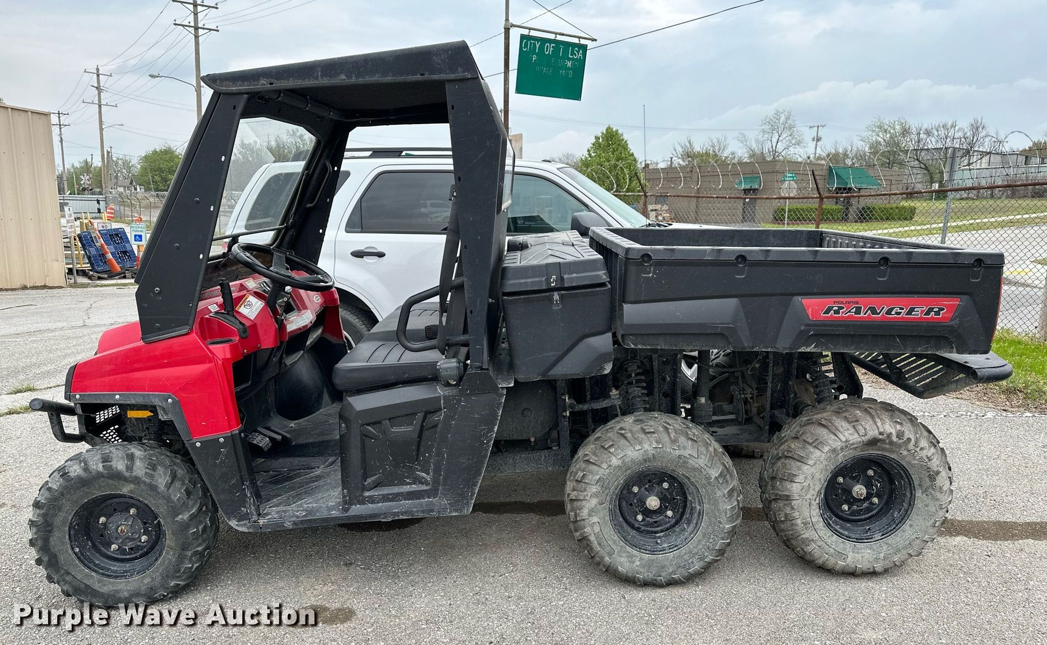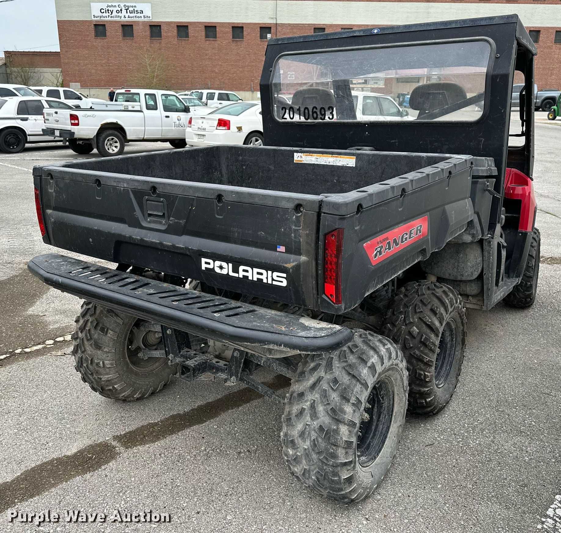 2010 Polaris Ranger utility vehicle. Miles: 1,832 on odometer, Hours: 511 on meter, VIN: 4XAHR76AOA4194306, Unit #: 721. Engine Cylinders: 2, Fuel type: Gas. Transmission Automatic. Chassis All wheel drive. Operators station Canopy, Passengers: 3. Features Receiver hitch, Dump bed 44" L x 54" W, Dump bed type: Electric/ Hydraulic. Tires Front: 25X10-12, Rear: 25X11-12. Notes Dead battery, Engine issues Possible fuel solenoid issues, Non-operational unit. Transfer of ownership documentation will be a bill of sale. City of Tulsa, OK. 208 North Trenton Avenue. Tulsa, OK 74120