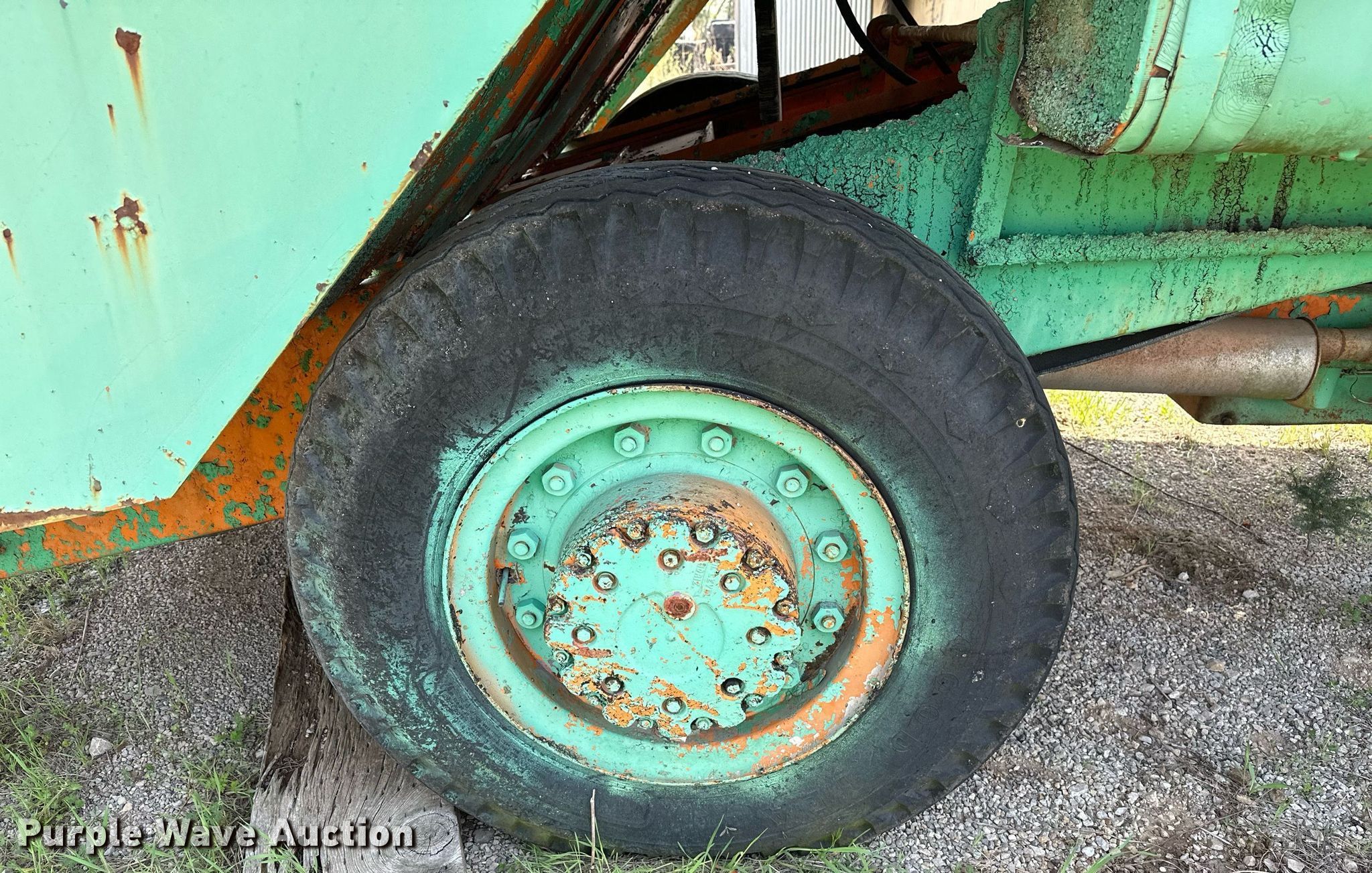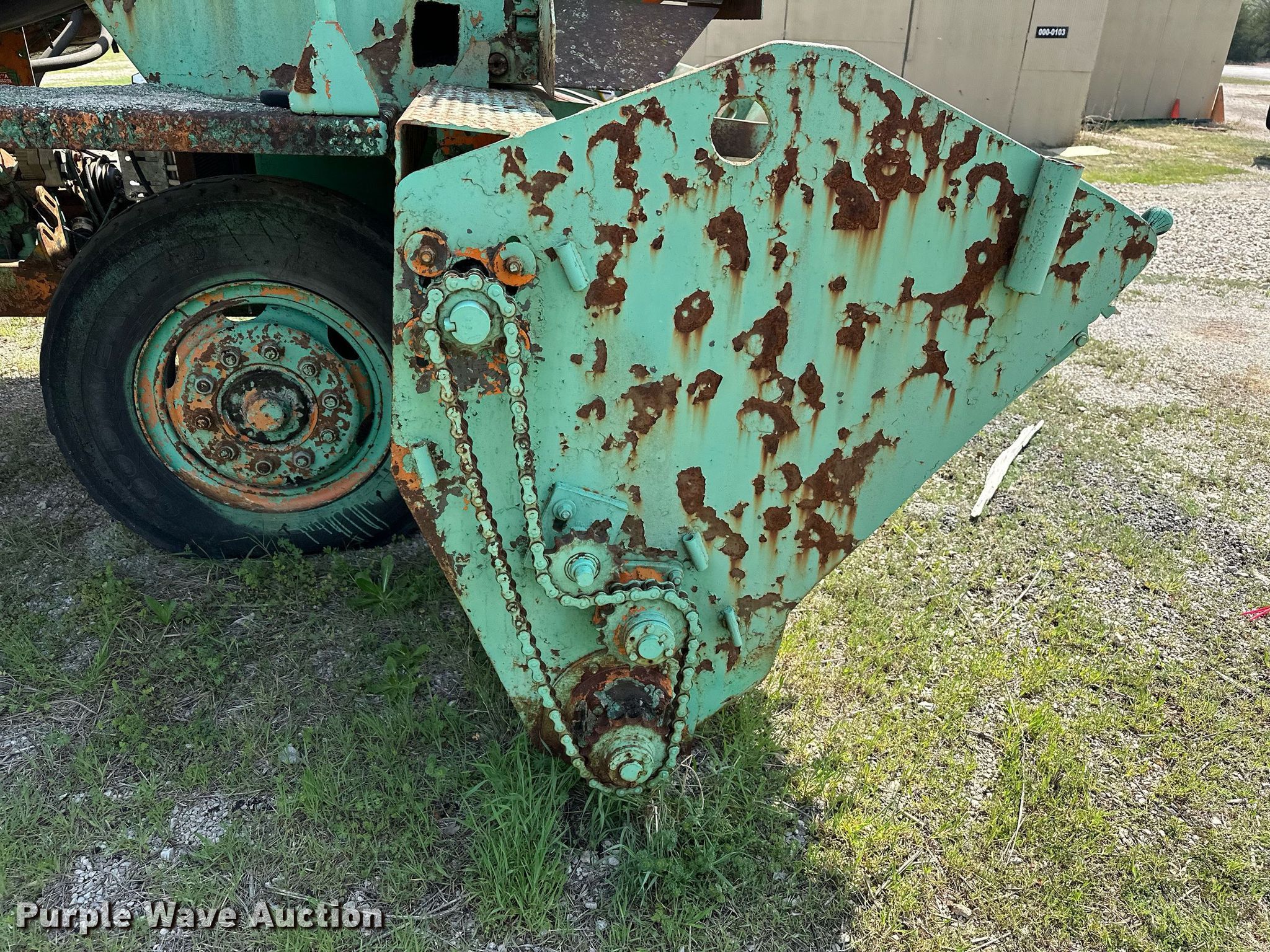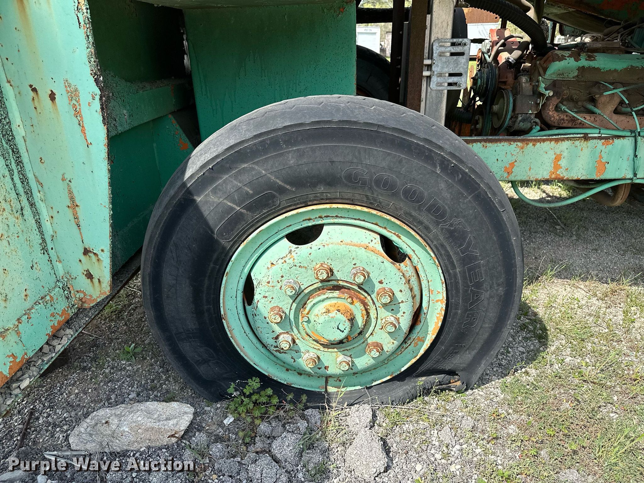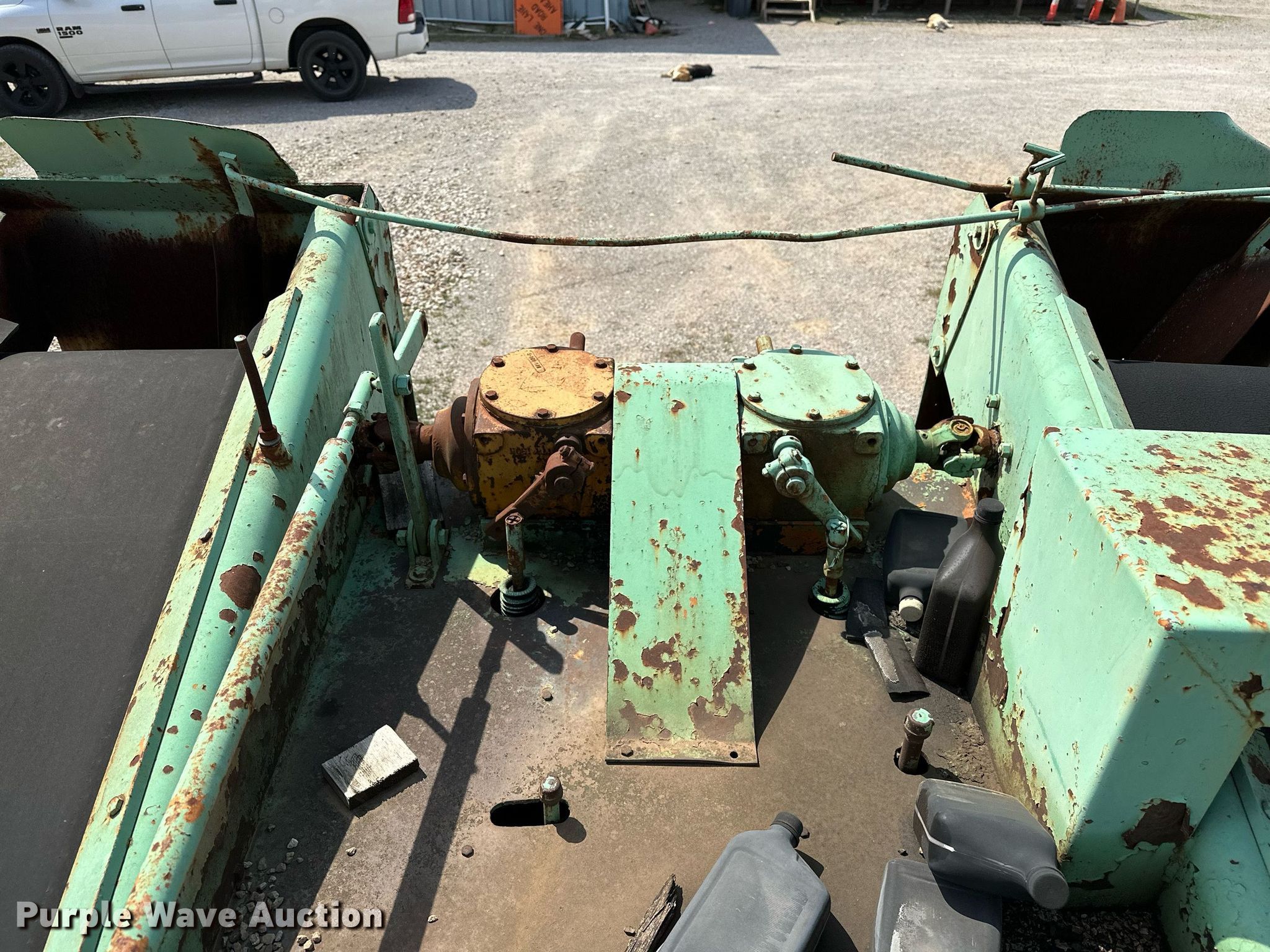 Koehring K chip spreader. Serial: 2091. Engine Cylinders: 8, Fuel type: Gas. Transmission Automatic. Features Front spread hopper width: 13', Material conveyor Width: 18", Truck hitch. Tires Front: 9.00R20, Rear: 10.00-20. Notes Flat tire, Non-operational unit. 120 Third St.. Maramec, OK 74045