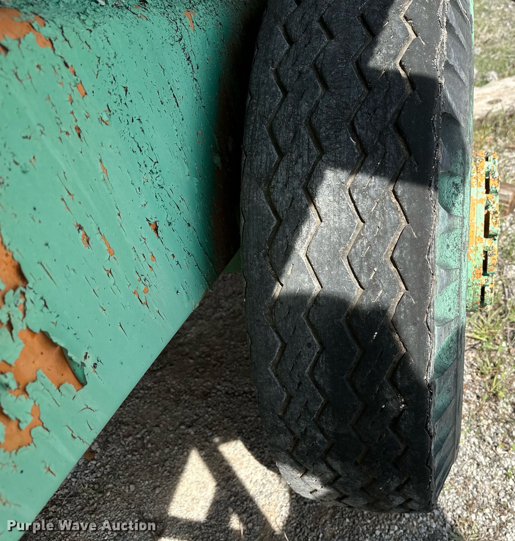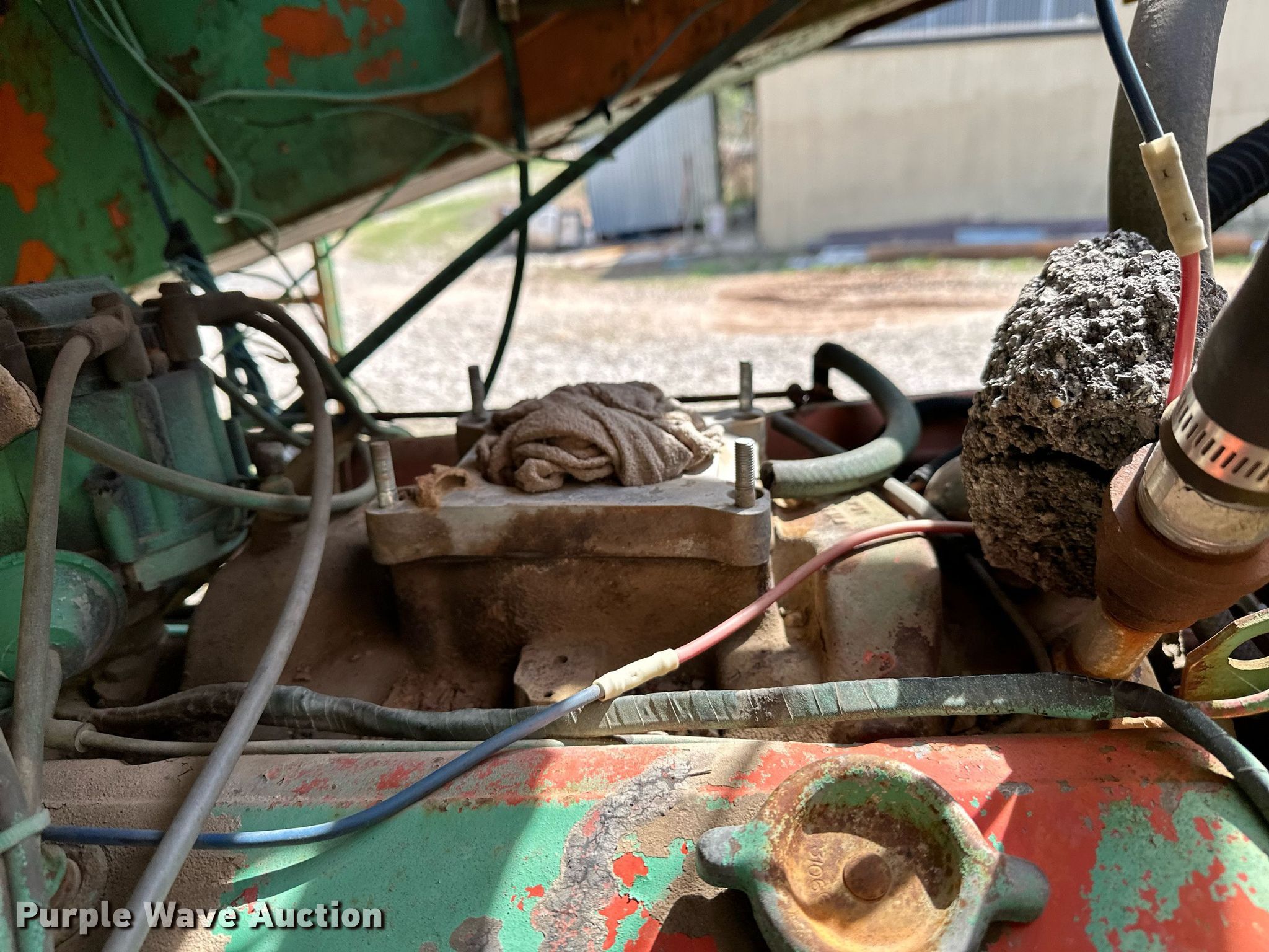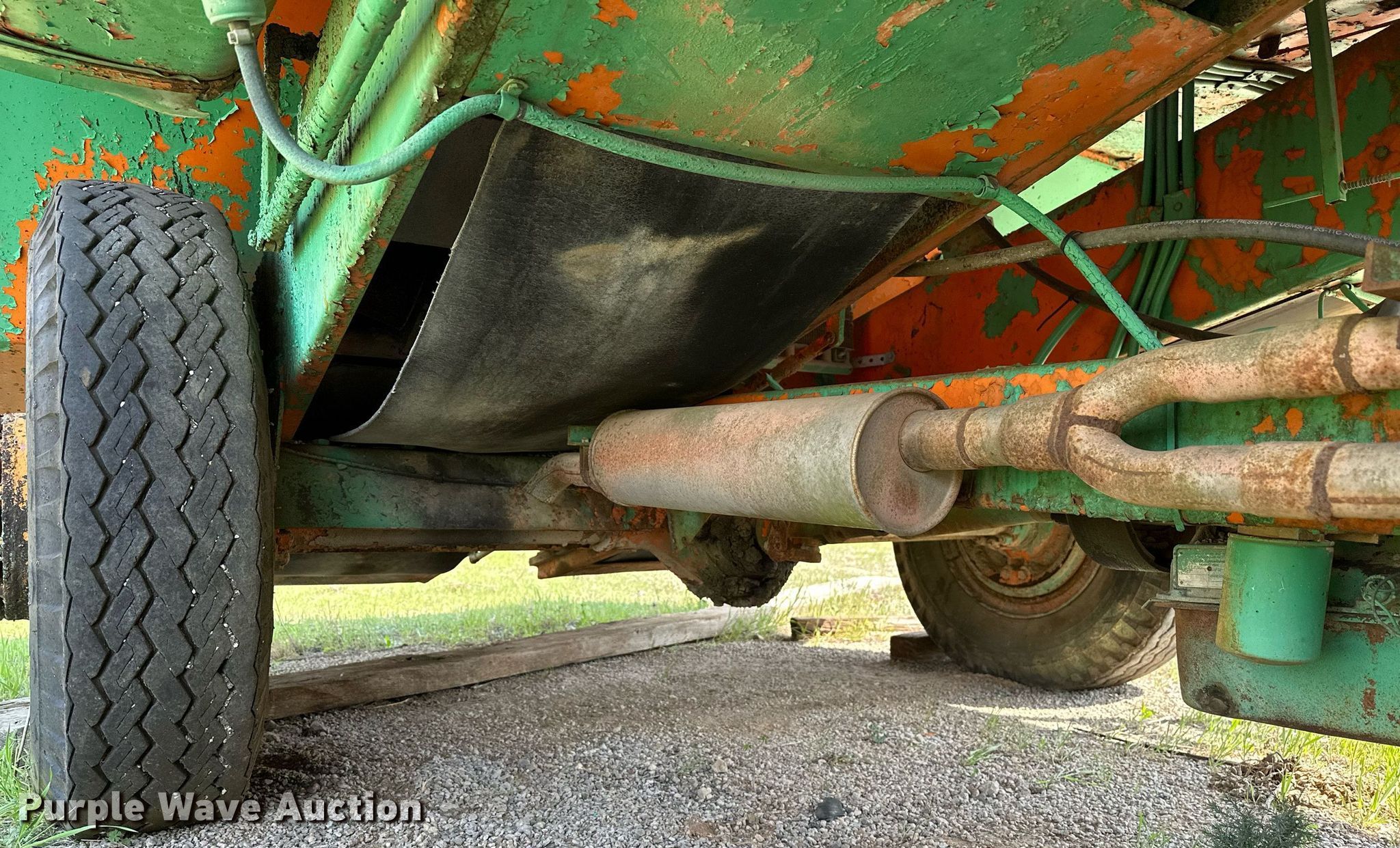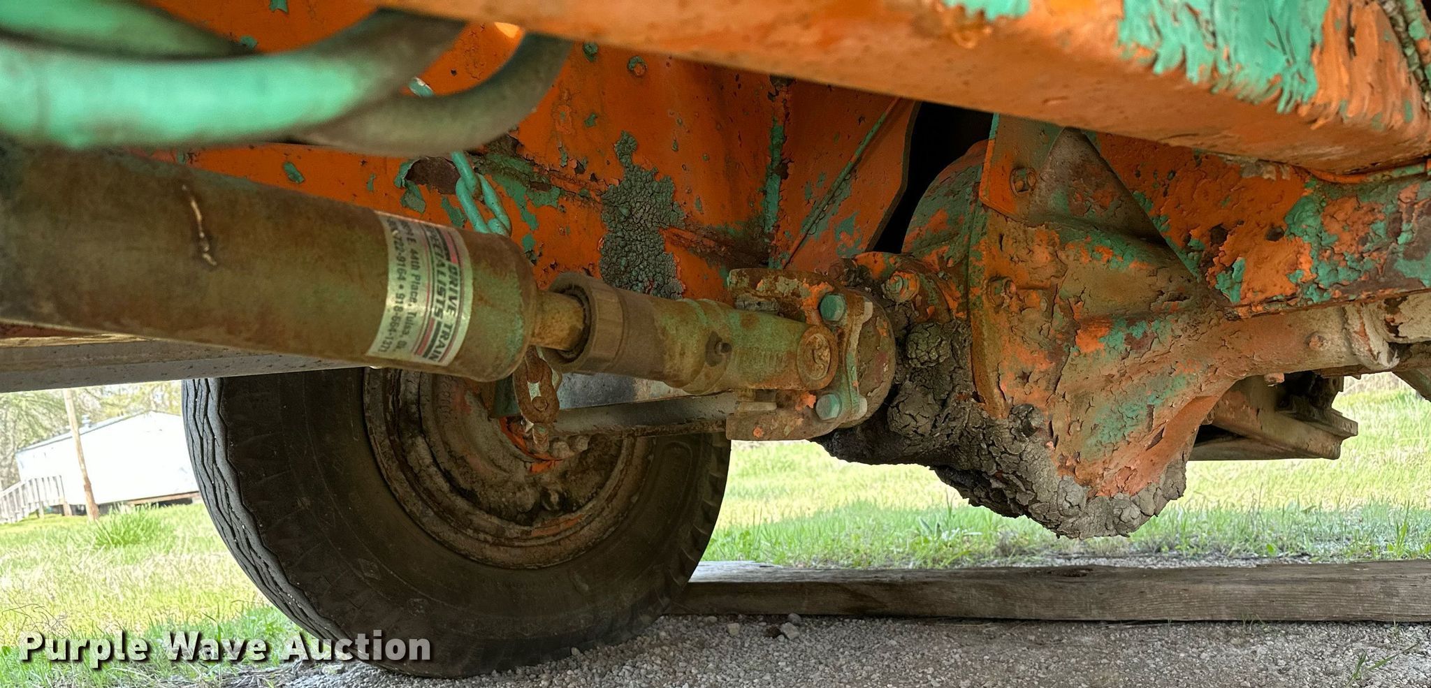Koehring K chip spreader. Serial: 2091. Engine Cylinders: 8, Fuel type: Gas. Transmission Automatic. Features Front spread hopper width: 13', Material conveyor Width: 18", Truck hitch. Tires Front: 9.00R20, Rear: 10.00-20. Notes Flat tire, Non-operational unit. 120 Third St.. Maramec, OK 74045
