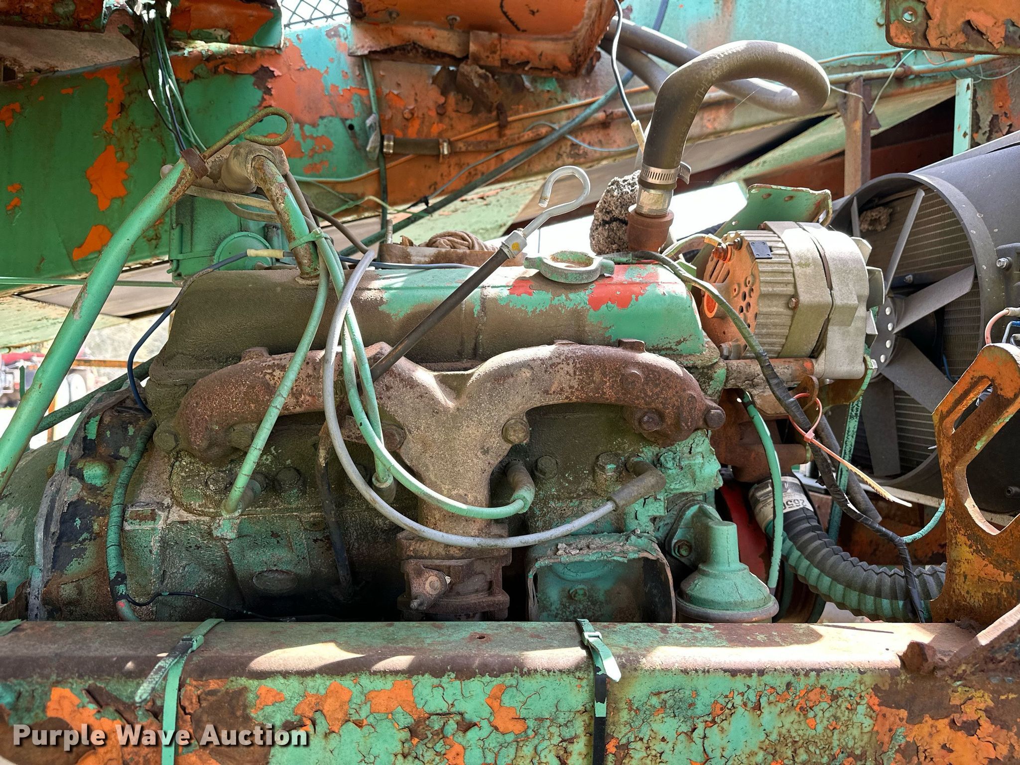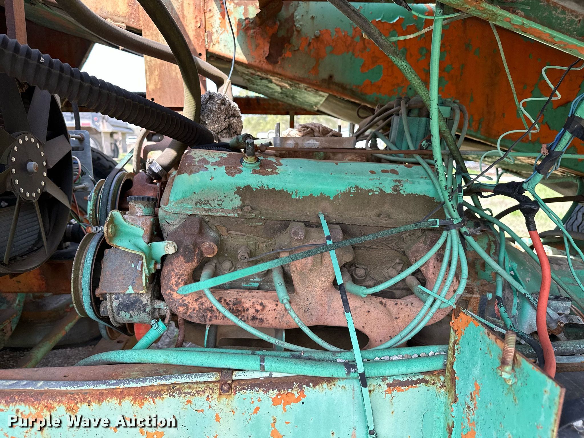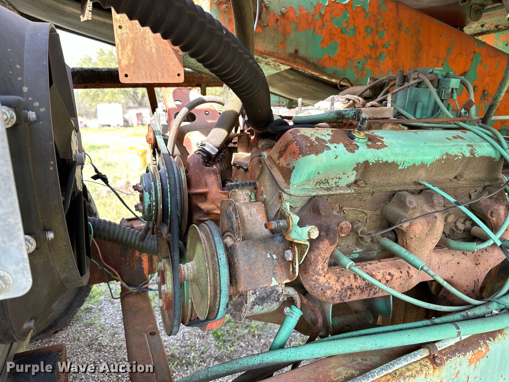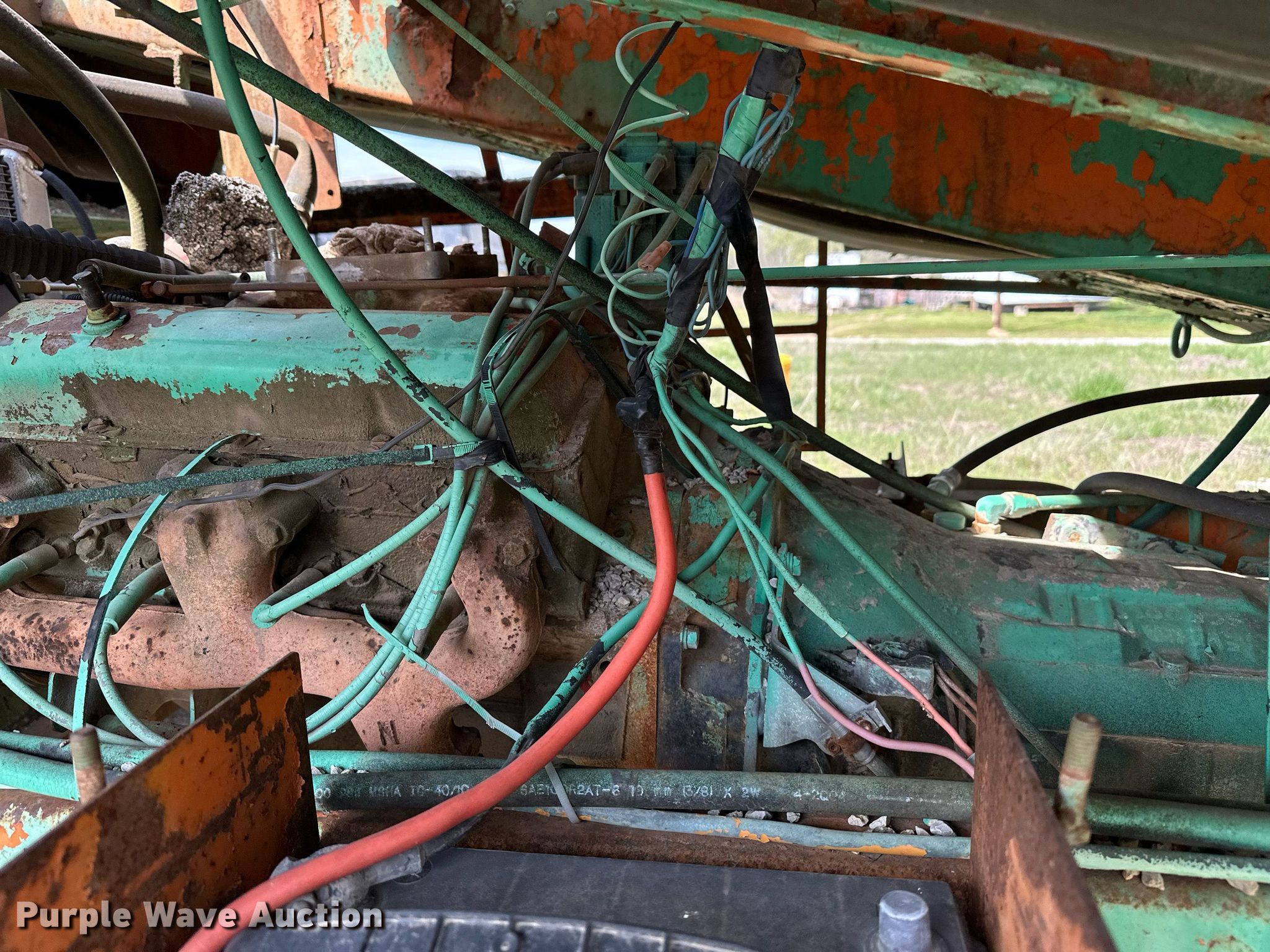 Koehring K chip spreader. Serial: 2091. Engine Cylinders: 8, Fuel type: Gas. Transmission Automatic. Features Front spread hopper width: 13', Material conveyor Width: 18", Truck hitch. Tires Front: 9.00R20, Rear: 10.00-20. Notes Flat tire, Non-operational unit. 120 Third St.. Maramec, OK 74045