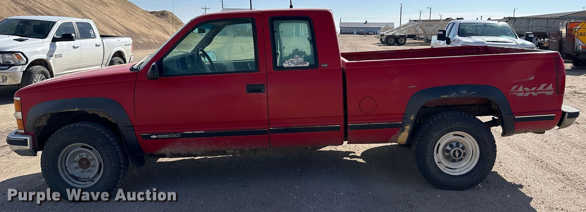 1998 Chevrolet K2500 Ext. Cab pickup truck. Miles: 221,503 on odometer, VIN: 1GCGK29R3WE204518. Engine Displacement: 5.7L V8 OHV, Cylinders: 8, Fuel type: Gas. Transmission Automatic, Four wheel drive. Interior AC, Heat, Power windows, Power locks, Cruise control. Tires Front: 235/85R16. Notes Dash warning indicator: ABS, Front interior door handles missing. Kansas title. Scott County Public Works. Scott City, KS 67871