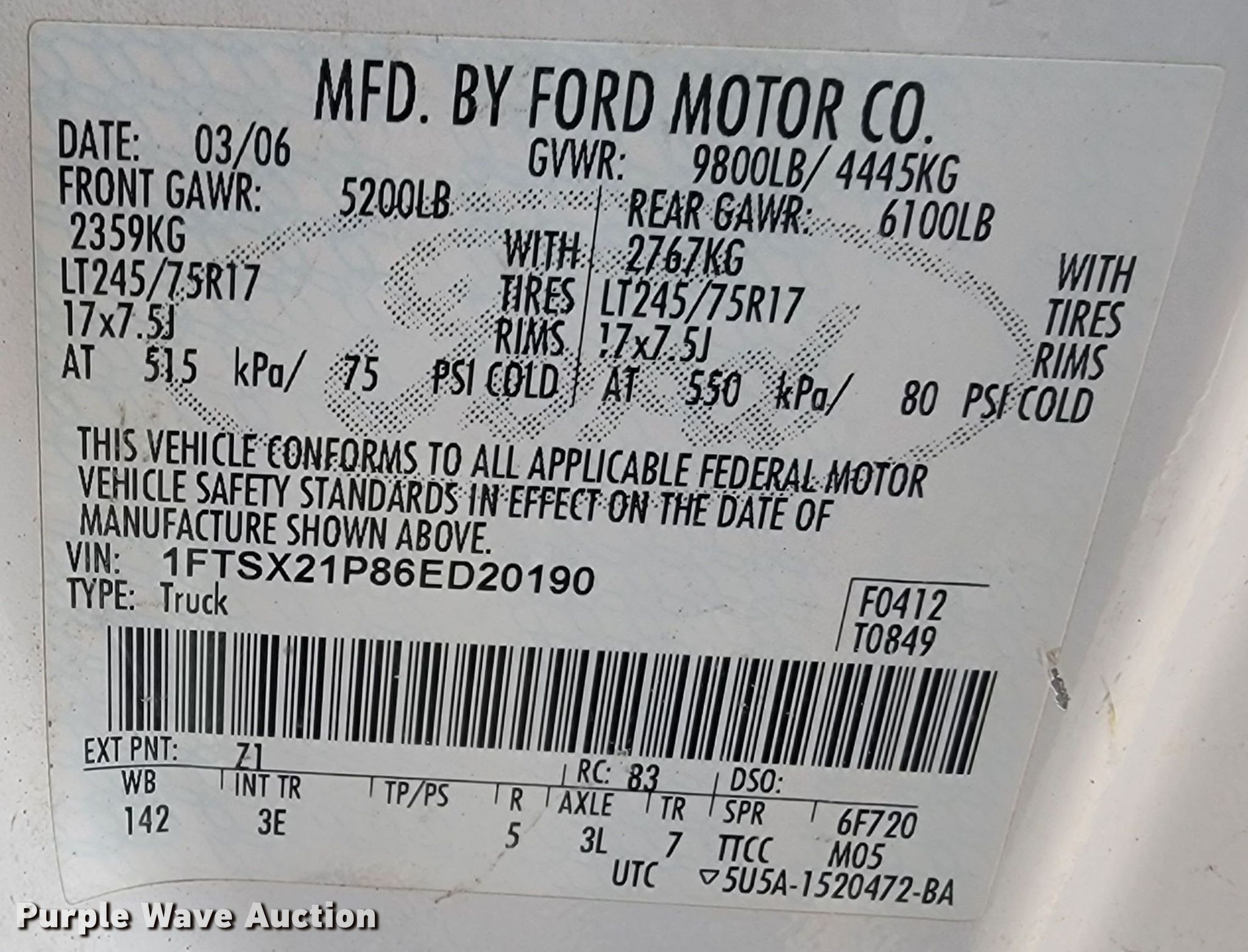 Purple Wave is selling a used 3/4 or 1 Ton Pickup or Van in Nebraska. This item is a 2006 Ford F250 Super Duty XL SuperCab pickup truck with the following: Miles: 122,785 on odometer, VIN: 1FTSX21P86ED20190