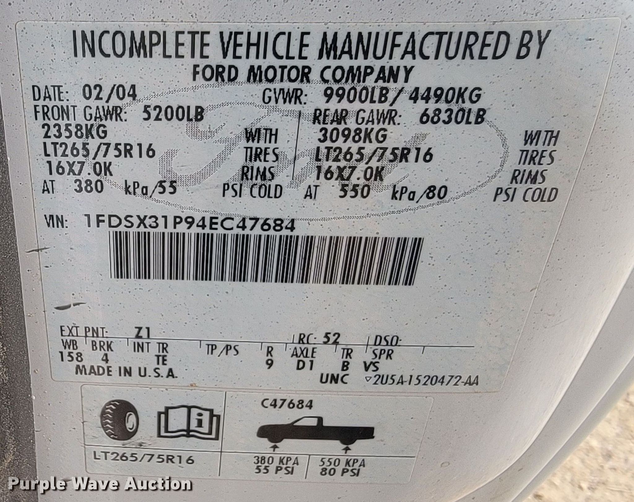 Purple Wave is selling a used 3/4 or 1 Ton Pickup or Van in Nebraska. This item is a 2004 Ford F350 Super Duty XL SuperCab pickup truck with the following: Miles: 160,298 on odometer, VIN: 1FDSX31P94EC47684